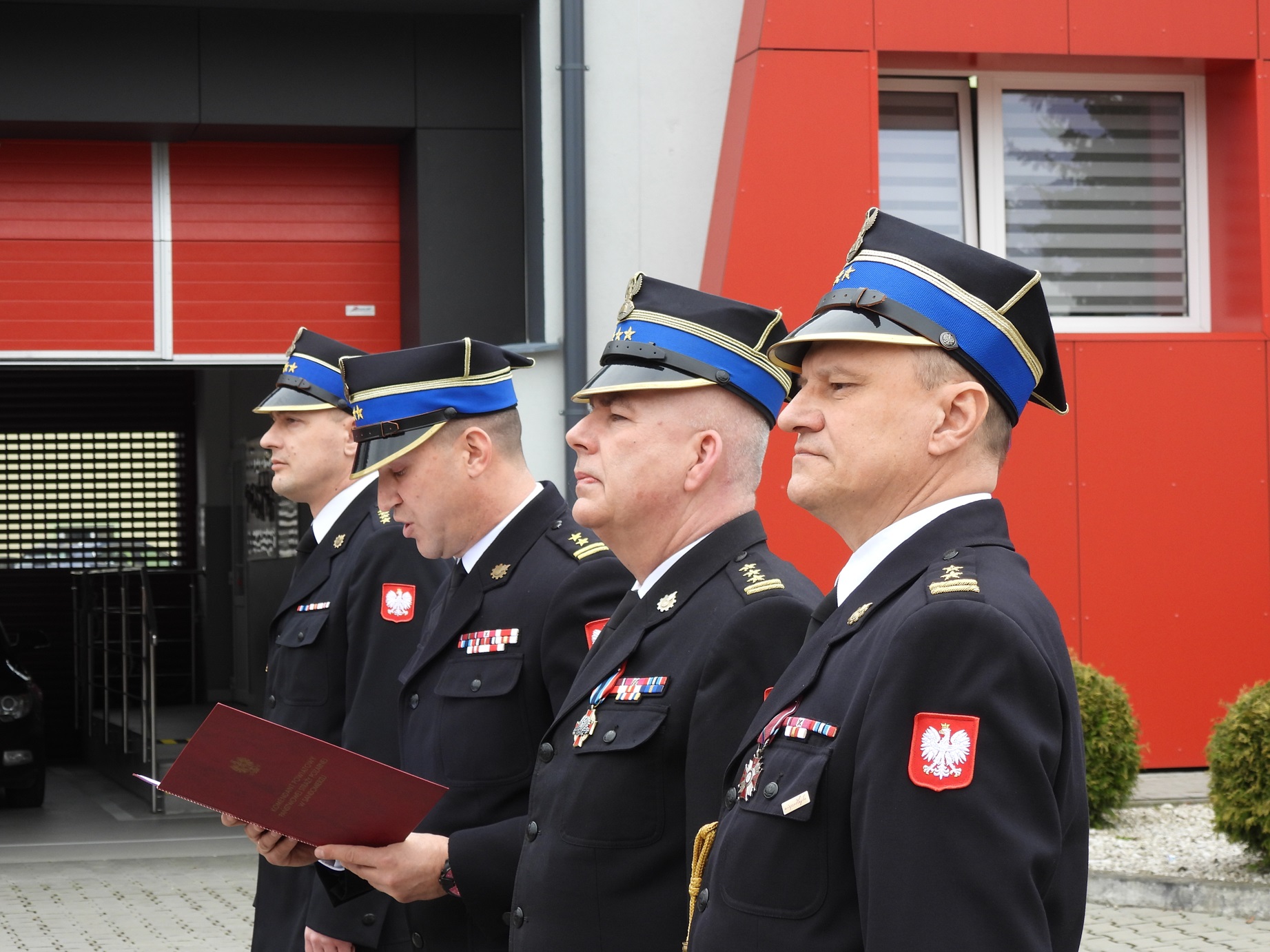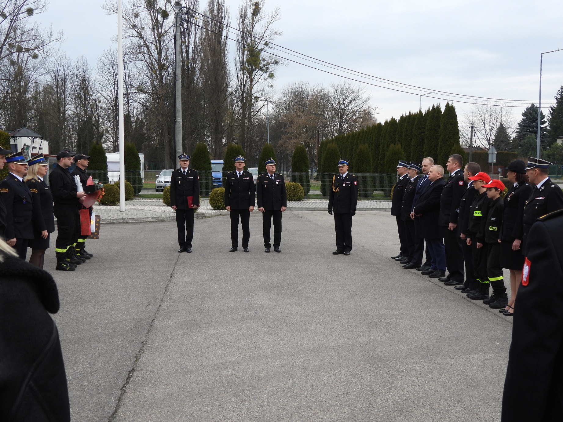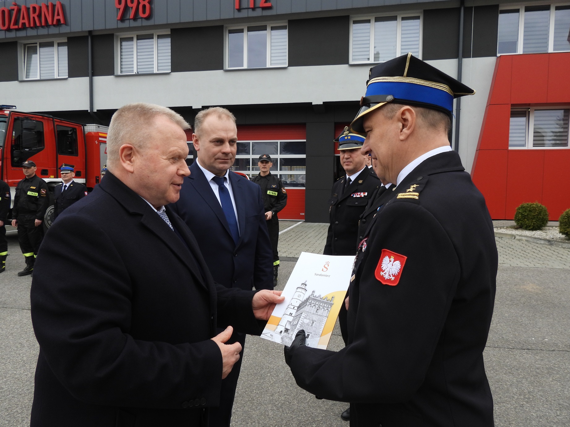 bryg. Piotr Krytusa wraz z zastępcą mł. bryg. Andrzejem Włodarczykiem, funkcjonariusze i pracownicy cywilni Komendy Powiatowej PSP w Sandomierzu, druhny i druhowie z terenu powiatu sandomierskiego oraz zaproszeni goście. Zbiórkę rozpoczął meldunek złożony Zastępcy Świętokrzyskiego Komendanta Wojewódzkiego PSP st. bryg. Marcinowi Machowskiemu przez dowódcę Jednostki Ratowniczo-Gaśniczej PSP w Sandomierzu st. kpt. Łukasza Ziębę.