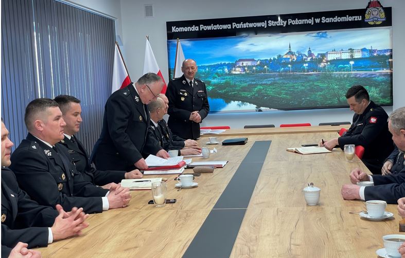 Spotkanie dotyczyło dyskusji nad relokacją uchodźców w wytypowanych remizach OSP zlokalizowanych na terenie powiatu sandomierskiego, zagrożeniu spowodowanym wypalaniem pozostałości roślinnych na polach i nieużytkach oraz sprawy bieżące.