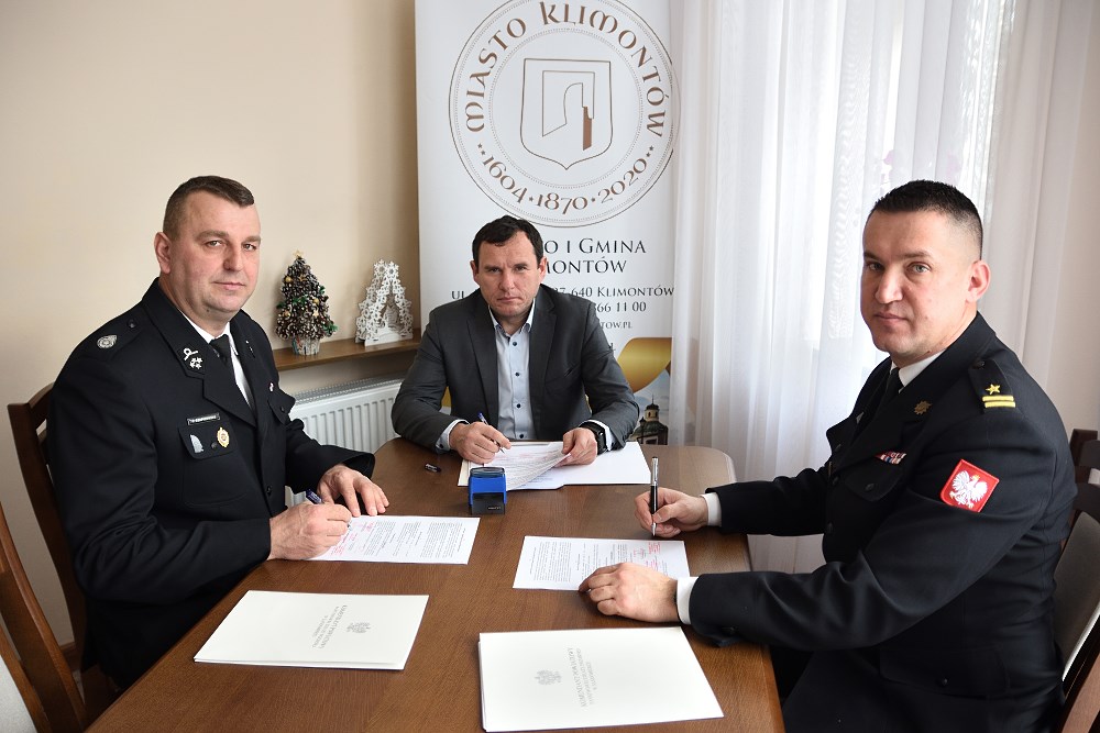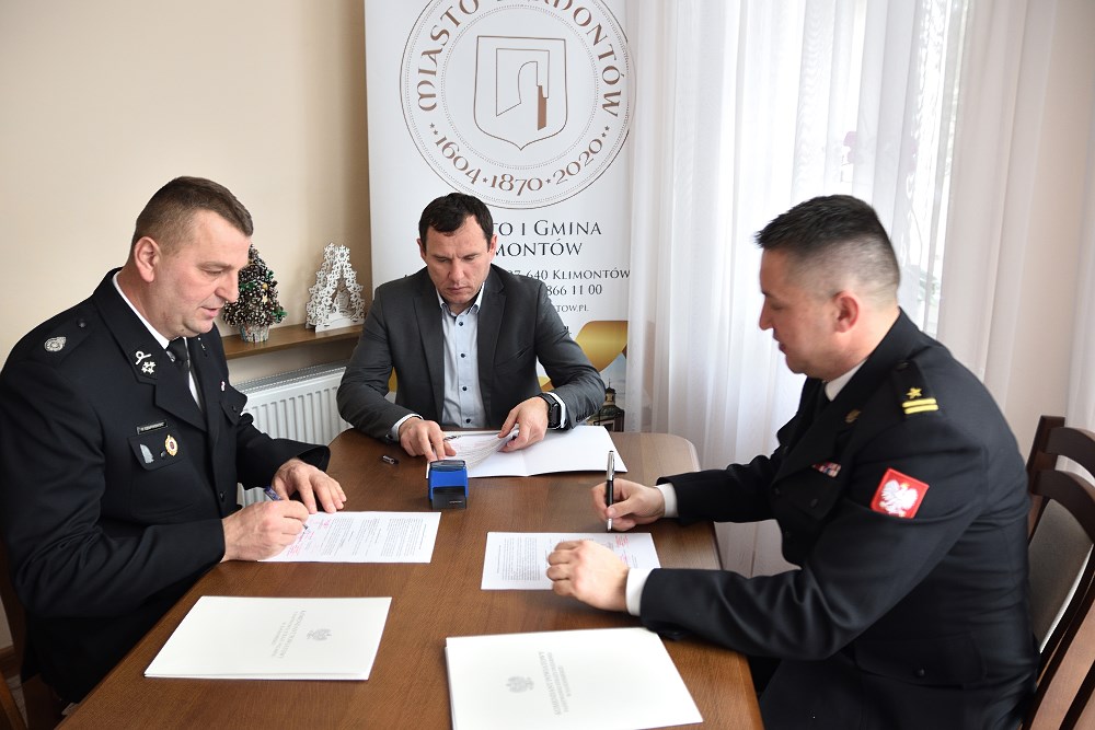Porozumienie podpisali: komendant powiatowy PSP mł. bryg. Piotr Krytusa, burmistrz miasta i gminy Klimontów pan Marek Goździewski i prezes OSP Zakrzów dh Feliks Szafirowski.