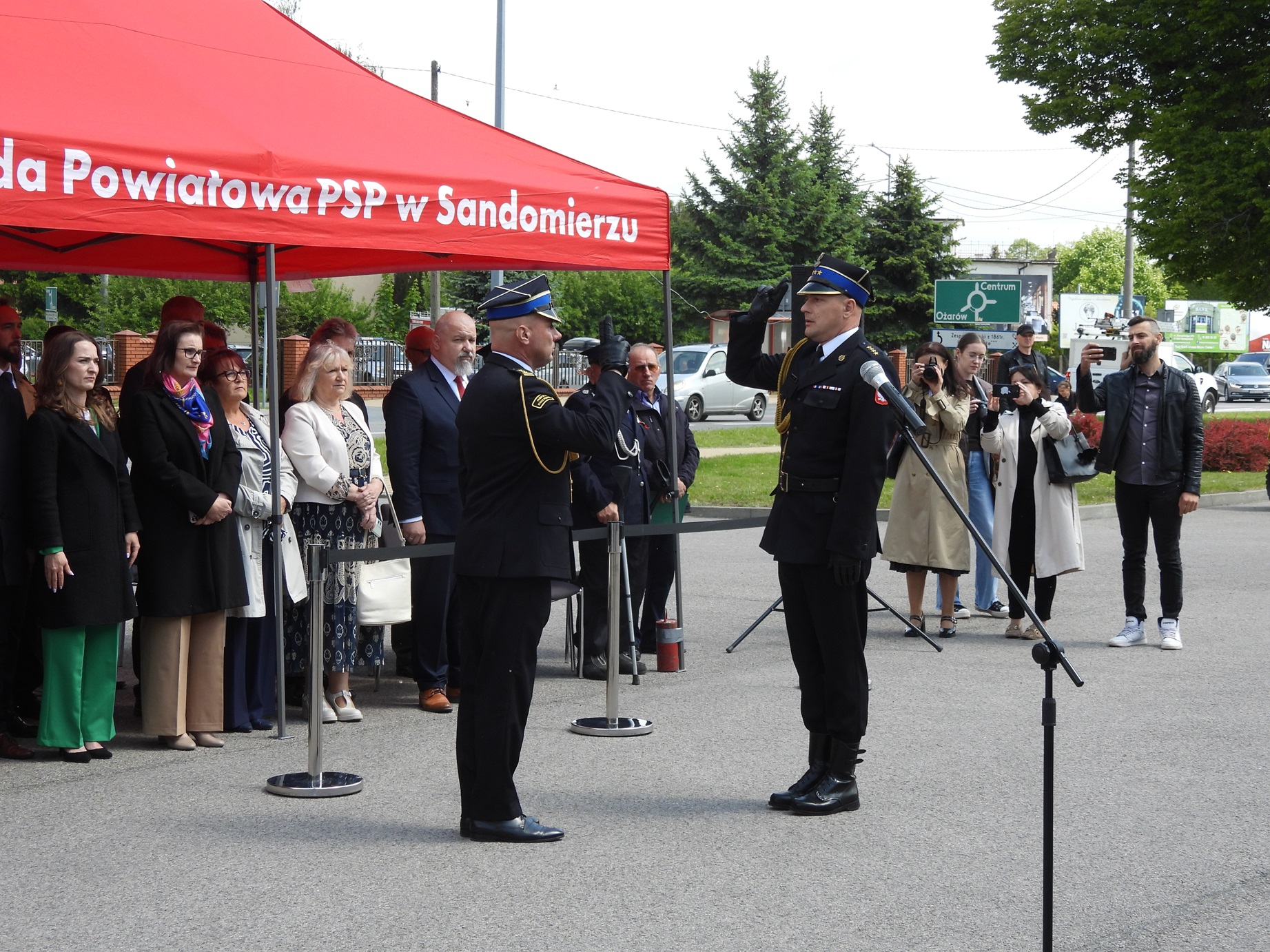 Po mszy uczestnicy przeszli na plac Komendy Powiatowej PSP, gdzie zgodnie z pożarniczym ceremoniałem odbył się uroczysty apel. Meldunek o rozpoczęciu uroczystości Zastępcy Świętokrzyskiego Komendanta Wojewódzkiego Państwowej Straży Pożarnej w Kielcach st. bryg. Grzegorzowi Rajca złożył Dowódca Uroczystości st. kpt. Łukasz Zięba. Po przeglądzie pododdziałów oraz podniesieniu na maszt flagi państwowej i odśpiewaniu hymnu państwowego wszystkich przybyłych gości powitał gospodarz wydarzenia: Komendant Powiatowy Państwowej Straży Pożarnej w Sandomierzu bryg. Piotr Krytusa.