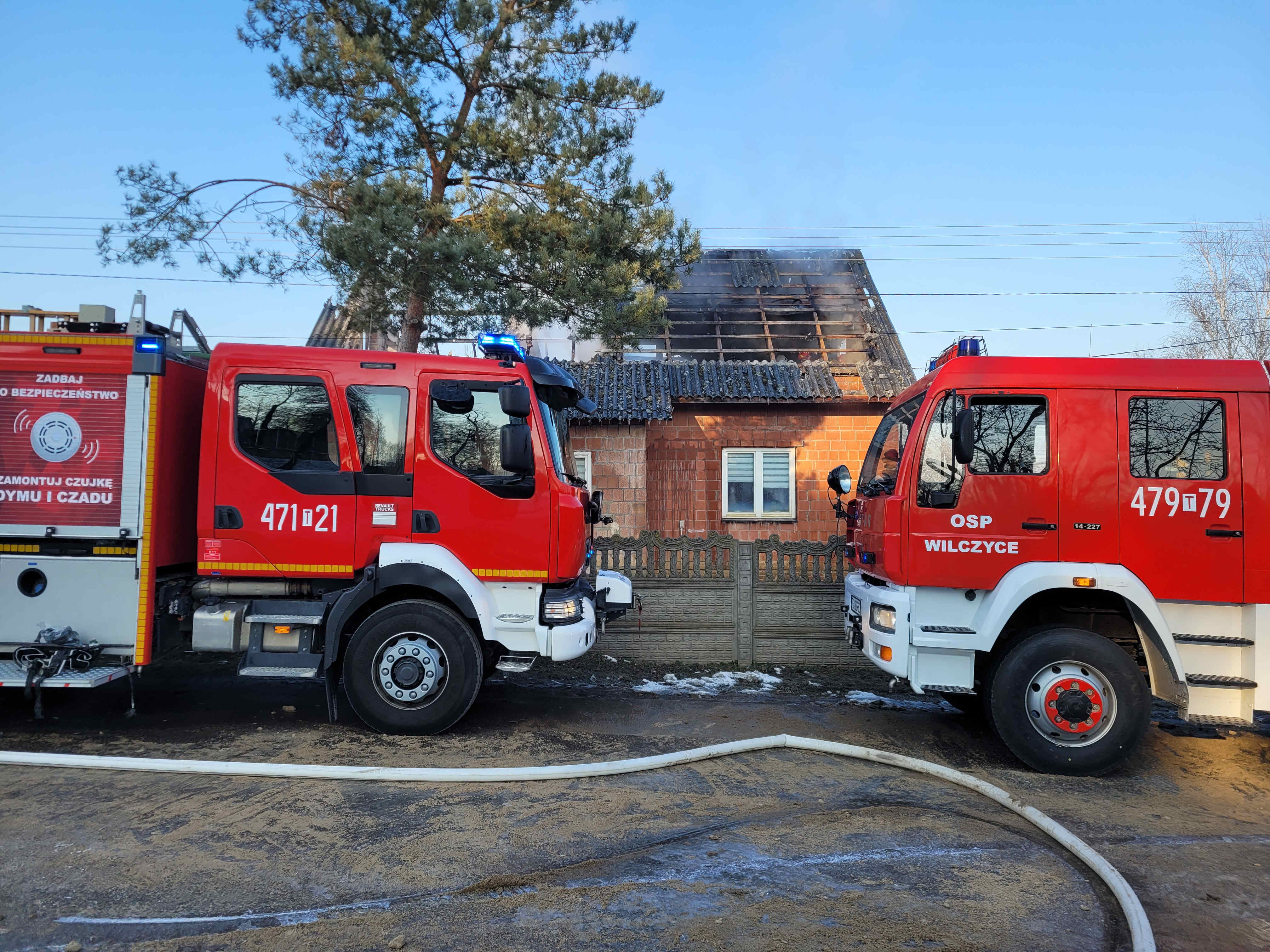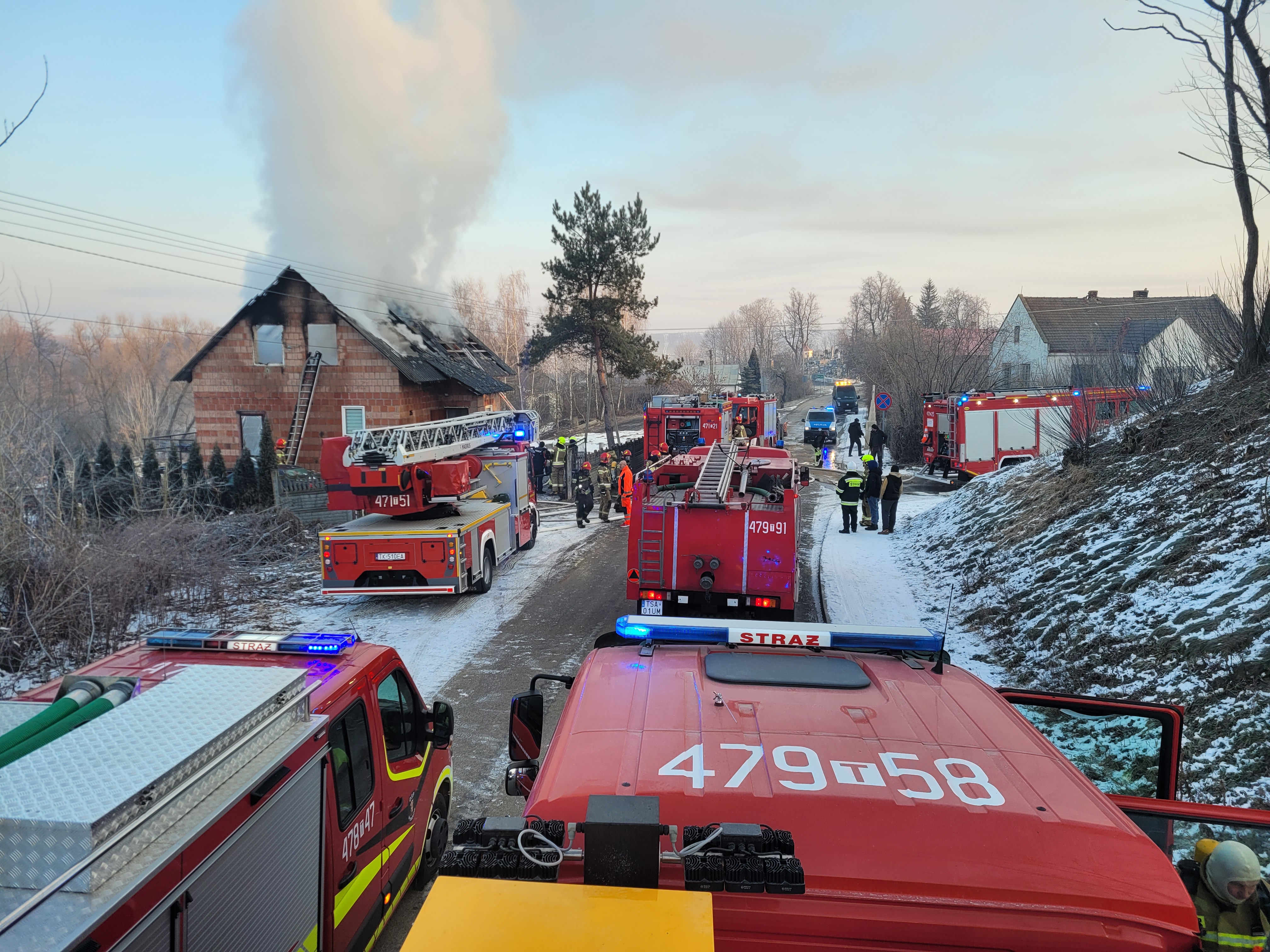 18 lutego 2025r. do Stanowiska Kierowania Komendanta Powiatowego Państwowej Straży Pożarnej w Sandomierzu wpłynęło zgłoszenie o pożarze budynku mieszkalnego w miejscowości Dacharzów. Na miejsce zdarzenia zadysponowano zastępy z Komendy Powiatowej Państwowej Straży Pożarnej w Sandomierzu i Ochotniczych Straży Pożarnych z Wilczyc, Wysiadłowa, Łukawy i Obrazowa. Po dojeździe zastępów straży pożarnej na miejsce zdarzenia i przeprowadzonym rozpoznaniu stwierdzono, że pożarem jest objęte całe poddasze i dach budynku mieszkalnego. Z pożaru przed przybyciem straży pożarnej ewakuowały się cztery osoby, którym udzielono pierwszej pomocy przedmedycznej i przekazano zespołowi ratownictwa medycznego. Działania straży pożarnej polegały na zabezpieczeniu miejsca zdarzania, podaniu trzech prądów wody w natarciu na palący dach. Jednocześnie strażacy zabezpieczeni w sprzęt ochrony układu oddechowego wraz z kamerą termowizyjną i z nawodnioną linią gaśniczą sprawdzali pomieszczenia w budynku, celem przeszukani i wykluczenia innych osób przebywających w budynku. Pomimo szybkiej i sprawnej akcji gaśniczej nie udało się uratować życia starszej kobiety. Dalsze działania strażaków polegały na sprawdzeniu kamerą termowizyjną całego obiektu , pogorzeliska i dogaszeniu pojedynczych zarzewi ognia.