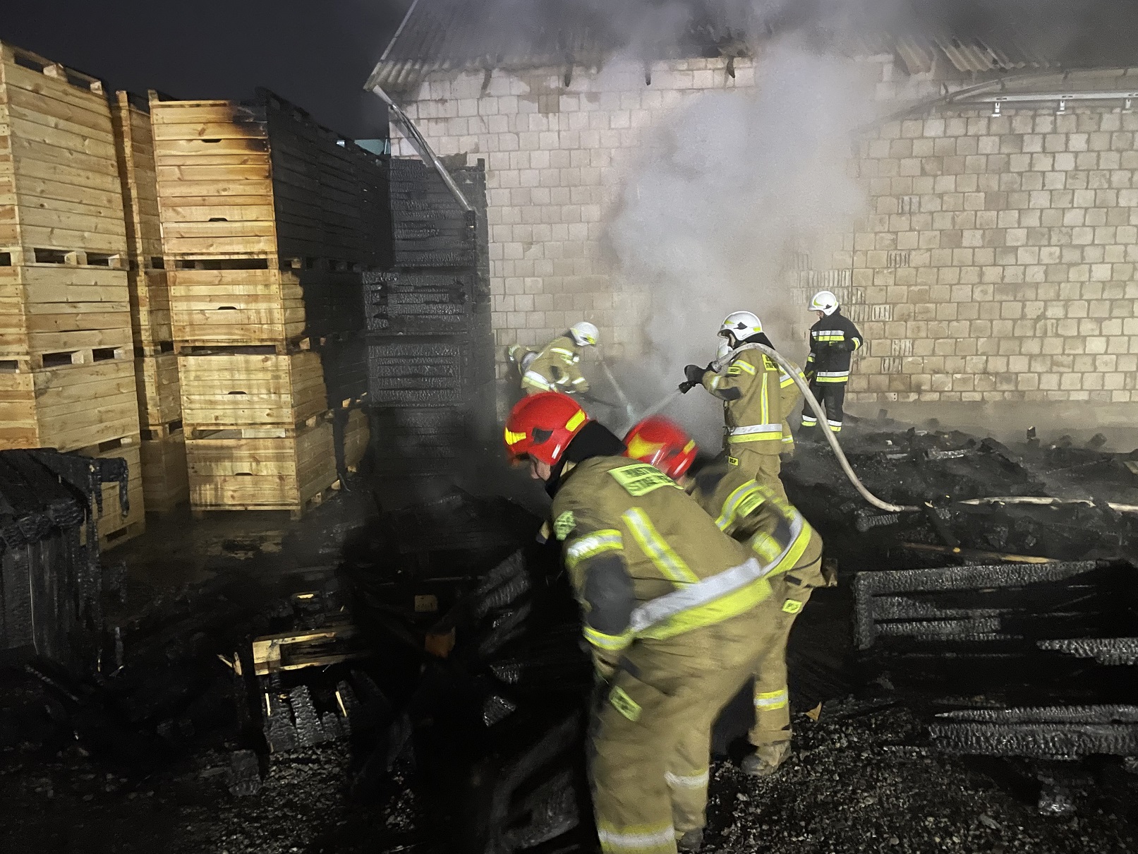 Po dojeździe na miejsce zdarzenia ustalono, że pali się sterta drewnianych skrzyń w ilości ok 200 sztuk znajdujących się tuż przy budynku chłodni. W chwili dojazdu cała sterta objęta była pożarem. Ogień objął również drzwi oraz część konstrukcji dachu pobliskiej chłodni.