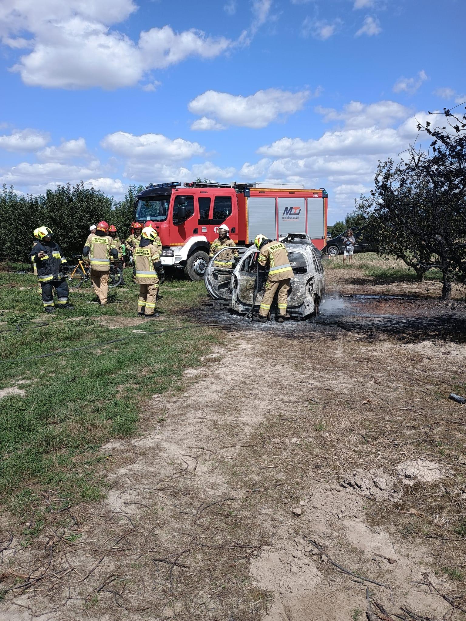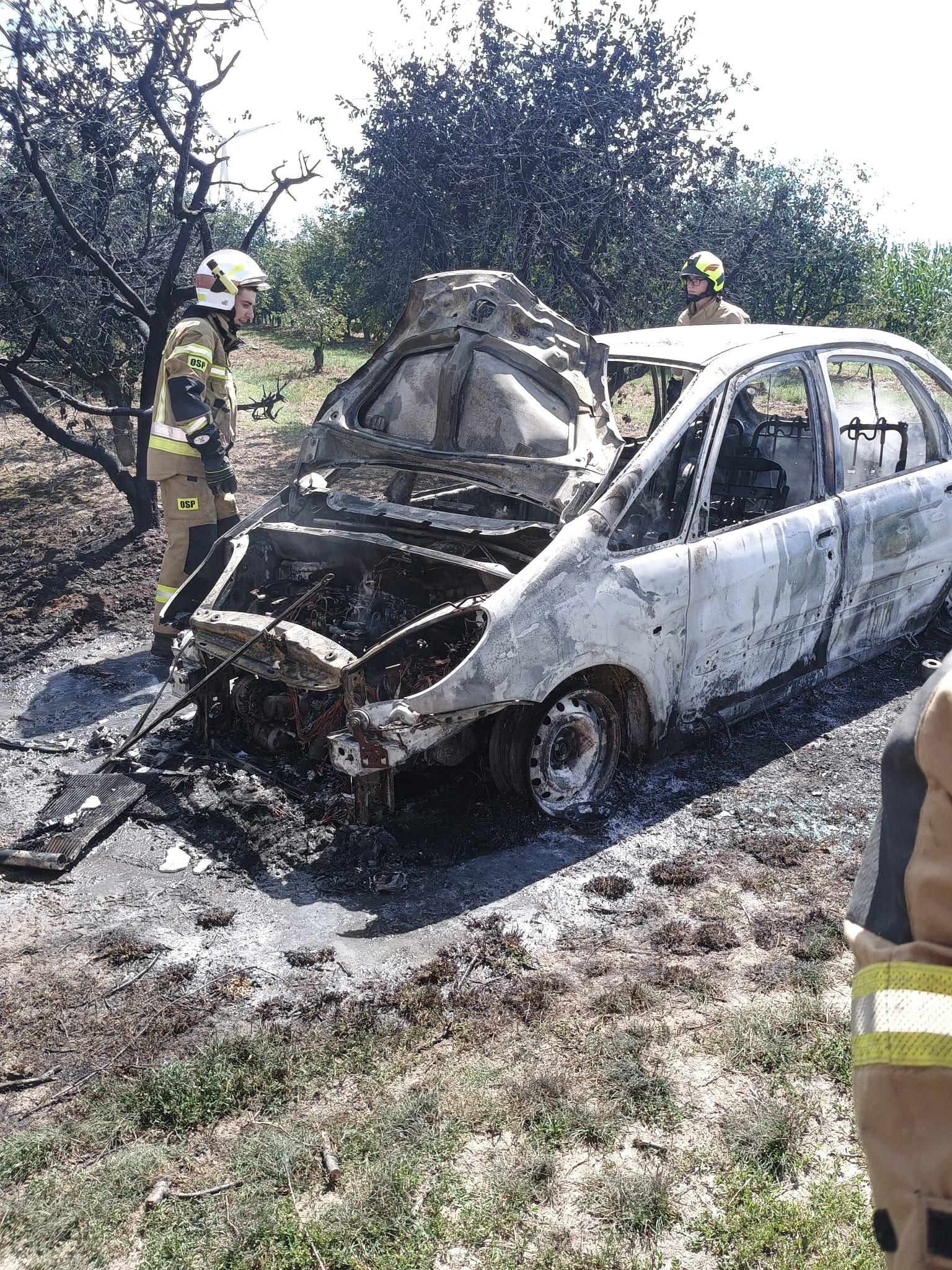 Po dojeździe zastępów Straży Pożarnej stwierdzono, że pali się auto osobowe marki Citroen w pobliskim sadzie. Działania polegały na zabezpieczeniu miejsca zdarzenia oraz podaniu dwóch prądów wody, na palący się samochód. Przed przyjazdem zastępów JOP właściciel pojazdu podjął próbę samodzielnego ugaszenia pożaru w trakcie której doznał poparzeń dłoni i został zabrany przez zastęp ratownictwa medycznego do szpitala. Po likwidacji pożaru samochód sprawdzono urządzeniami pomiarowymi które wykazały - brak zagrożeń.