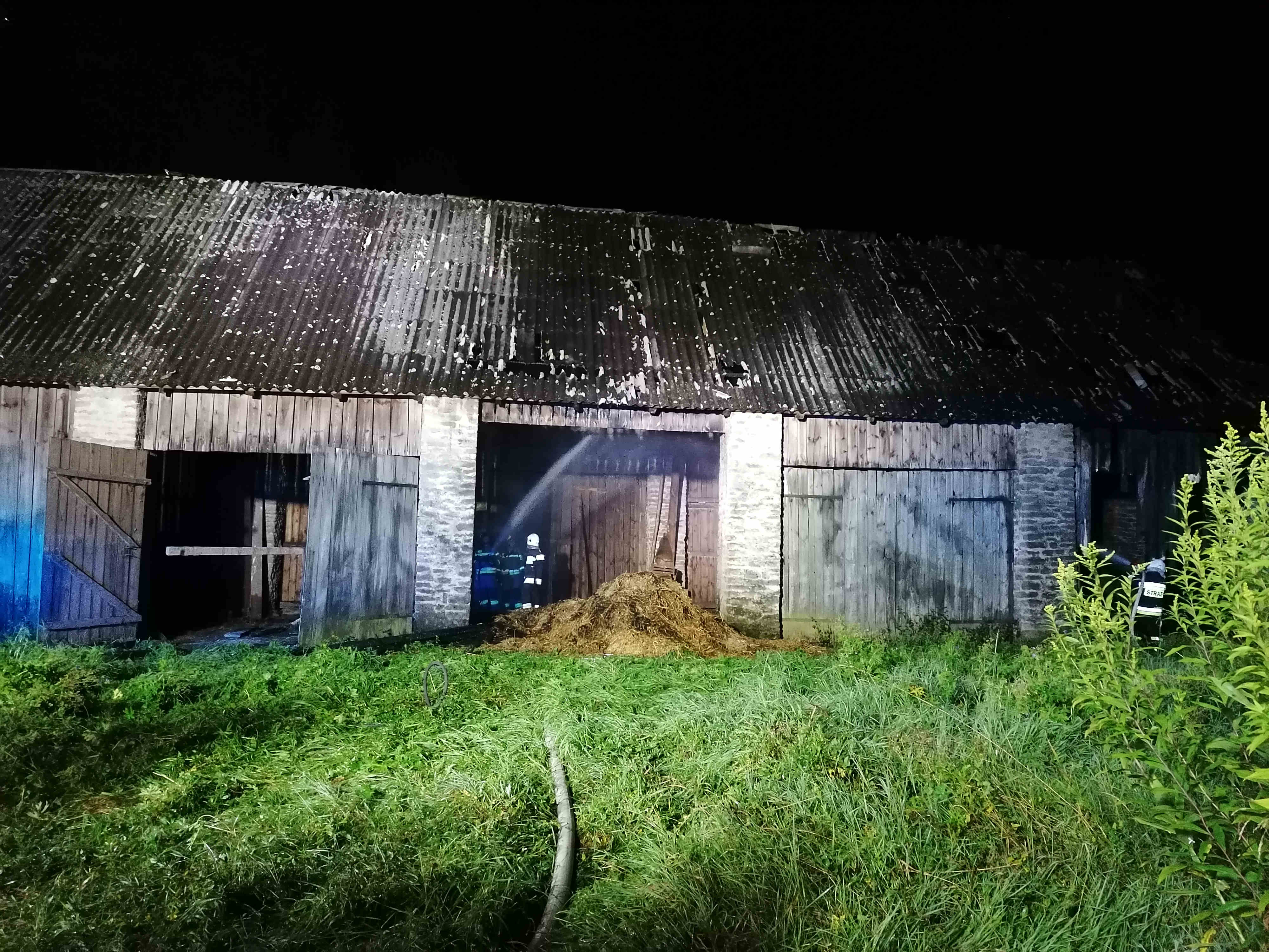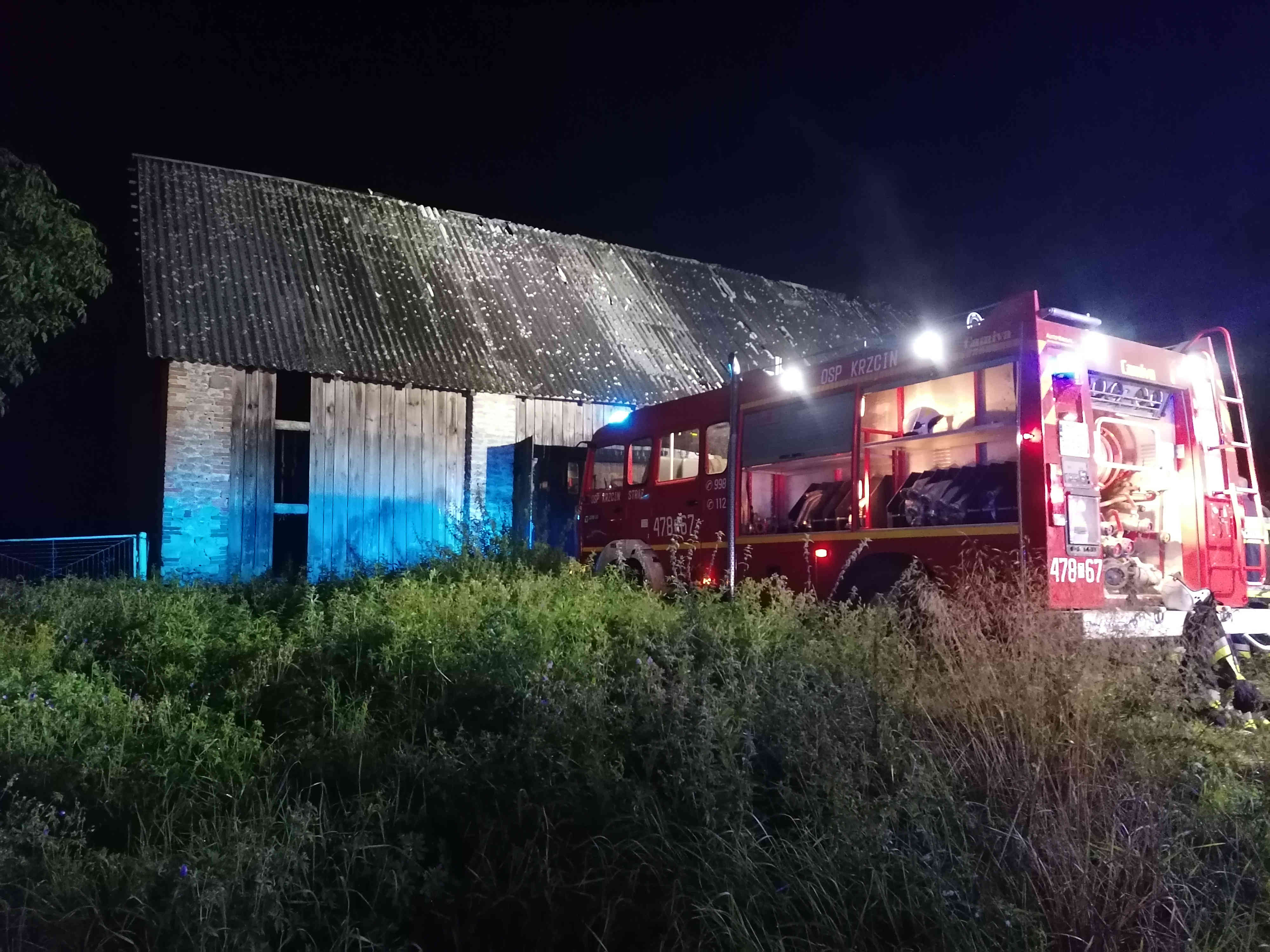 Po przyjeździe zastępów straży pożarnej na miejsce zdarzenia i przeprowadzonym rozpoznaniu ustalono, że pali się budynek gospodarczy stodoły. Działania strażaków polegały na zabezpieczeniu miejsca zdarzenia oraz podaniu trzech prądów wody w natarciu na palący się budynek. Jednocześnie strażacy zabezpieczeni w sprzęt ochrony układu oddechowego przeszukali budynek gdzie nikogo nie znaleziono. Dalsze działania polegały na częściowych pracach rozbiórkowych nadpalonej konstrukcji dachu oraz wynoszeniu na zewnątrz spalonych elementów wyposażenia, które zostały ponownie przelane wodą.