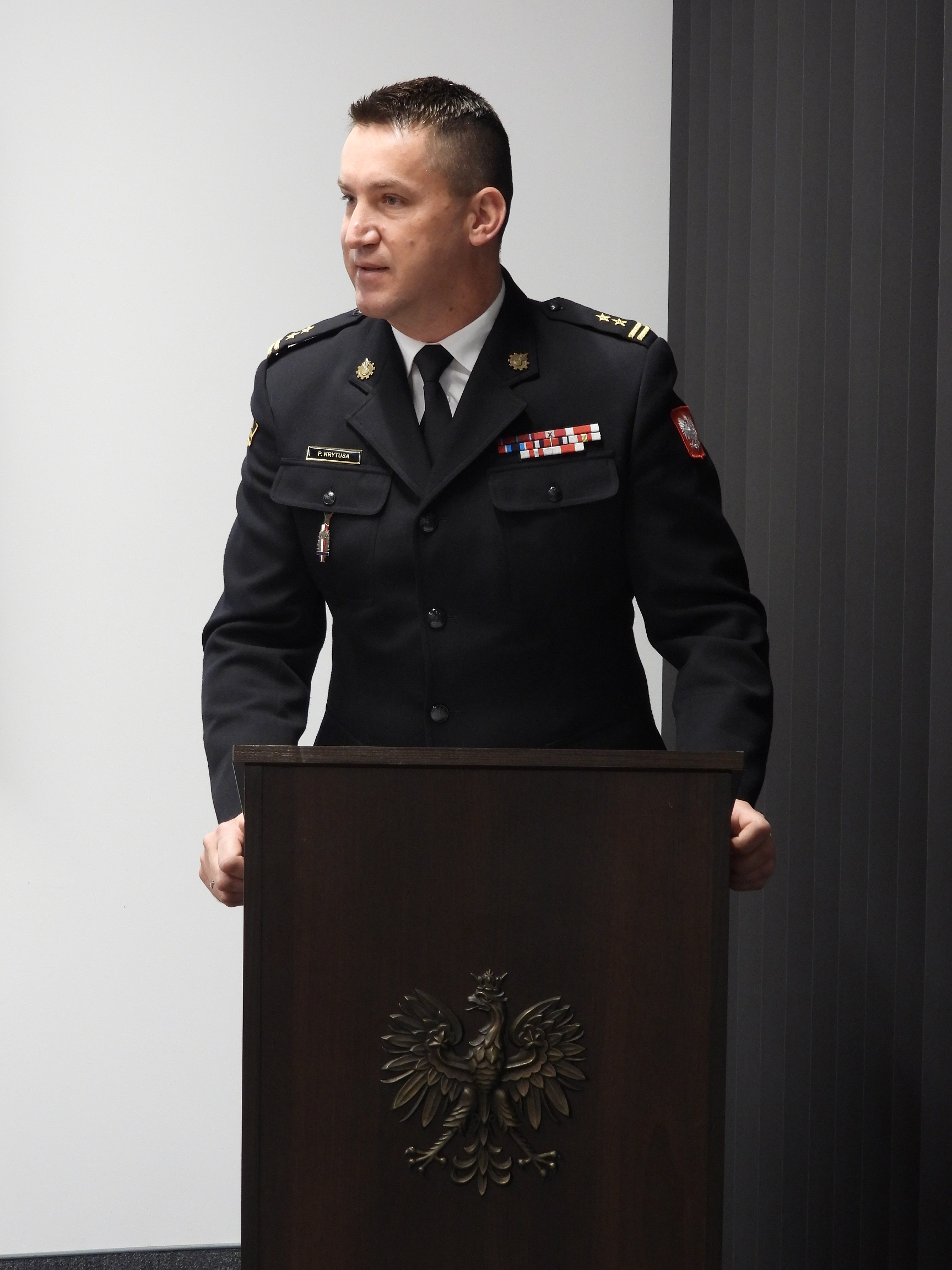 Odchodzący na emeryturę kierownik sekcji kwatermistrzowsko-technicznej mł. bryg. Grzegorz Niklewicz podsumował swoją służbę w Państwowej Straży Pożarnej dziękując rodzinie, przełożonym, koleżankom oraz kolegom za wspólnie spędzone lata.