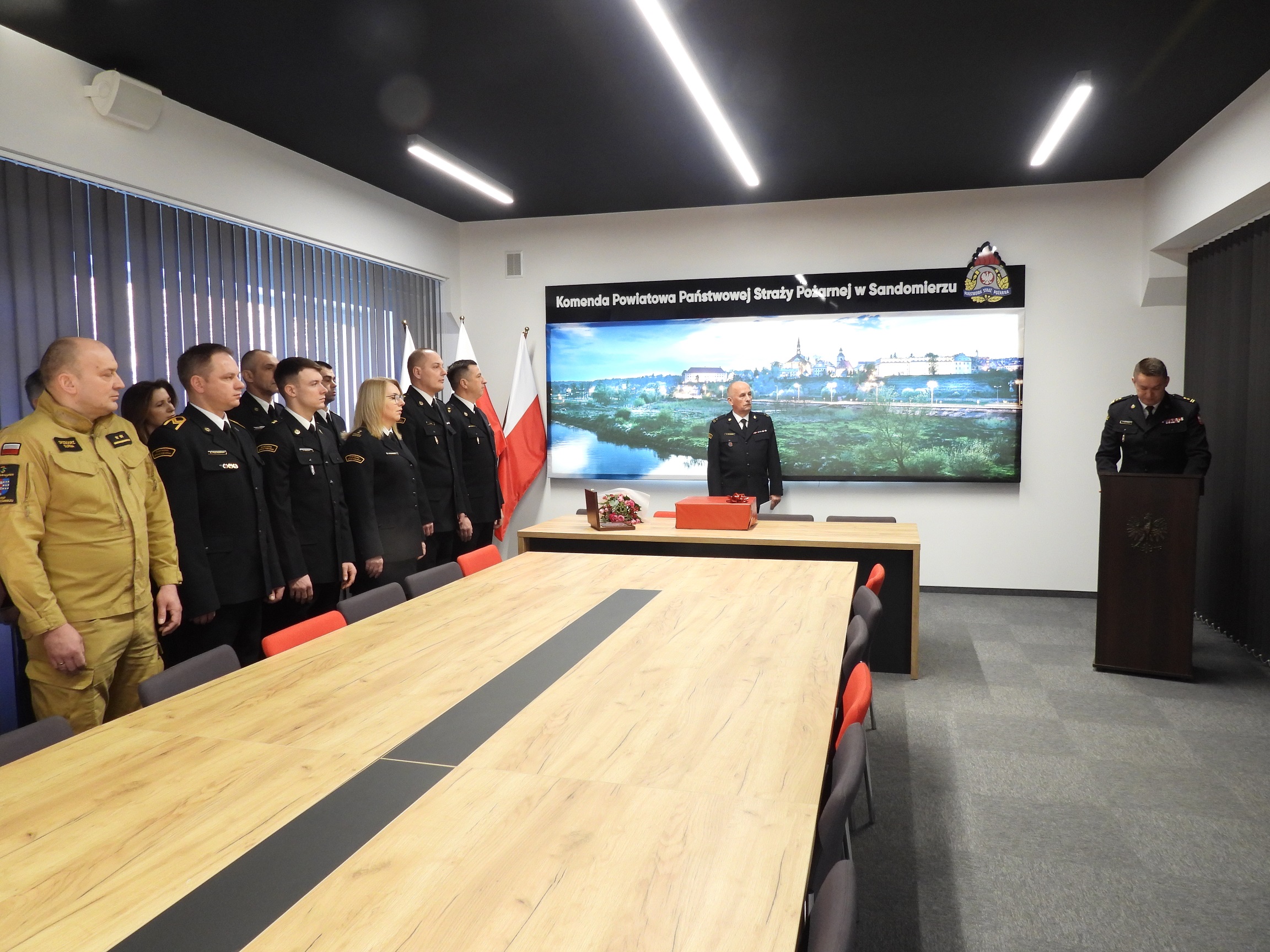 Kolejnym punktem uroczystości było odczytanie decyzji o zwolnienie ze służby, następnie Komendant Powiatowy PSP w Sandomierzu podziękował odchodzącemu na zaopatrzenie emerytalne za kompetencje, poświęcenie, wielkie oddanie służbie na rzecz ochrony przeciwpożarowej i życzył mu zdrowia, pomyślności oraz spełnienia wszystkich niezrealizowanych pasji i planów. Do życzeń dołączyli się wszyscy obecni na uroczystej zbiórce.