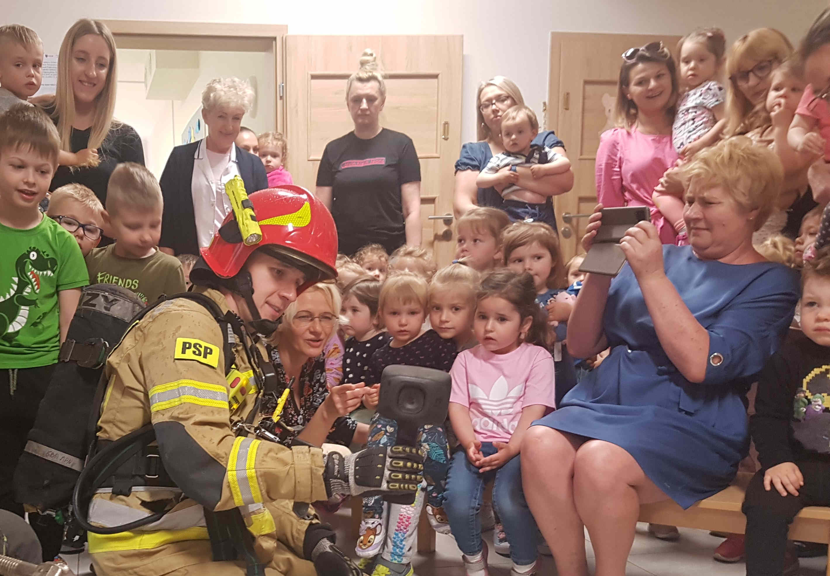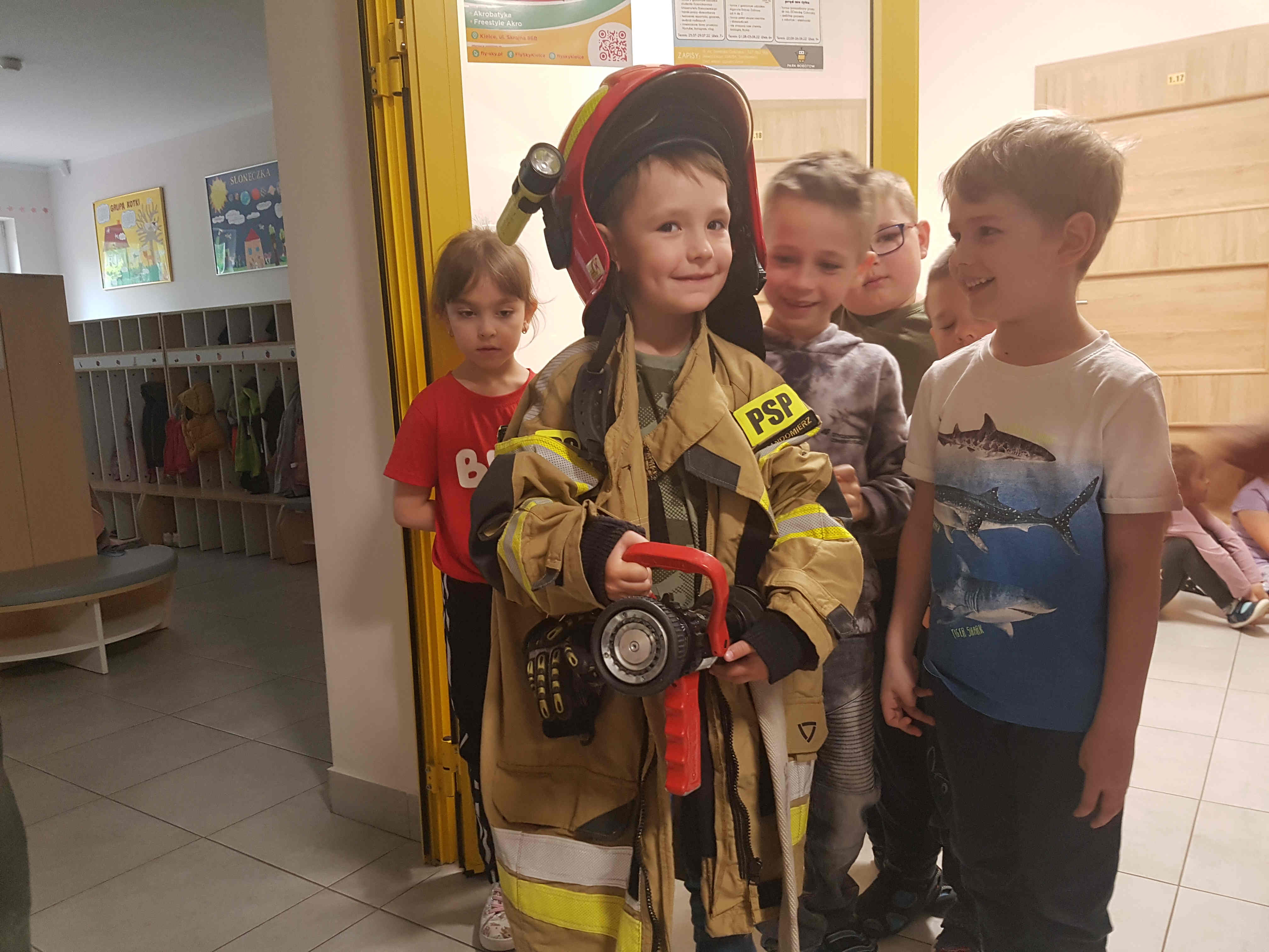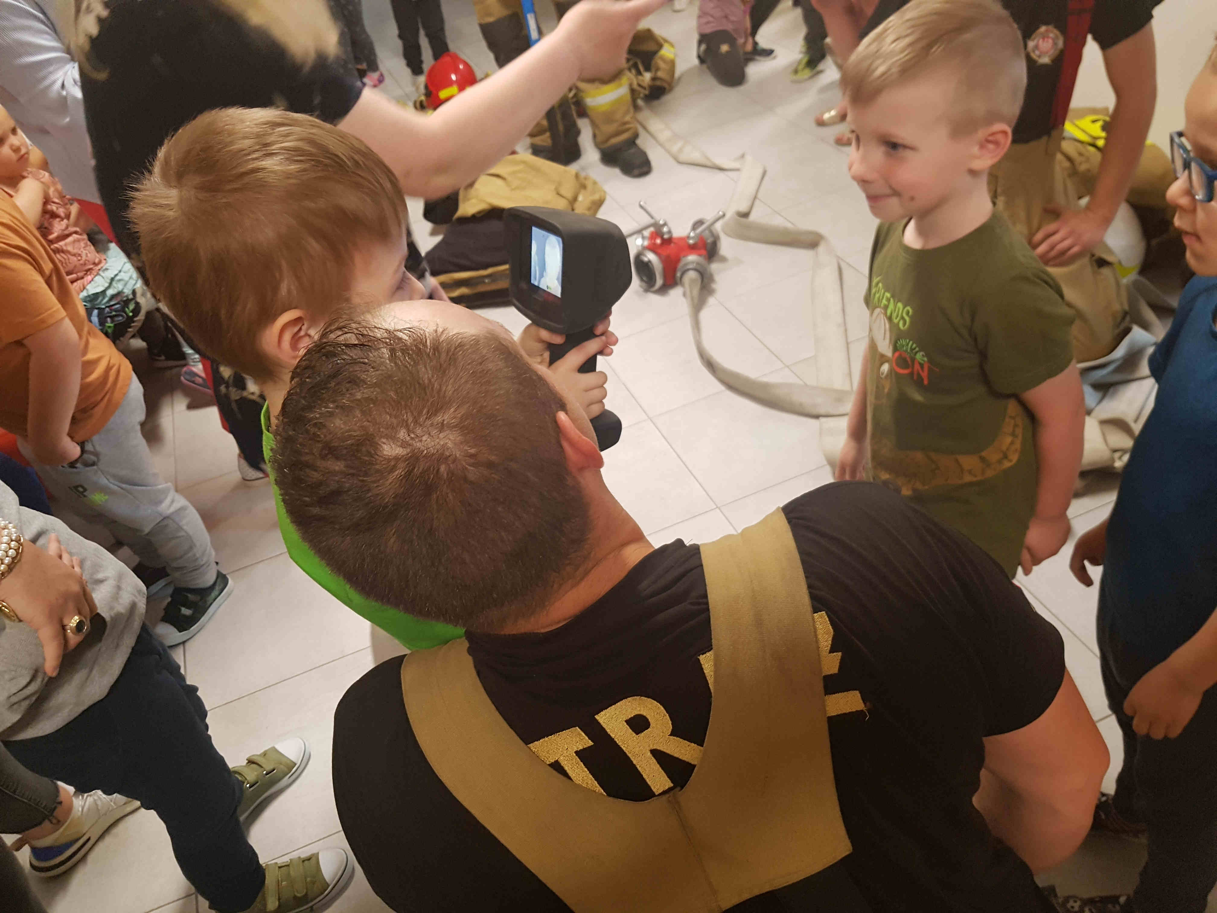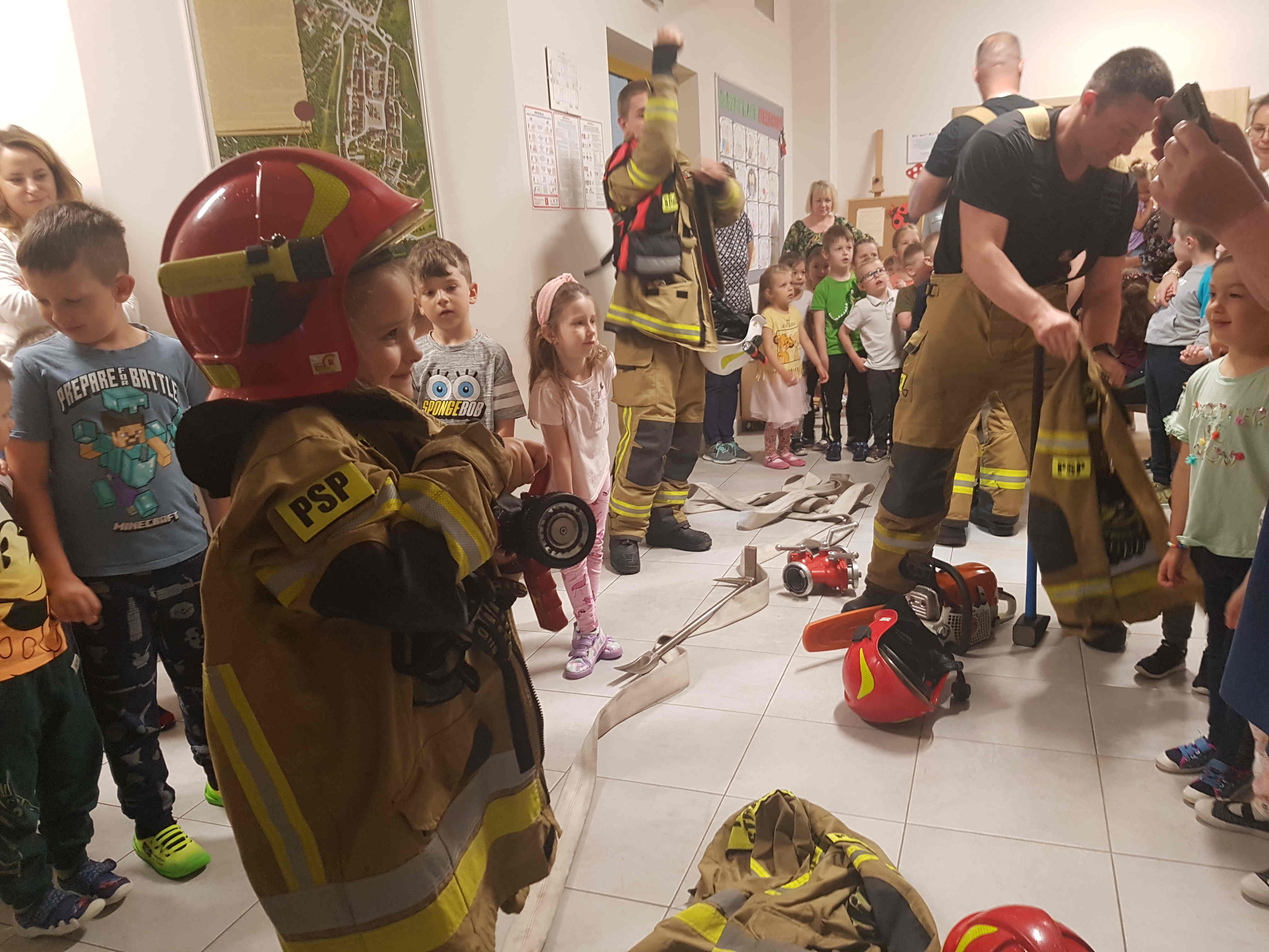 Przez chwilę wszystkie dzieci mogły poczuć się jak strażacy, przymierzając hełm strażacki, umundurowanie oraz z bliska obejrzeć i zapoznać się ze sprzętem, jakim dysponują podczas swojej pracy strażacy.