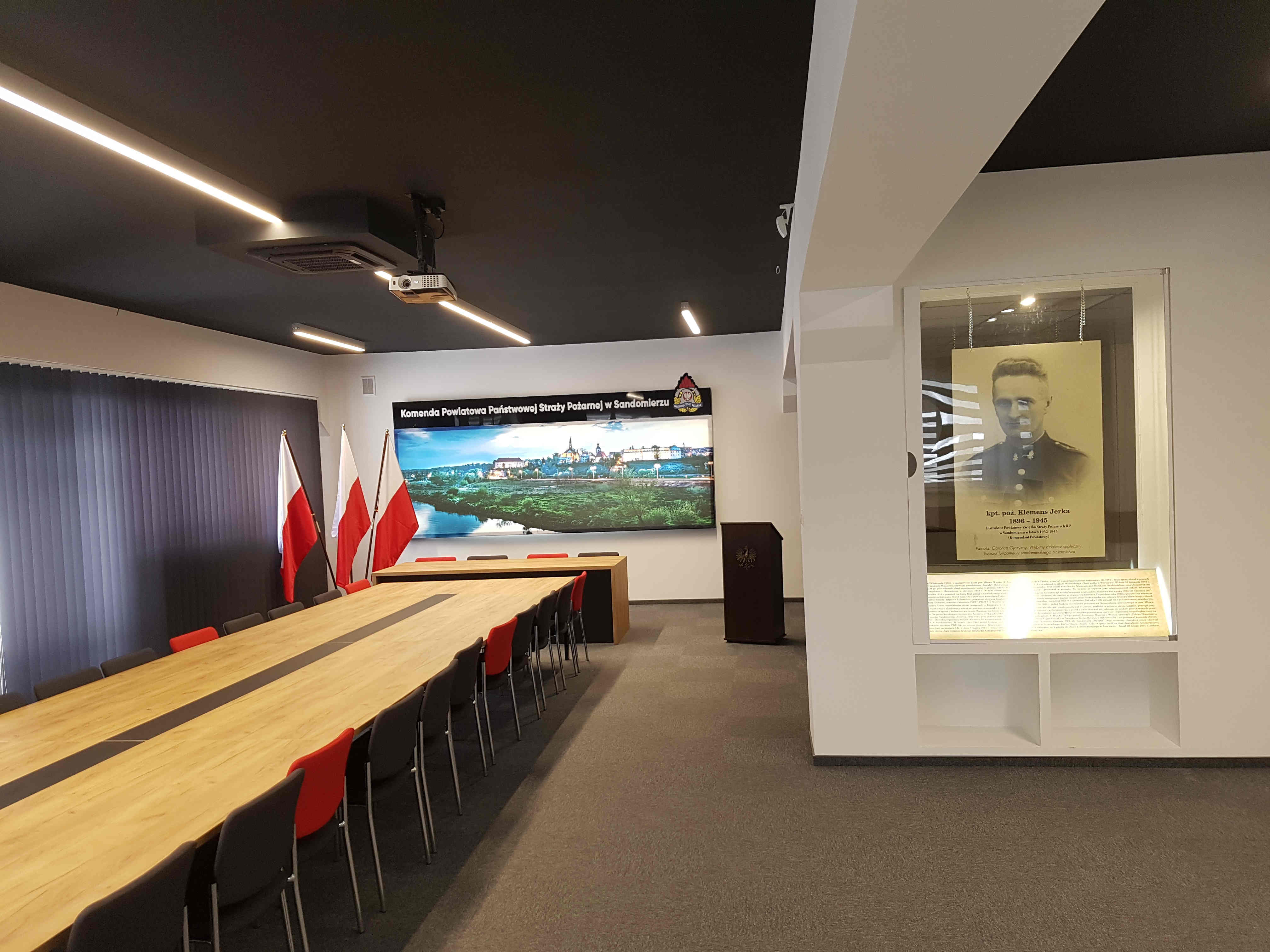 Kolejnym punktem uroczystości było oddanie zmodernizowanych sal konferencyjno-szkoleniowych w sandomierskiej komendzie. Sale zostały zmodernizowane w 2020 roku w ramach Funduszu Wsparcia i będą służyły m.in. do doskonalenia zawodowego funkcjonariuszy Państwowej Straży Pożarnej a także szkoleń Ochotniczych Straży Pożarnych powiatu sandomierskiego. Sale będą wykorzystywane też do narad, odpraw bądź prac sztabu w ramach zarządzania kryzysowego.