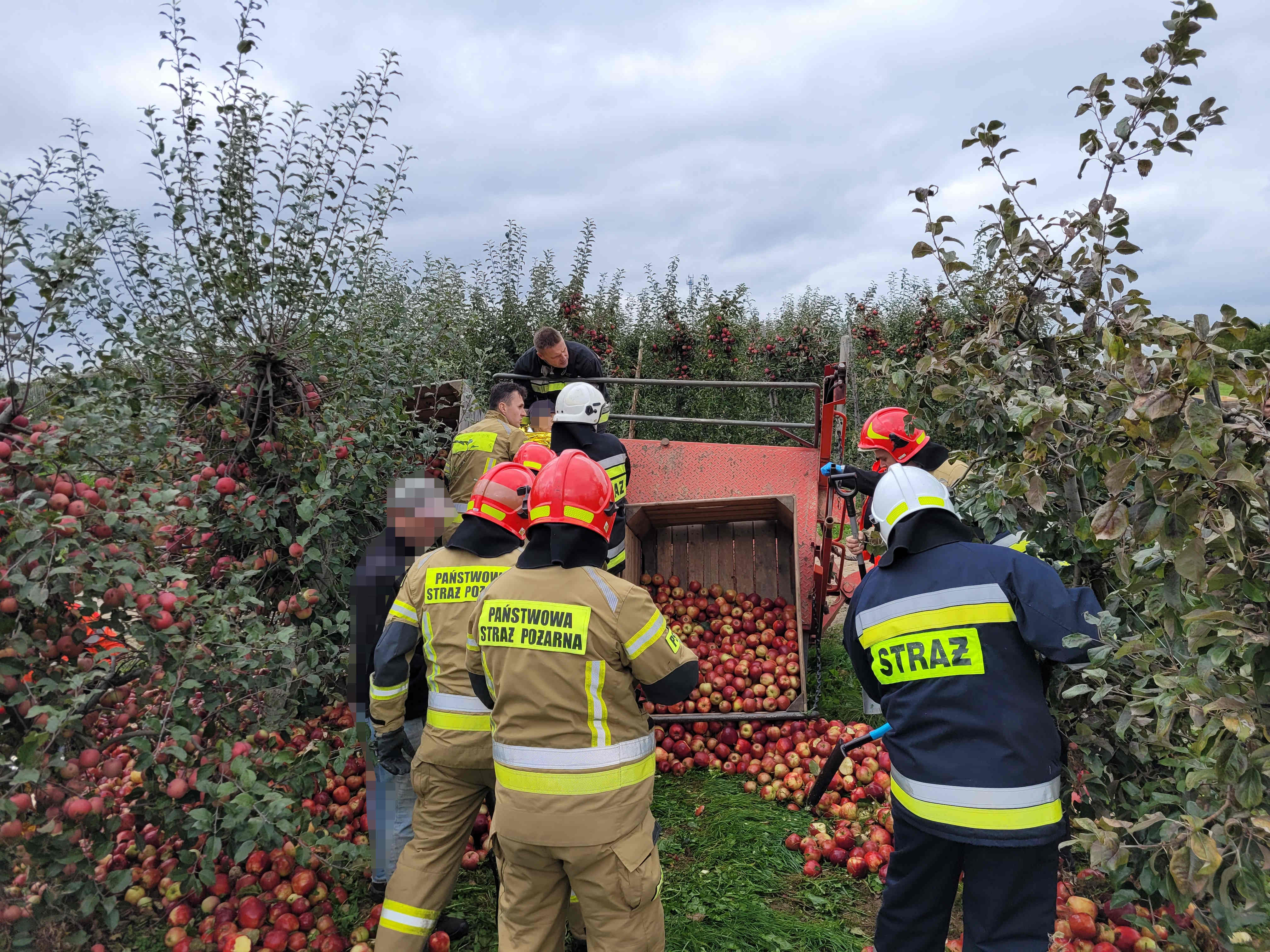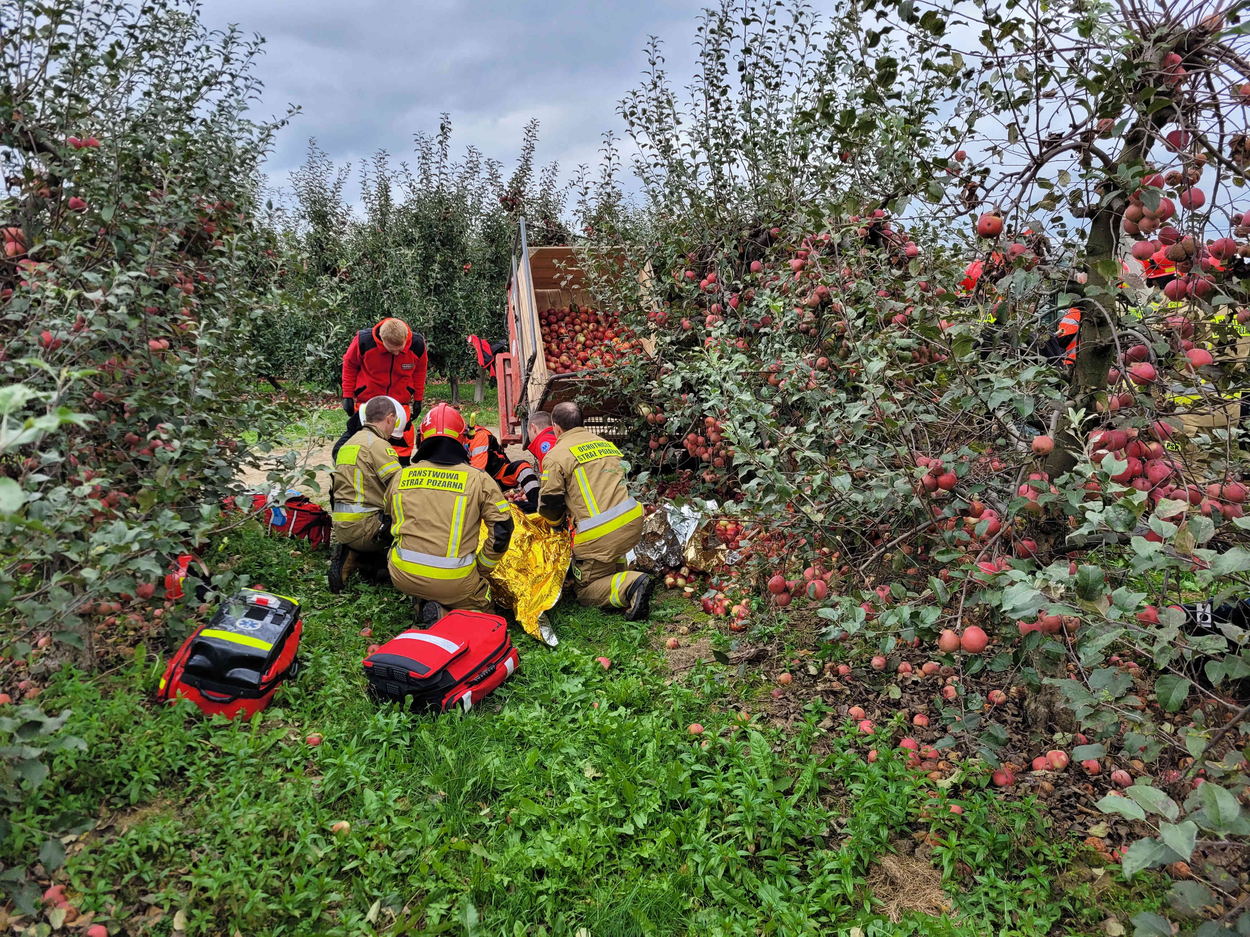 Przygniecenie dwóch osób przez platformę do zrywu jabłek w miejscowości Trzebiesławice