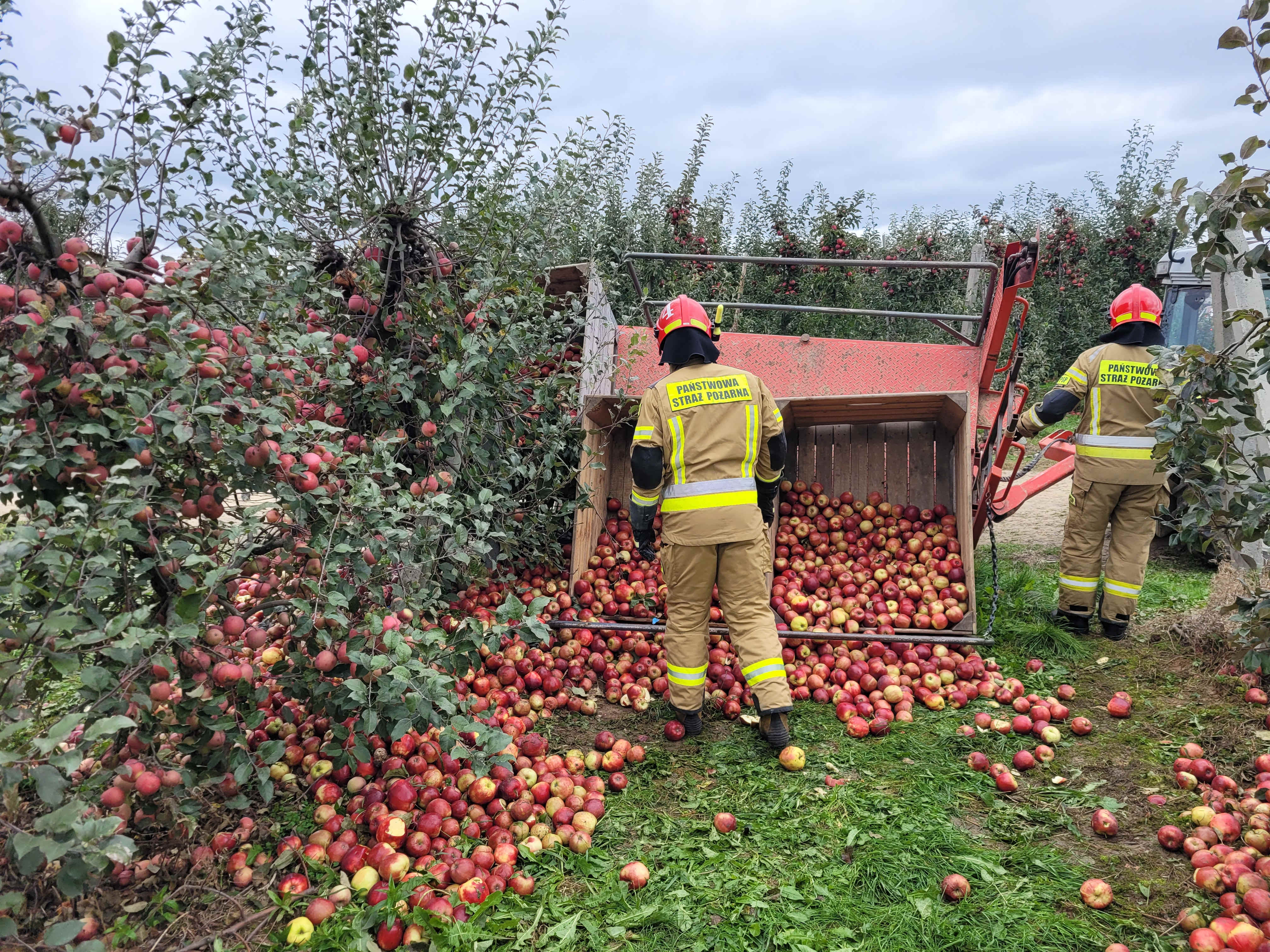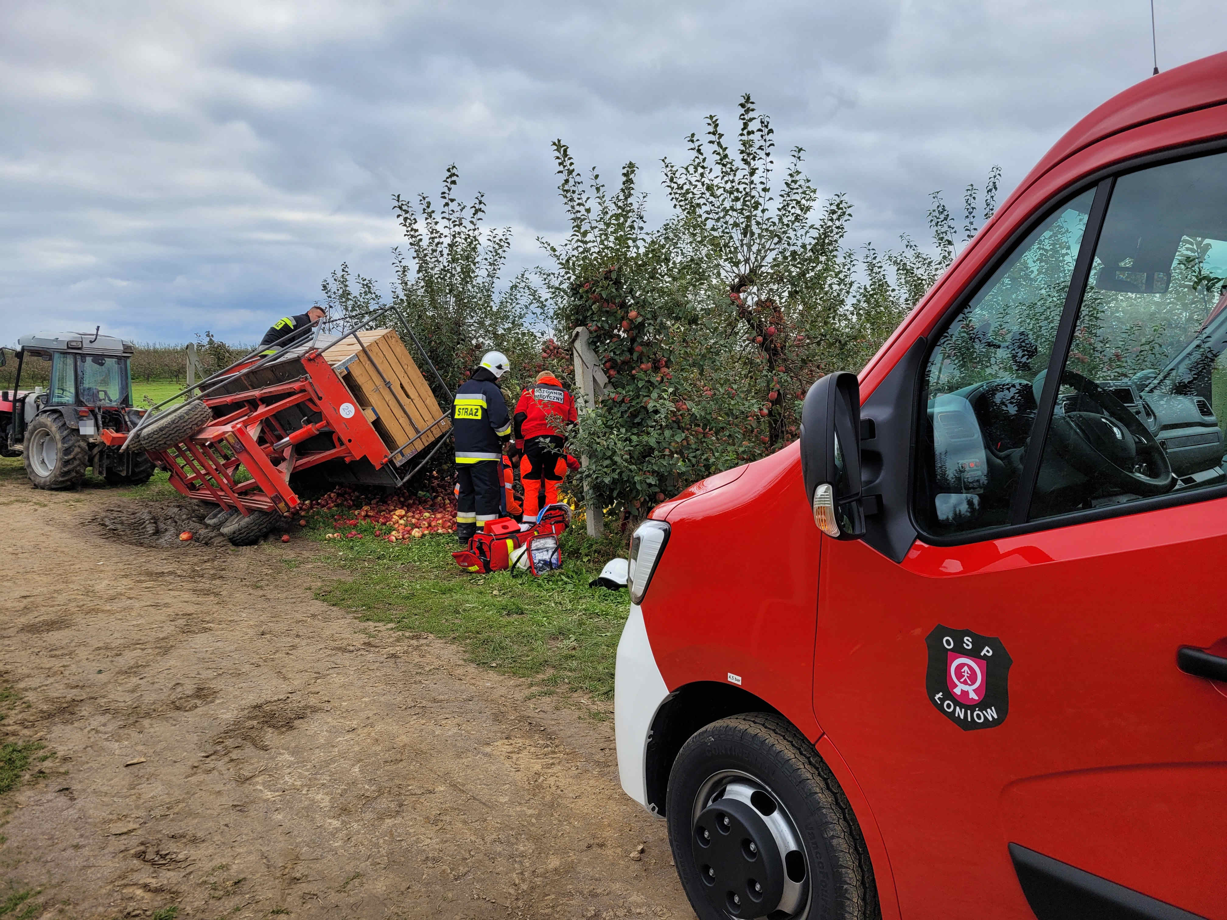 Po przyjeździe zastępów Straży Pożarnej na miejsce zdarzenia stwierdzono, że na zakręcie doszło do przewrócenia się platformy do zrywu jabłek. Dwie pracownice będące na platformie zostały przygniecione. Osoby postronne i świadkowie zdarzenia uwolniły obie osoby przed przybyciem zastępów.