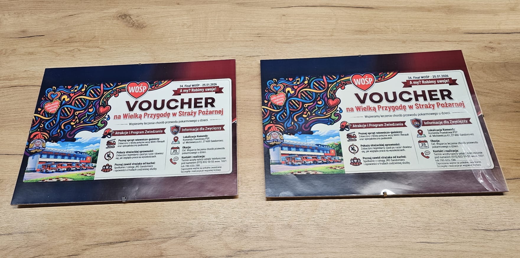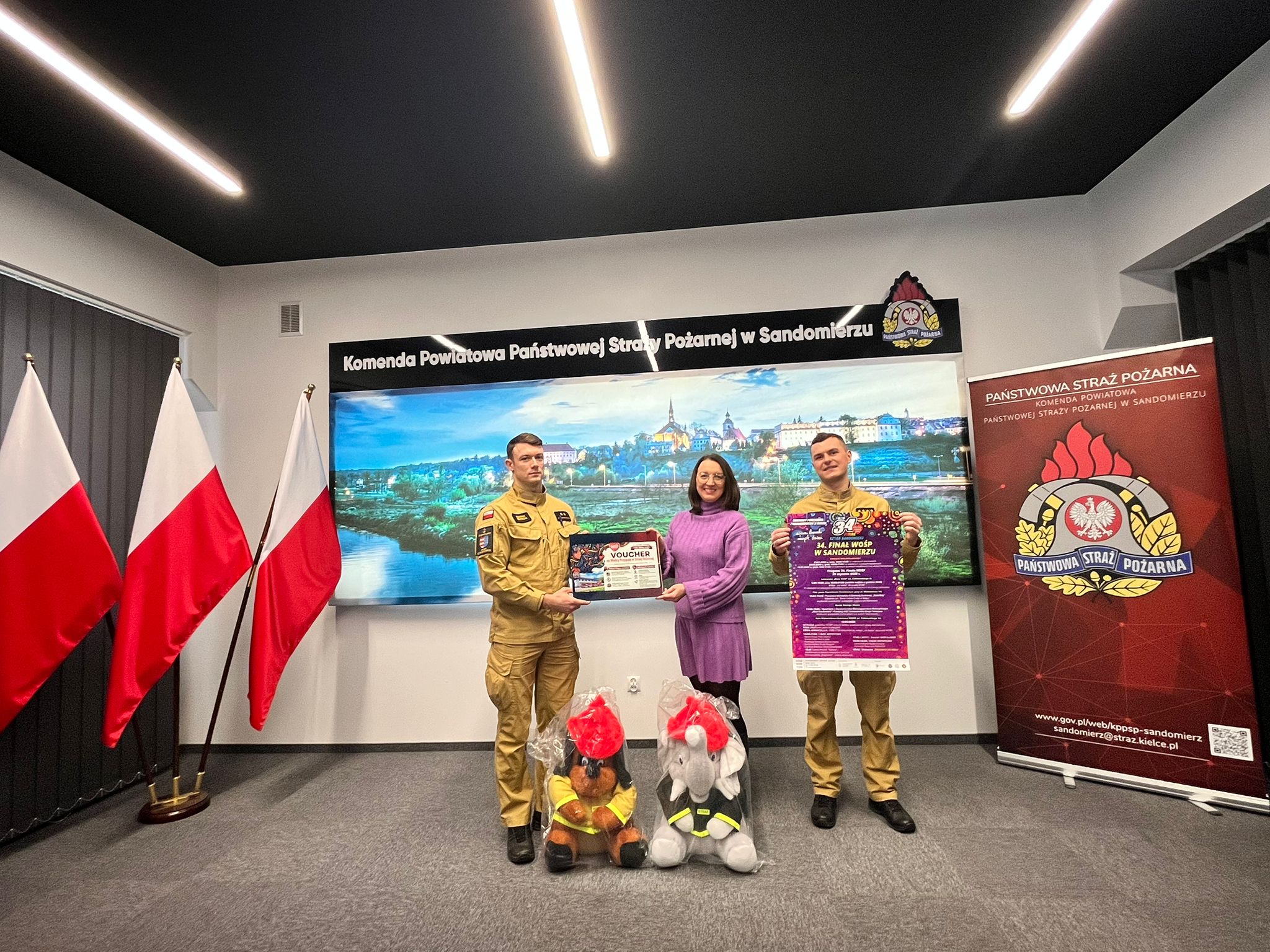 22 stycznia funkcjonariusze KP PSP w Sandomierzu przekazali do sztabu WOŚP dwa Vouchery na „Wielką przygodę w straży pożarnej’’ oraz dwa misie pluszowe, które zostaną wystawione na licytacje, wspierając tym samym cel tegorocznego finału.