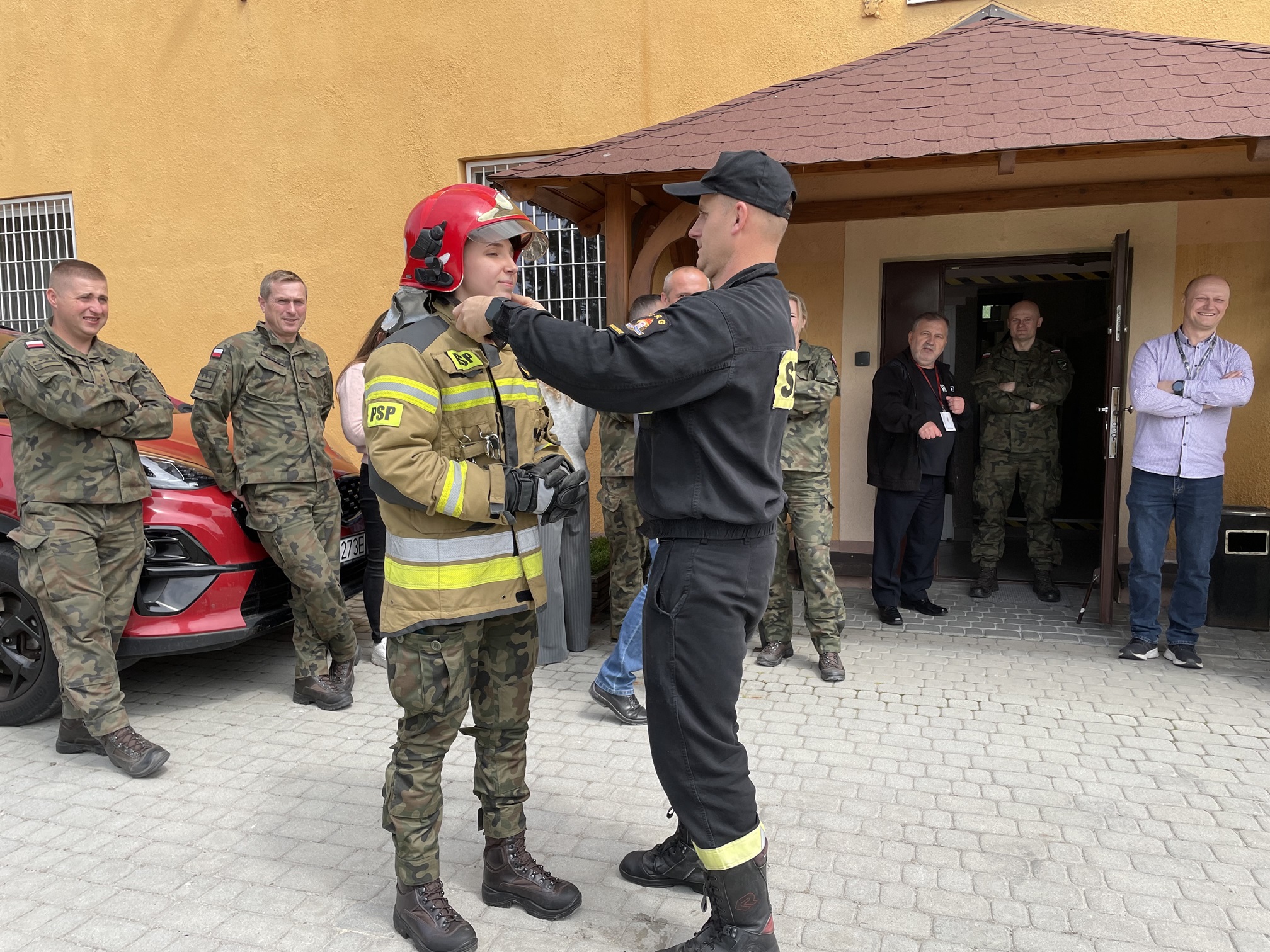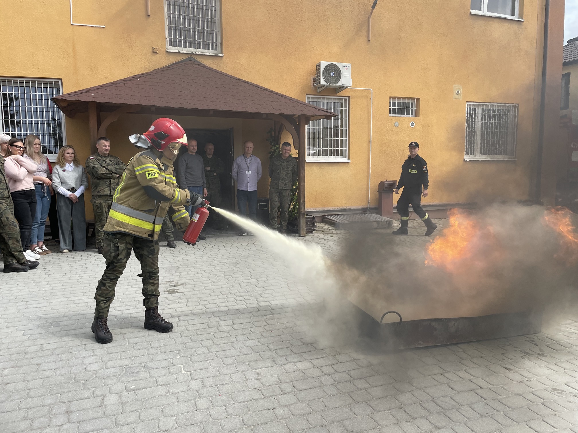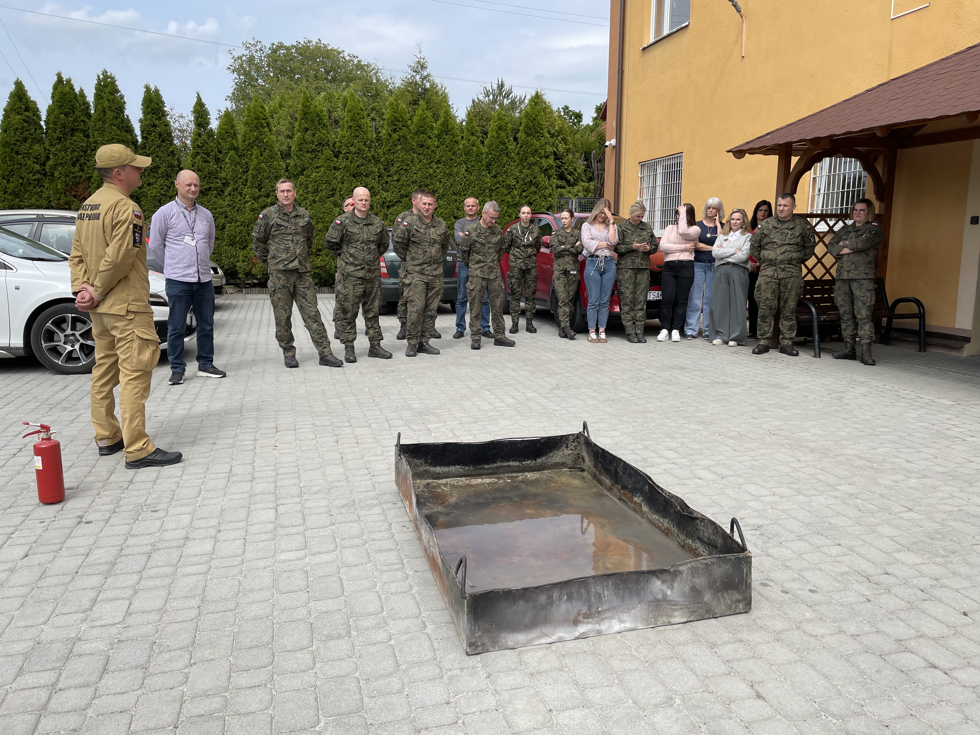 22.05.2025 r. na terenie Wojskowego Centrum Rekrutacji w Sandomierzu odbyło się szkolenie żołnierzy i pracowników cywilnych którzy wzięli udział w okresowym szkoleniu z ochrony przeciwpożarowej. Teoretyczny jak i praktyczny pokaz z zasad obsługi podręcznego sprzętu gaśniczego odbył się w asyście załogi wozu bojowego Komendy Powiatowej Państwowej Straży Pożarnej w Sandomierzu. Przed pokazem zastępca dowódcy Jednostki Ratowniczo-Gaśniczej dokonał omówienia klasyfikacji podręcznego sprzętu gaśniczego, rodzajów środków gaśniczych i zasad gaszenia pożaru przed jego rozwinięciem. W części praktycznej zajęć, ochotnicy z WCR mieli możliwość sprawdzenia swoich umiejętności w posługiwaniu się omówionym sprzętem i mogli ugasić pożar substancji ropopochodnych przy użyciu gaśnic z udziałem strażaków.