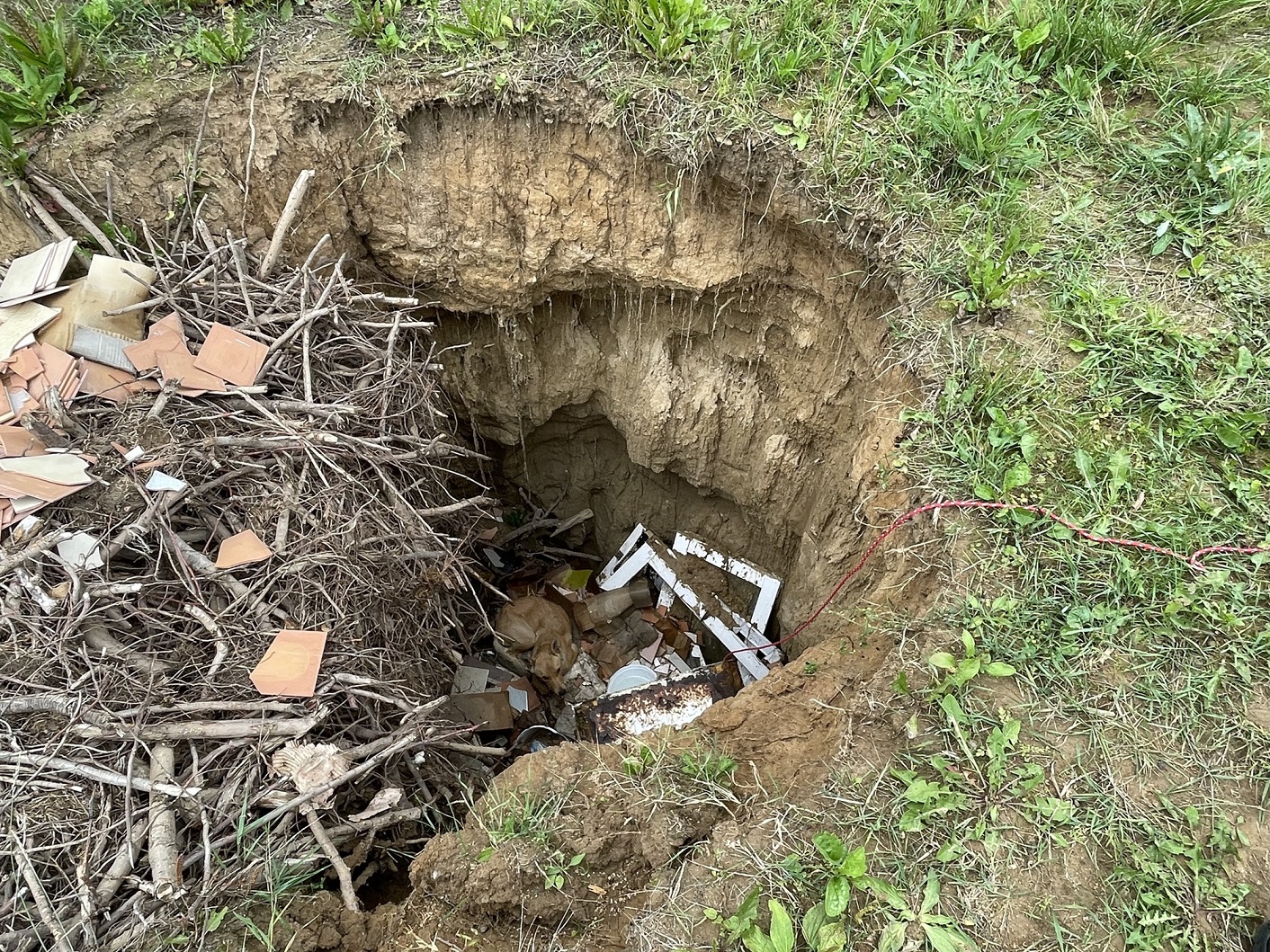 Uwięziony pies w rozpadlinie ziemnej w miejscowości Wierzbiny
