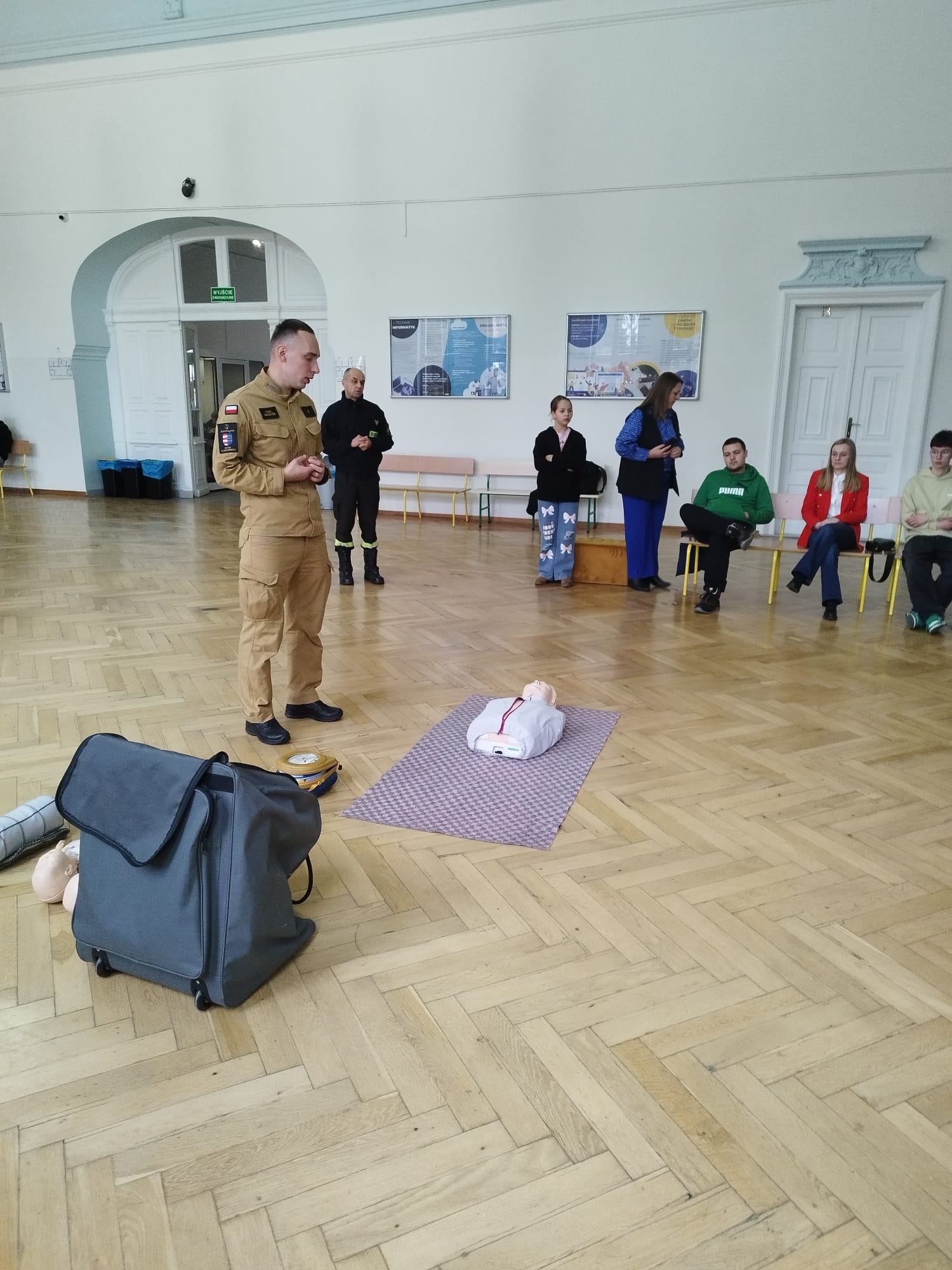 2 grudnia 2025 roku w Zespole Szkół Ekonomicznych im. Eugeniusza Kwiatkowskiego w Sandomierzu strażacy z Komendy Powiatowej Państwowej Straży Pożarnej w Sandomierzu przeprowadzili pokazy dla uczniów z zakresu pierwszej pomocy. Uczniowie chętnie wzięli udział w zajęciach i z zaciekawieniem słuchali wykładu. Po przedstawieniu teoretycznych zasad postępowania podczas zagrożenia życia uczniowie rozpoczęli zajęcia praktyczne. Zajęcia miały na celu utrwalić wiedzę młodzieży oraz uświadomić jak postępować w sytuacjach zagrożenia życia.