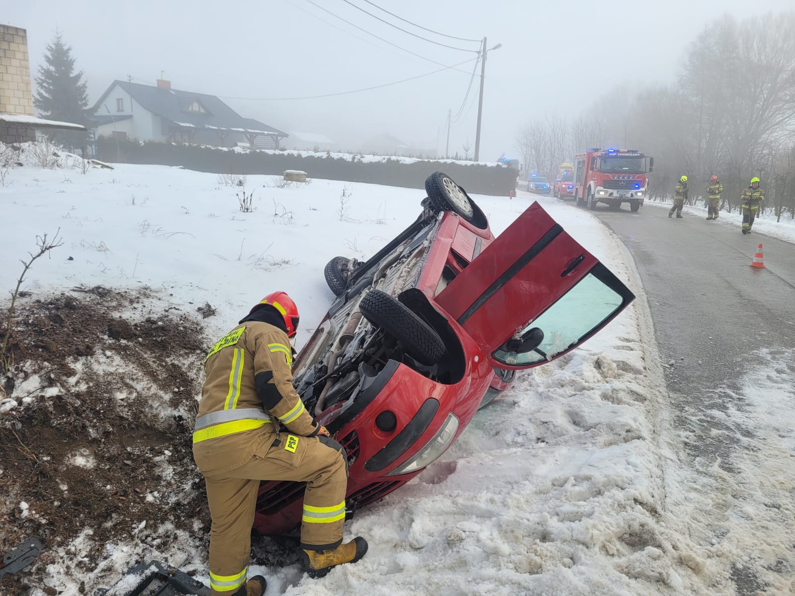 27 stycznia 2026 roku do Stanowiska Kierowania Komendanta Powiatowego PSP w Sandomierzu wpłynęło zgłoszenie o wypadku drogowym w miejscowości Chobrzany. Do zdarzenia zostały zadysponowani strażacy z JRG Sandomierz i OSP Chobrzany. Po przyjeździe zastępów straży pożarnej na miejsce zdarzenia i przeprowadzonym rozpoznaniu, stwierdzono, że samochód osobowy wypadł z jezdni i dachował w przydrożnym rowie. Samochodem podróżowała tylko kierująca. Strażacy zabezpieczyli miejsce zdarzenia i udzielili kobiecie kwalifikowanej pierwszej pomocy do czasu przekazania zespołowi ratownictwa medycznego, który zabrał poszkodowaną do szpitala na badania. Dalsze działania polegały na odłączeniu zasilania elektryczngo w pojeździe oraz zbieraniu i neutralizacji rozlanych płynów eksploatacyjnych. Droga powiatowa w trakcie działań była zablokowana.