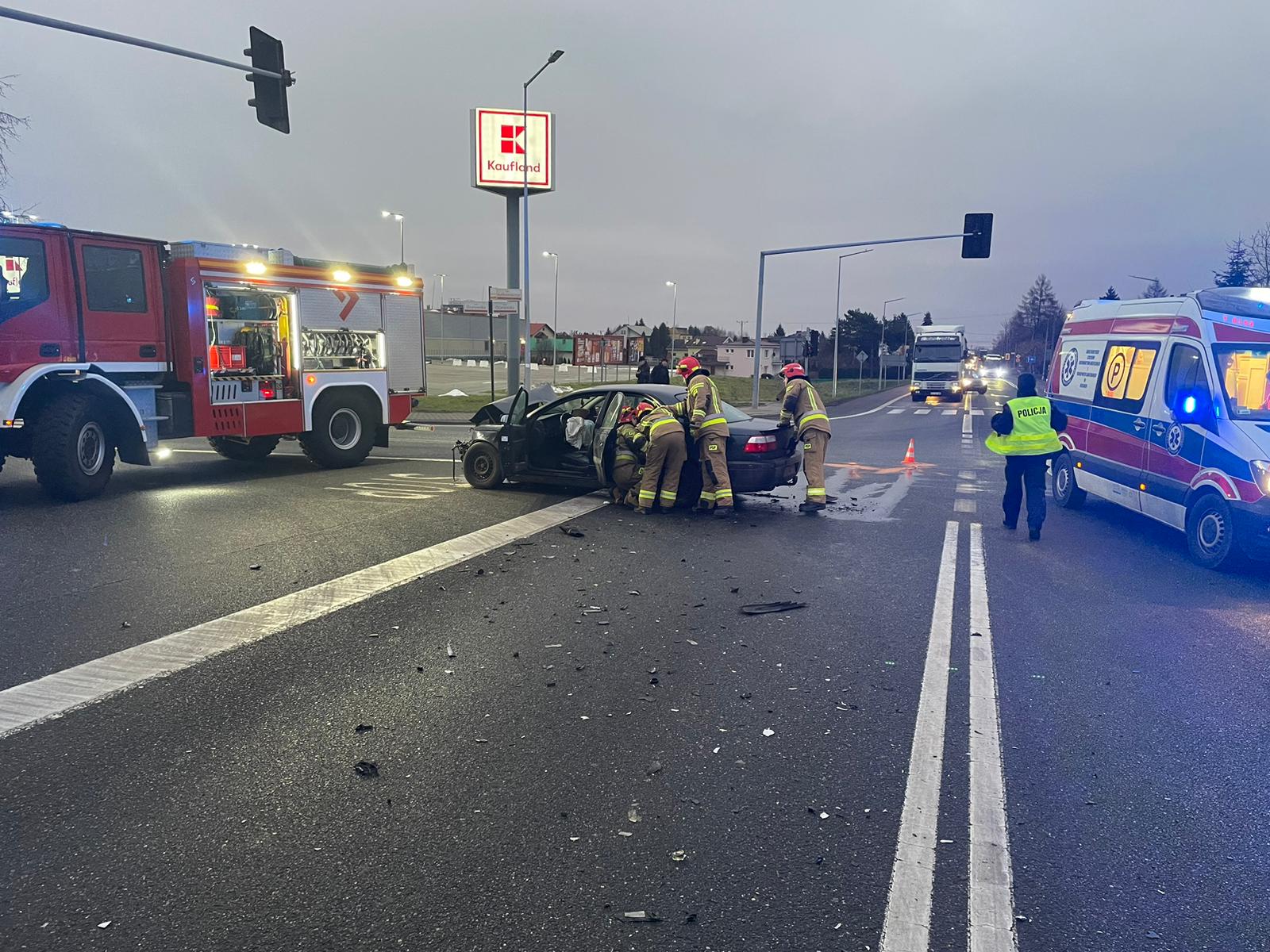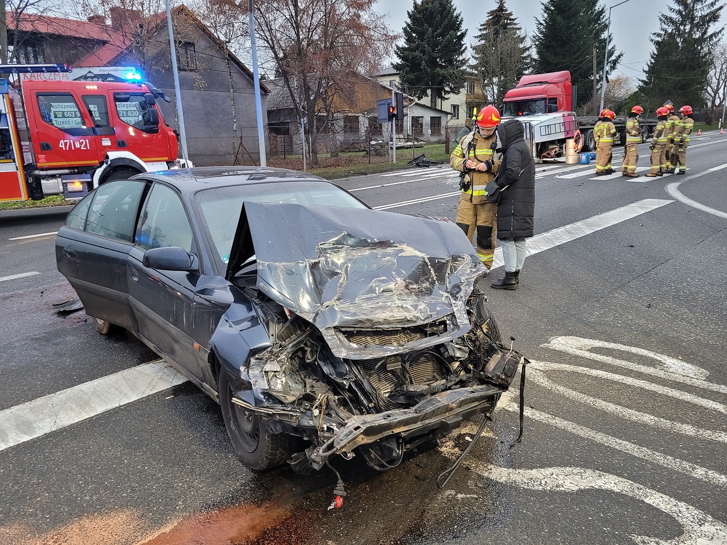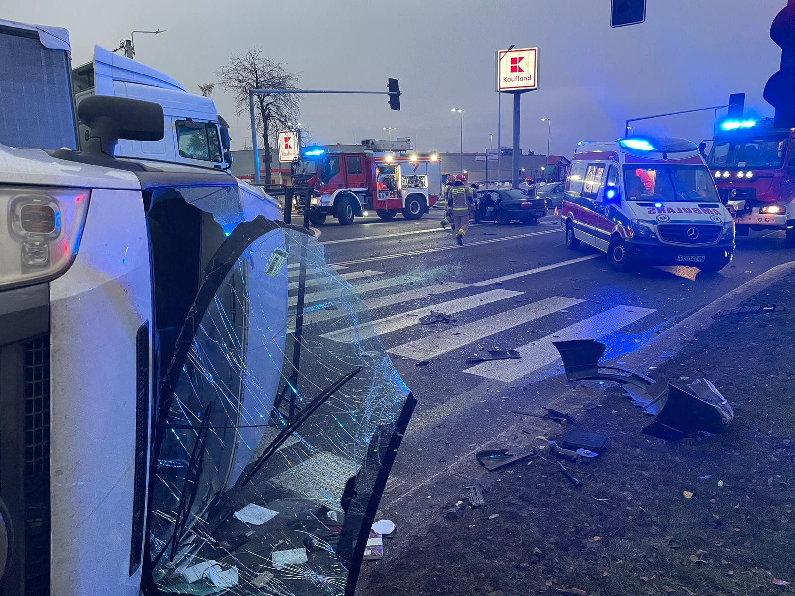 Po dojeździe zastępów straży pożarnej i przeprowadzonym rozpoznaniu stwierdzono, że doszło do zderzenia samochodu osobowego z busem, który przewrócił się na lewy bok i uderzył w ciągnik siodłowy z naczepą.