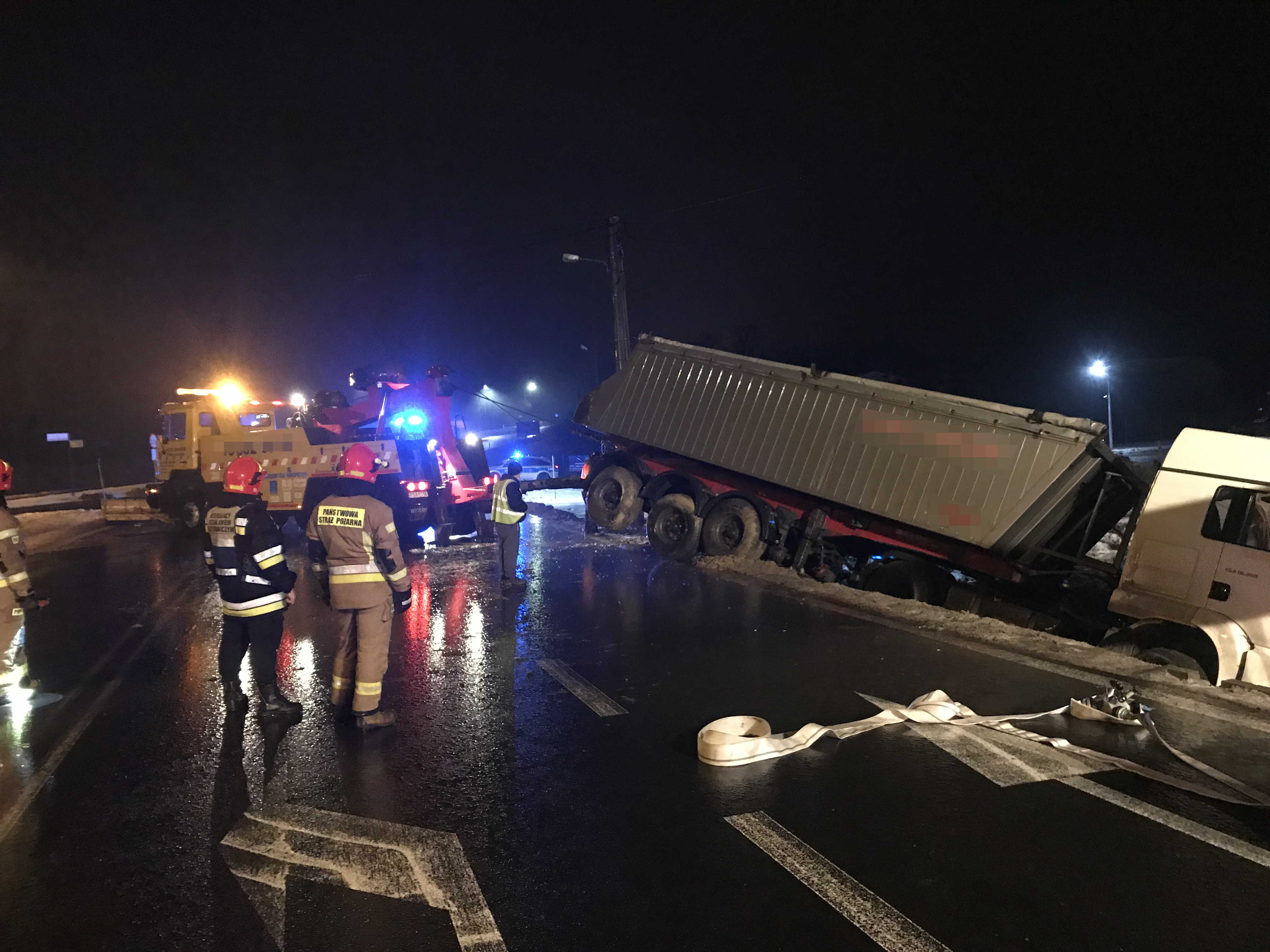 Po dojeździe na miejsce zdarzenia zastępów straży pożarnej i przeprowadzonym rozpoznaniu stwierdzono, że doszło do kolizji samochodu osobowego i samochodu ciężarowego przewożącego kruszywo. Pojazdami podróżowali tylko kierujący, którzy zostali przebadani przez Zespół Ratownictwa Medycznego i pozostali na miejscu zdarzenia. Samochód ciężarowy znajdował się w rowie, a pojazd osobowy pozostał na jezdni. Działania zastępów polegały na zabezpieczeniu miejsca zdarzenia, opanowaniu wycieku oleju napędowego ze zbiornika pojazdu ciężarowego oraz odłączeniu zasilania elektrycznego pojazdów. Paliwo z uszkodzonego zbiornika zostało przepompowane do pojemników zastępczych. Pomoc drogowa zabrała uszkodzone pojazdy a jezdnia została uprzątnięta z elementów powypadkowych.