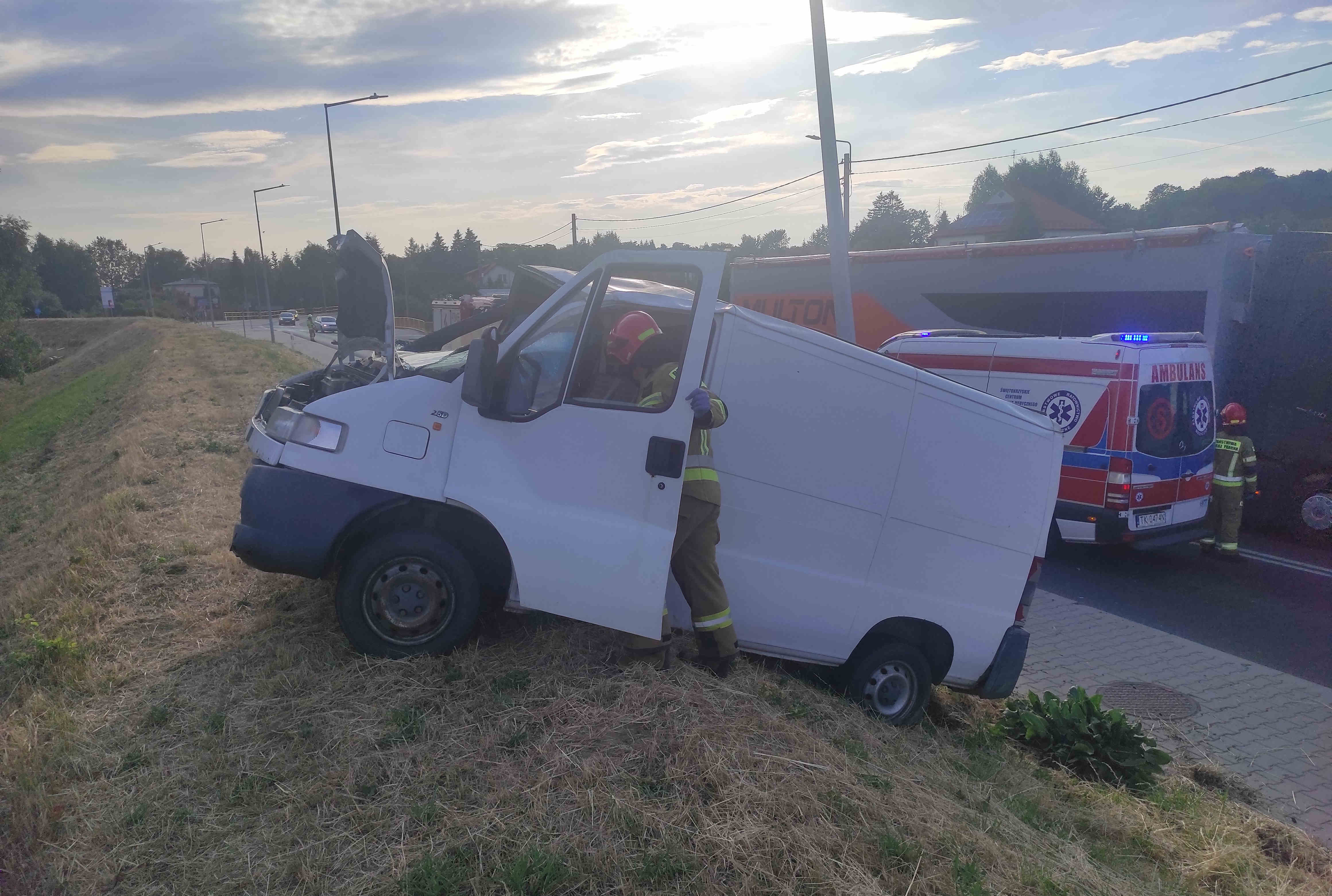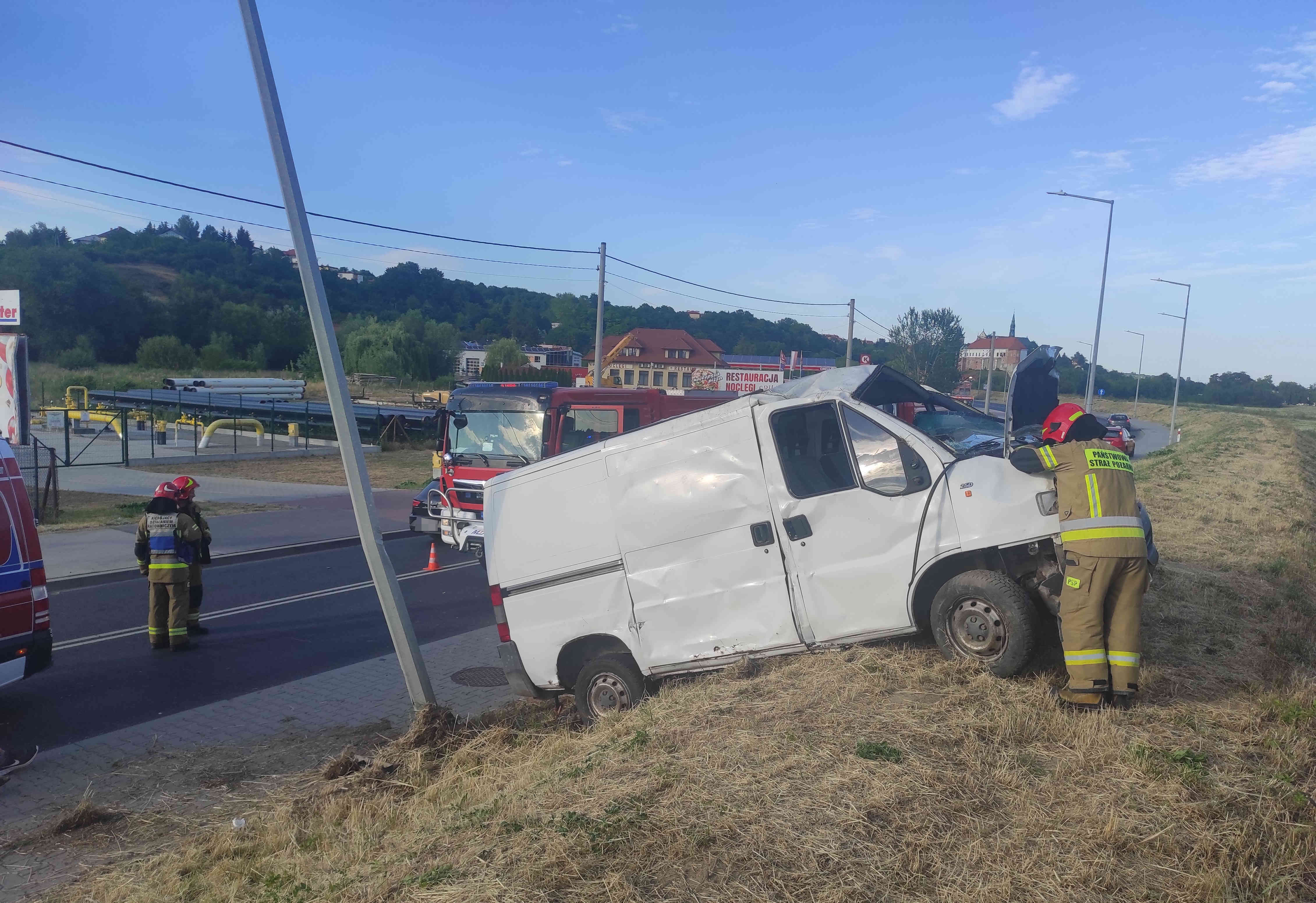 04 lipca 2022 roku do Stanowiska Kierowania Komendanta Powiatowego Państwowej Straży Pożarnej w Sandomierzu wpłynęło zgłoszenie o wypadku drogowym w Sandomierzu na ulicy Krakowskiej. Do zdarzenia zostali zadysponowani strażacy z Jednostki Ratowniczo - Gaśniczej PSP w Sandomierzu i strażacy z OSP Złota. Po dojeździe na miejsce zdarzenia zastępów straży pożarnej stwierdzono, że samochód dostawczy bus znajduje się poza drogą na przydrożnej skarpie. Samochodem podróżował kierowca, który z pojazdu został wyciągnięty przez osoby postronne i znajdował się pod opieką zespołu ratownictwa medycznego. Poszkodowany kierowca został zabrany do szpitala na dalsze badania. Działania ratowników polegały na zabezpieczeniu miejsca zdarzenia i odłączeniu instalacji elektrycznej w pojazdach. Po czynnościach przeprowadzonych przez Policję ratownicy dokonali sorpcji i neutralizacji rozlanych płynów eksploatacyjnych.