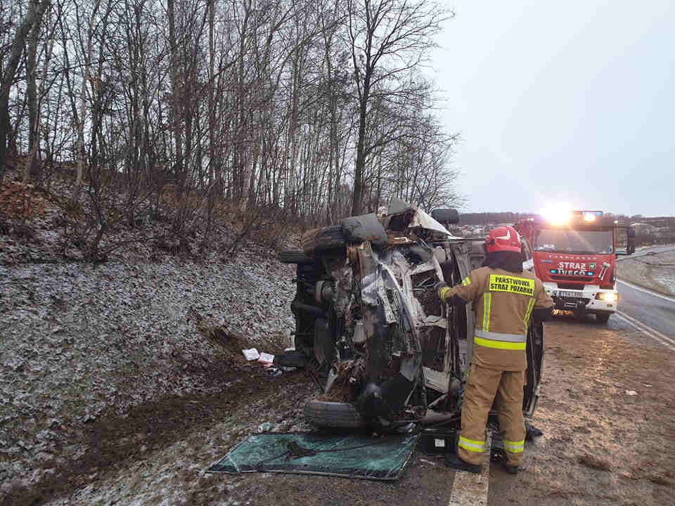 Samochodem podróżowały łącznie trzy osoby, które opuściły pojazd o własnych siłach. Działania straży pożarnej polegały na zabezpieczeniu miejsca zdarzenia, udzieleniu kwalifikowanej pierwszej pomocy uczestnikom zdarzenia oraz jednoczesnym odłączeniu instalacji elektrycznej w pojeździe. Po zakończeniu czynności prowadzonych przez funkcjonariuszy Policji, strażacy przeprowadzili neutralizację i sorpcję rozlanych płynów eksploatacyjnych oraz uprzątnęli jezdnię z rozbitych elementów powypadkowych.