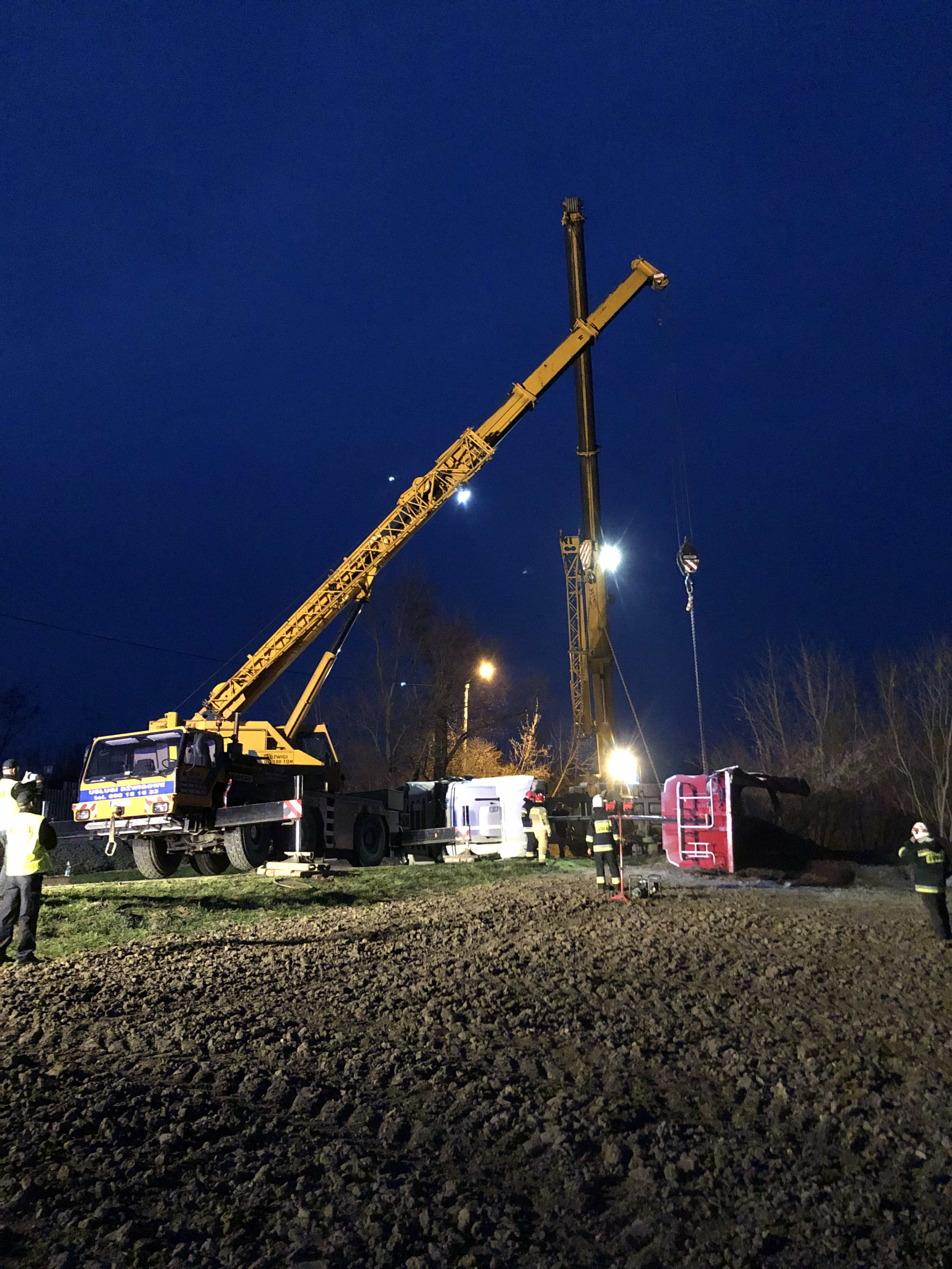 Właściciel pojazdu we własnym zakresie sprowadził dwa dźwigi, za pomocą których pojazd został postawiony na kołach. Ratownicy oświetlali teren zdarzenia a po zakończeniu operacji podniesienia pojazdu usunęli rozlane płyny eksploatacyjne.
