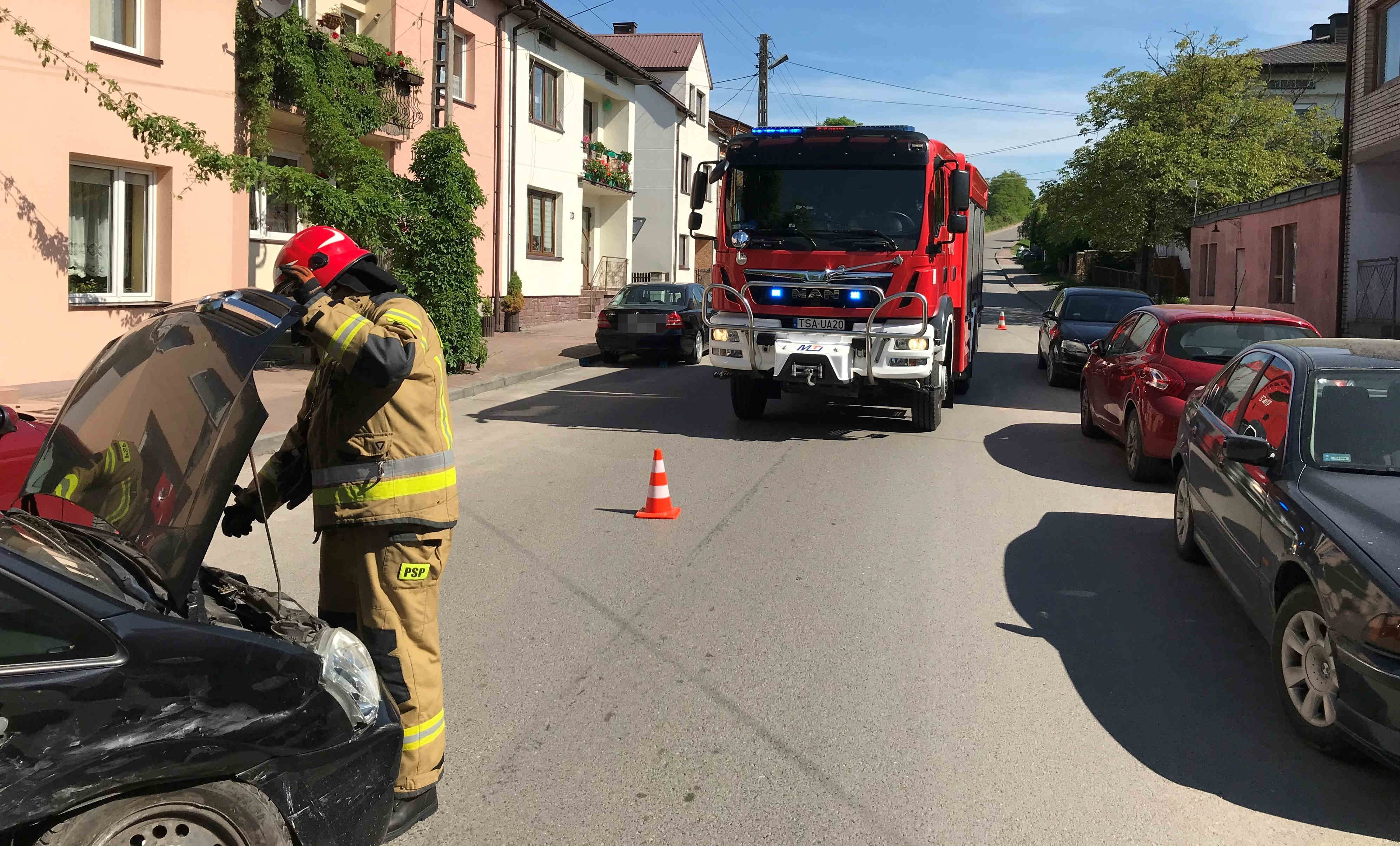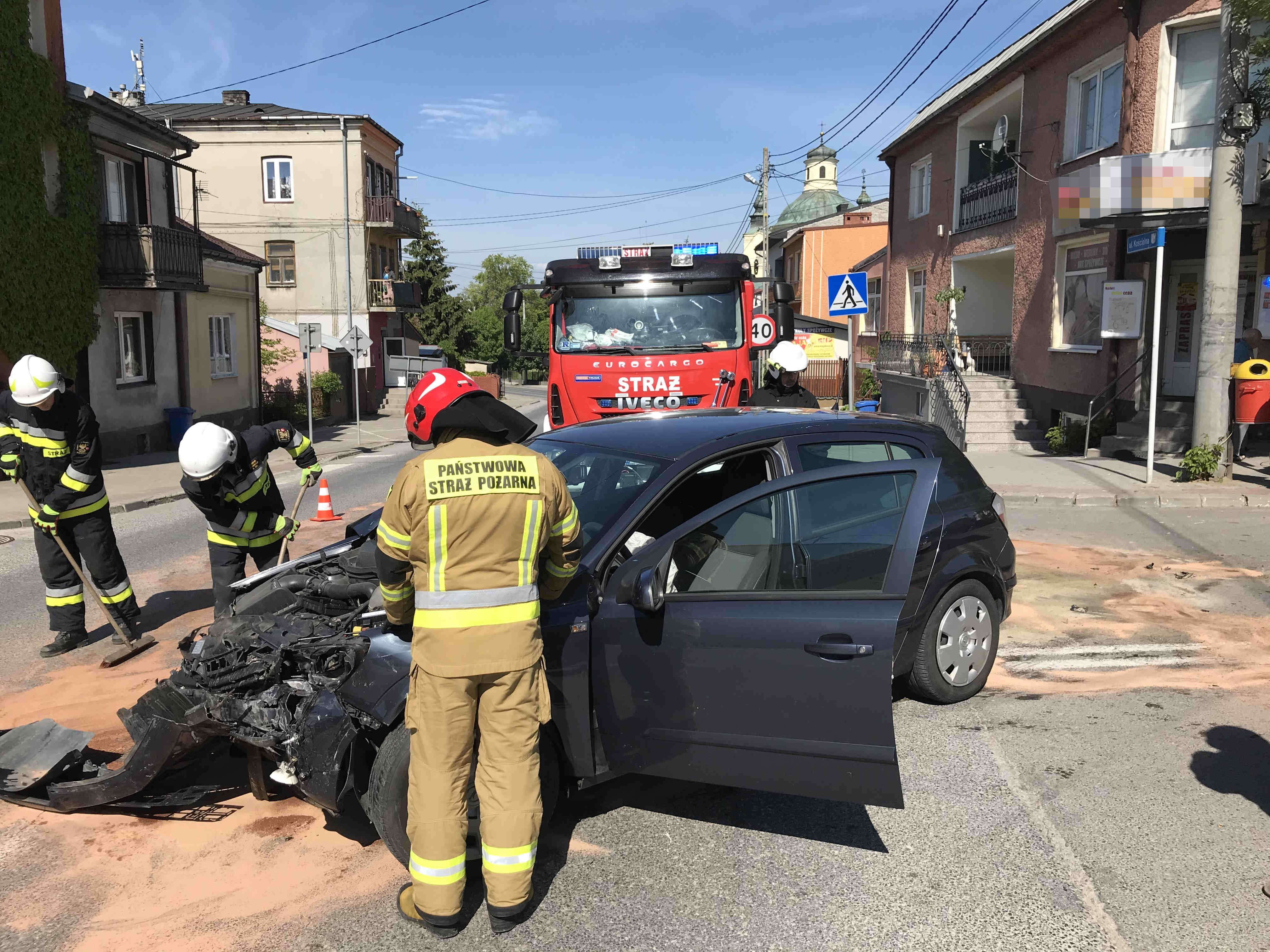 03 czerwca 2021 roku do Stanowiska Kierowania Komendanta Powiatowego Państwowej Straży Pożarnej w Sandomierzu, wpłynęło zgłoszenie o wypadku drogowym w Klimontowie. Do zdarzenia zostali zadysponowani strażacy z Jednostki Ratowniczo - Gaśniczej PSP w Sandomierzu i Ochotniczej Straży Pożarnej w Klimontowie. Po dojeździe na miejsce zdarzenia zastępów straży pożarnej stwierdzono, że na skrzyżowaniu ulic doszło do zderzenia dwóch samochodów osobowych, którymi podróżowało łącznie trzy osoby. Działania zastępów straży pożarnej polegały na zabezpieczeniu miejsca zdarzenia i odłączaniu zasilania elektrycznego w pojazdach. Jednocześnie strażacy udzielili trzem osobom kwalifikowanej pierwszej pomocy tj. założyli kołnierz, udzielili wsparcia psychicznego oraz opatrzyli rany. Przybyły na miejsce zespół ratownictwa medycznego po przebadaniu zabrał dwie osoby poszkodowane do szpitala na dalsze badania, natomiast jedna osoba pozostała na miejscu. Po czynnościach przeprowadzonych przez funkcjonariuszy Policji ratownicy dokonali sorpcji i neutralizacji rozlanych płynów eksploatacyjnych i uprzątnęli z drogi elementy powypadkowe.