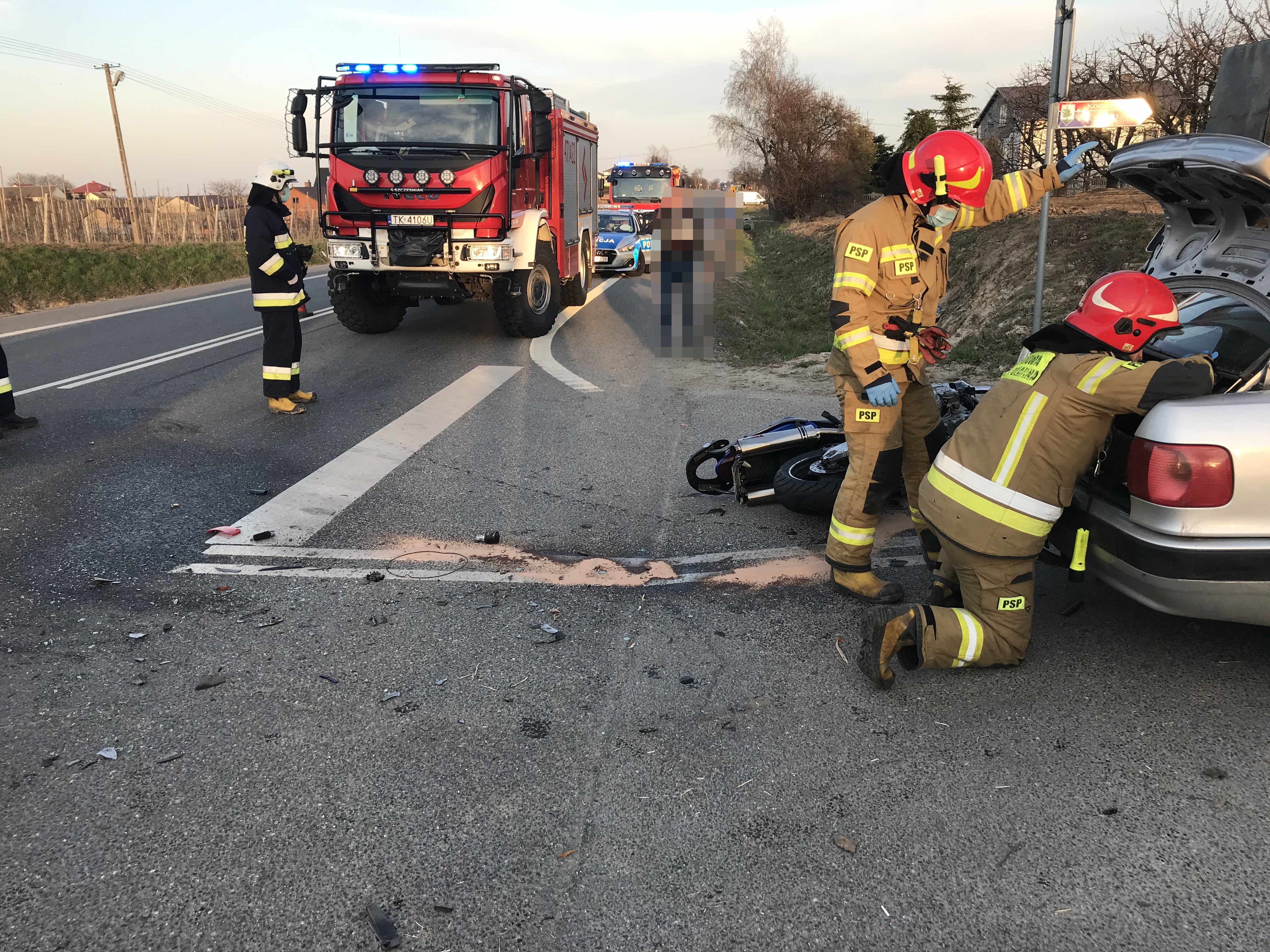 10 kwietnia 2021 roku do Stanowiska Kierowania Komendanta Powiatowego Państwowej Straży Pożarnej w Sandomierzu, wpłynęło zgłoszenie o wypadku drogowym w miejscowości Komorna. Do zdarzenia zostali zadysponowani strażacy z Jednostki Ratowniczo - Gaśniczej PSP w Sandomierzu i OSP Obrazów. Po dojeździe na miejsce zdarzenia zastępów straży pożarnej stwierdzono, że na odcinku drogi krajowej nr 77 doszło do zderzenia motocyklisty z samochodem osobowym. Działania zastępów straży pożarnej polegały na zabezpieczeniu miejsca zdarzenia i odłączaniu zasilania elektrycznego w pojazdach. Jednocześnie w trakcie prowadzonych działań strażacy udzielili poszkodowanemu motocykliście kwalifikowanej pierwszej pomocy tj. udzielili mu wsparcia psychicznego oraz zabezpieczyli przed utratą ciepła. Dokonali ręcznej stabilizacji szyjnego odcinka kręgosłupa wraz z tamowaniem krwotoku tętnicy szyjnej, ułożyli poszkodowanego w pozycji przeciwwstrząsowej na desce ortopedycznej, wdrożyli tlenoterapie bierna 100% oraz stabilizacje złamanych kończyn. Przybyły na miejsce zespół ratownictwa medycznego zabrał poszkodowaną osobę do szpitala na dalsze badania. Po czynnościach przeprowadzonych przez funkcjonariuszy Policji ratownicy dokonali sorpcji i neutralizacji rozlanych płynów eksploatacyjnych i uprzątnęli z drogi elementy powypadkowe.