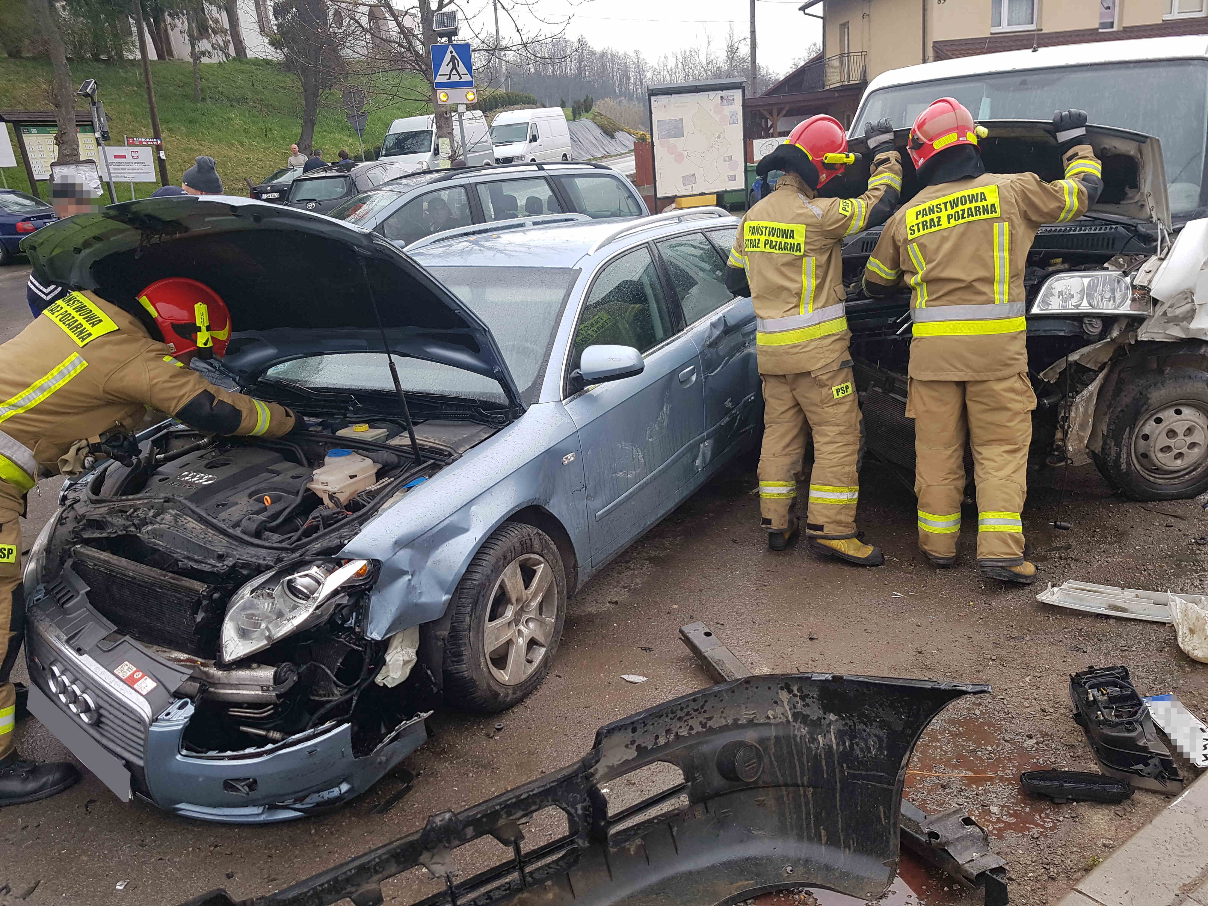 Po rozpoznaniu stwierdzono zderzenia dwóch pojazdów osobowych, gdzie w wyniku zderzenia jeden z pojazdów wypadł poza drogę i uszkodził stojące na pobliskim parkingu zaparkowane pojazdy. Działania ratowników polegały na zabezpieczeniu miejsca zdarzenia i odłączeniu instalacji elektrycznej w pojazdach oraz udzieleniu kwalifikowanej pierwszej pomocy kierującym pojazdami. Poszkodowani zostali przekazani zespołowi ratownictwa medycznego. Po działaniach ratowniczych pojazdy zostały zabrane przez pomoc drogową a jezdnia uprzątnięta z rozbitych elementów karoserii.