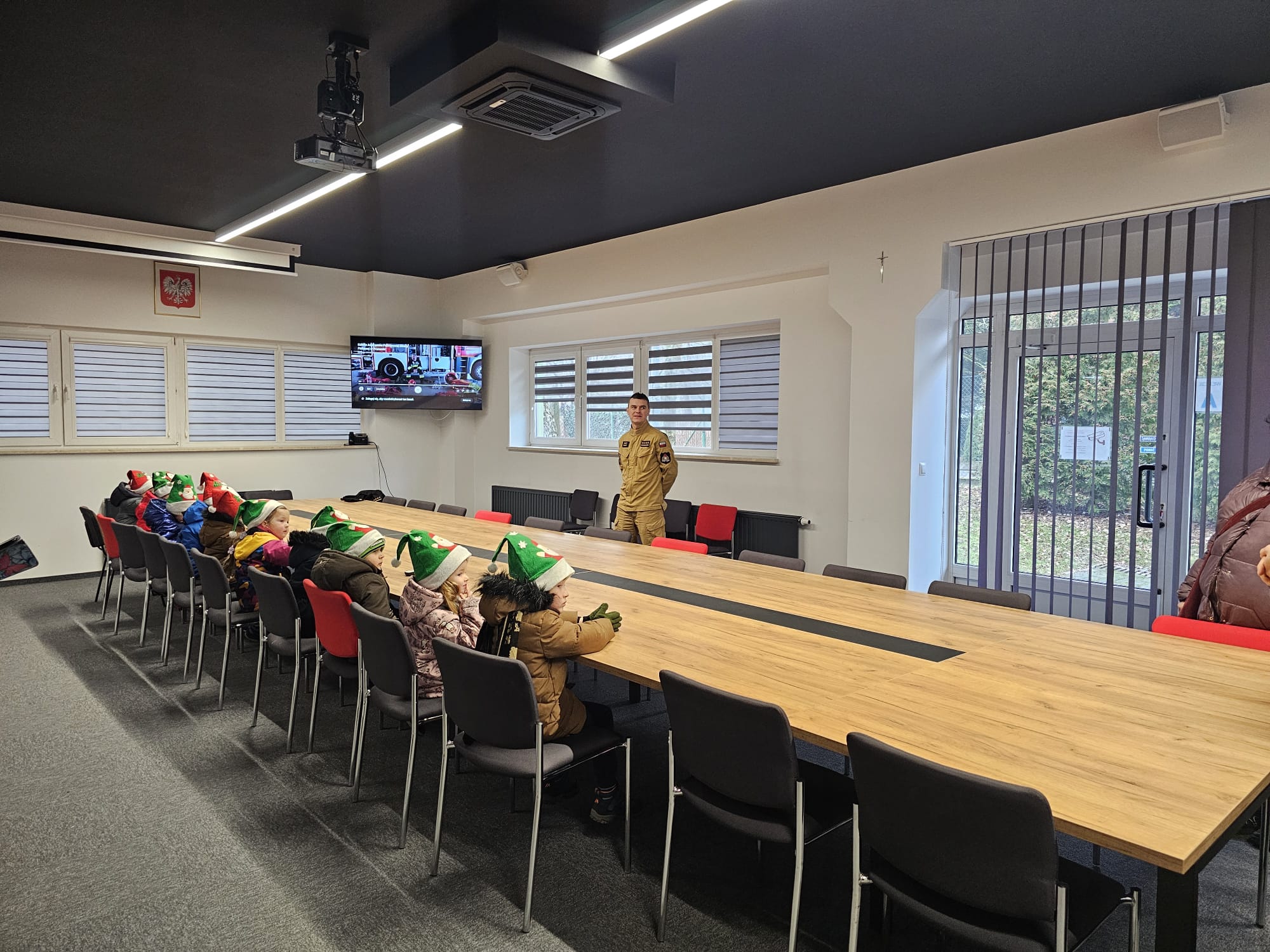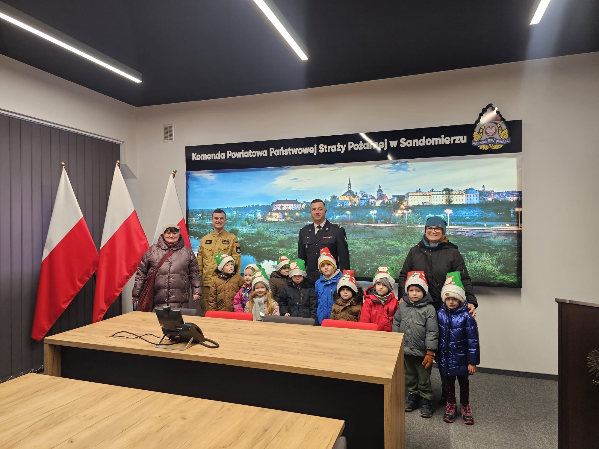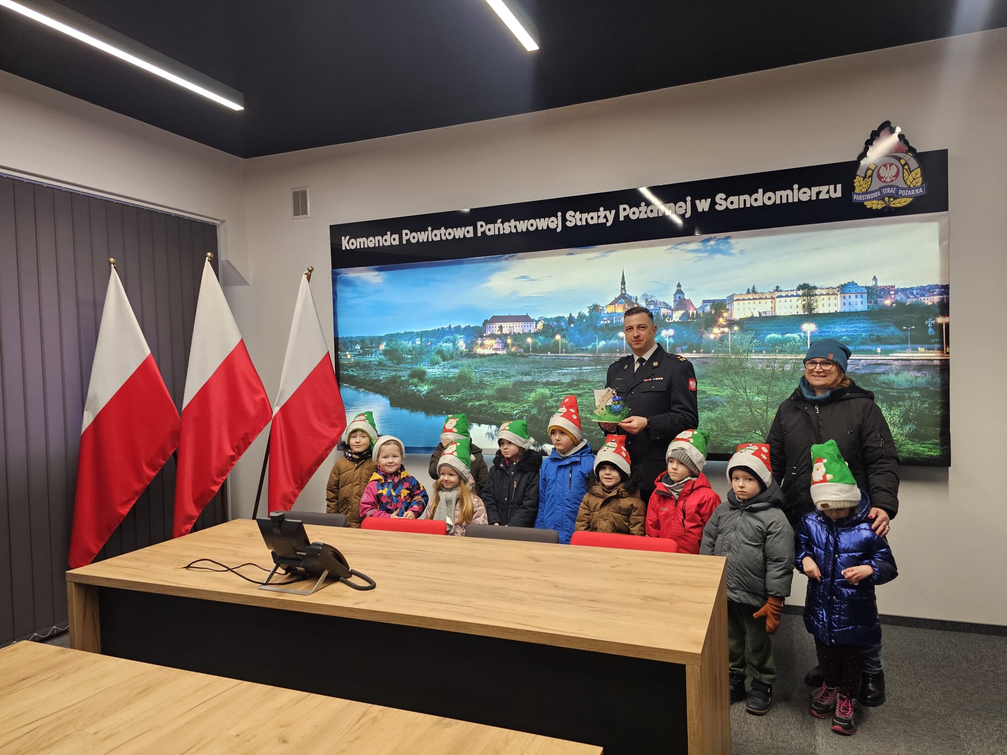 18 grudnia 2025 roku Komendę Powiatową Państwowej Straży Pożarnej w Sandomierzu odwiedziły dzieci wraz z opiekunkami z Niepublicznego Przedszkola „Mali Odkrywcy” w Sandomierzu. W związku ze zbliżającymi się Świętami Bożego Narodzenia przedszkolaki złożyły strażakom świąteczne życzenia oraz wręczyły własnoręcznie przygotowany stroik.