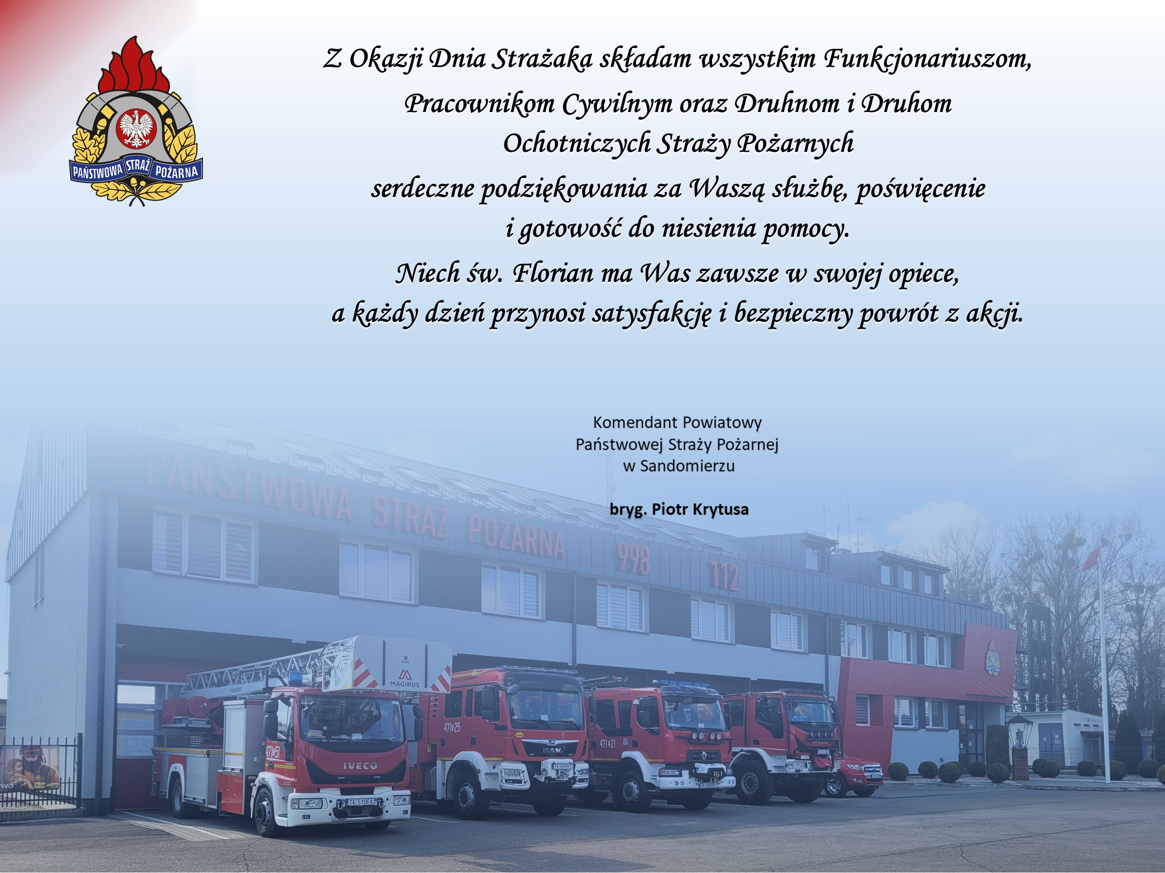 Życzenia Komendanta Powiatowego PSP w Sandomierzu z okazji Dnia Strażaka 02.05.2025 Zdjęcia (1) Pokaż zdjęcie 1 z galerii.