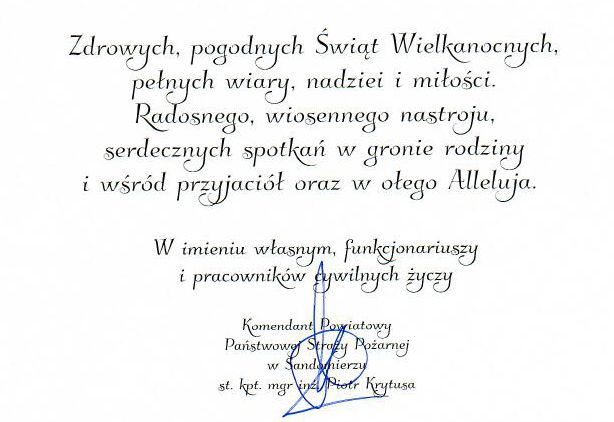 Życzenia świąteczne Komendanta Powiatowego Państwowej Straży Pożarnej w Sandomierzu 02.04.2021 Zdjęcia (1) Pokaż zdjęcie 1 z galerii.