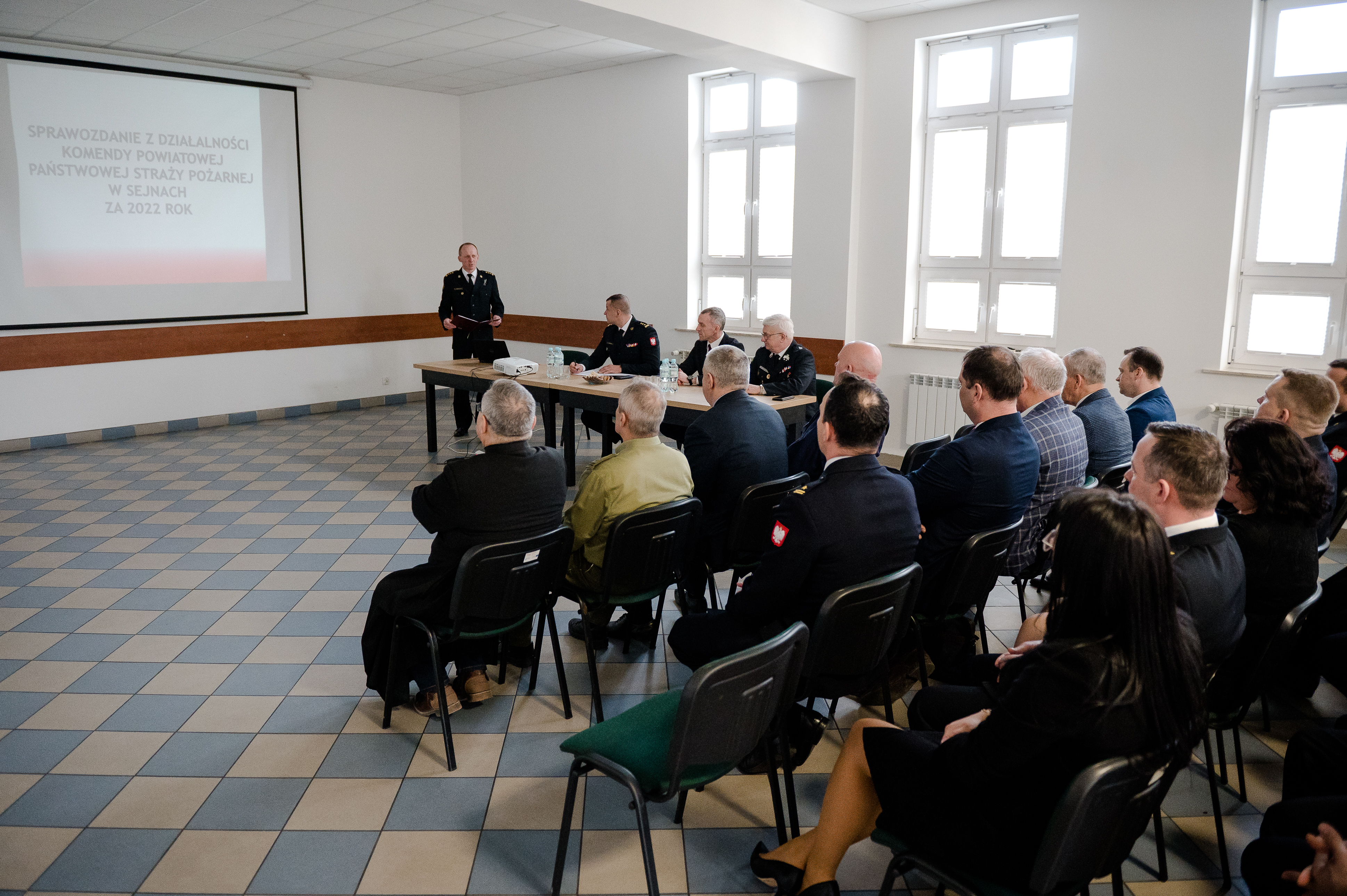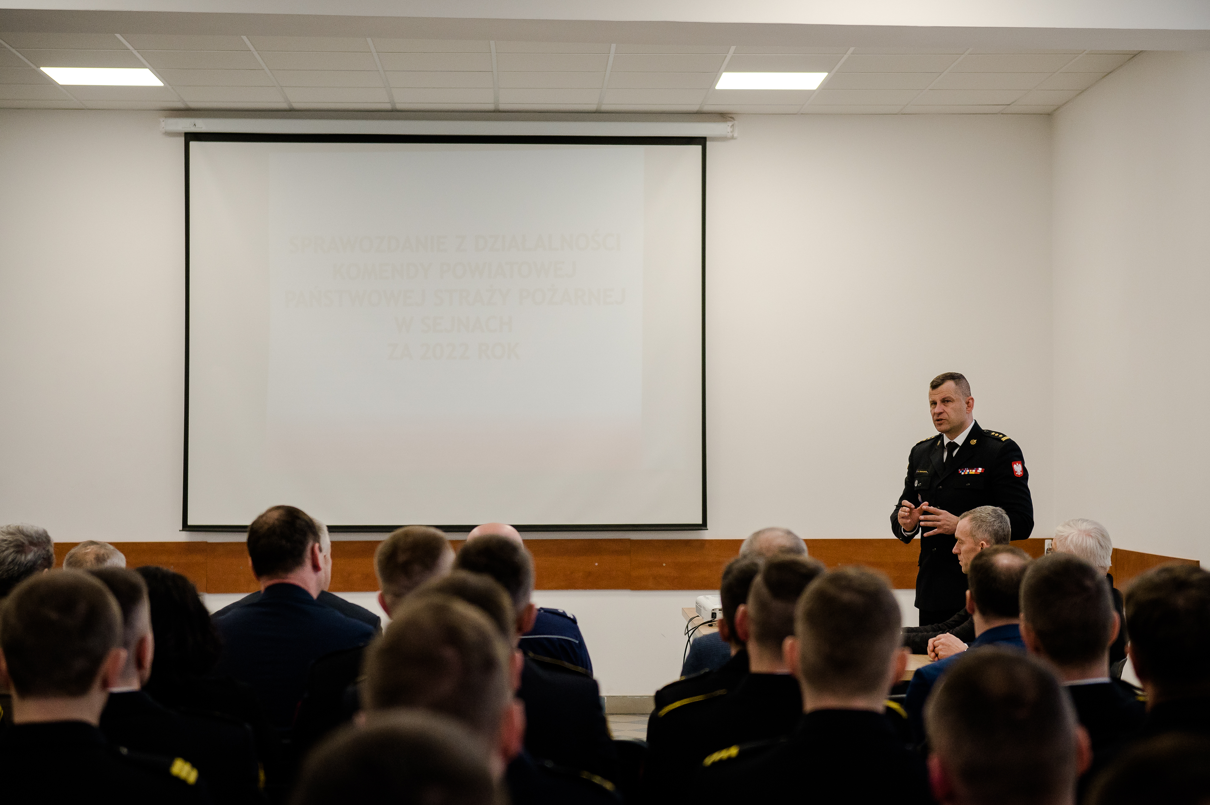 8 lutego 2023 roku o godzinie 11:00 w KP PSP w Sejnach odbyła się narada roczna związana z podsumowaniem działalności ochrony przeciwpożarowej na terenie powiatu sejneńskiego za 2022 rok.