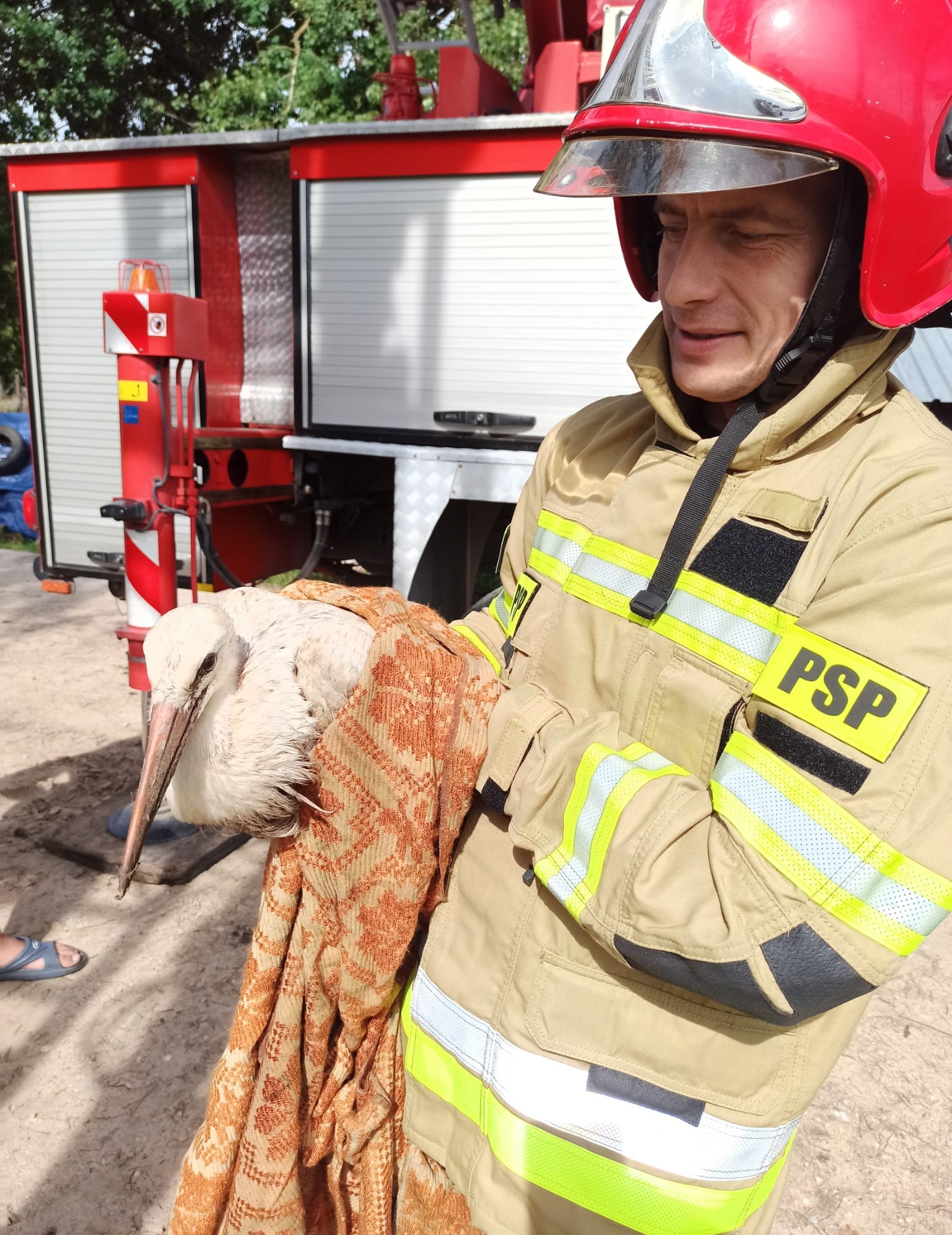 Funkcjonariusza KP PSP w Sejnach zostali zadysponowani we wtorek (10.08.2021 r. ) do niecodzinnnego zdarzenia w miejscowości Trakiszki w Gminie Puńsk. Zadaniem strażaków była pomoc rannemu bocianowi, który od dłuższego czasu znajdował się w gnieździe. Ratownicy