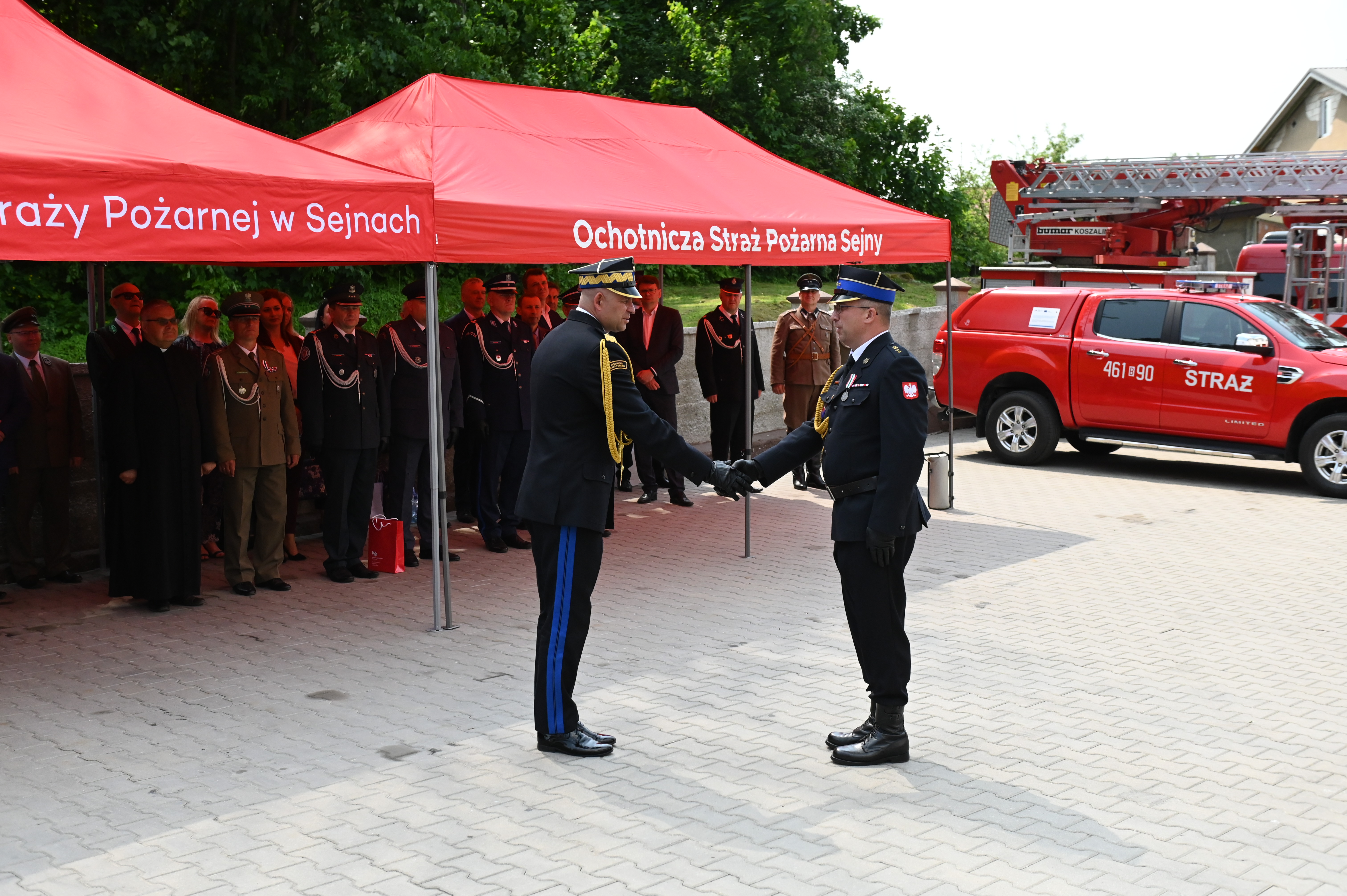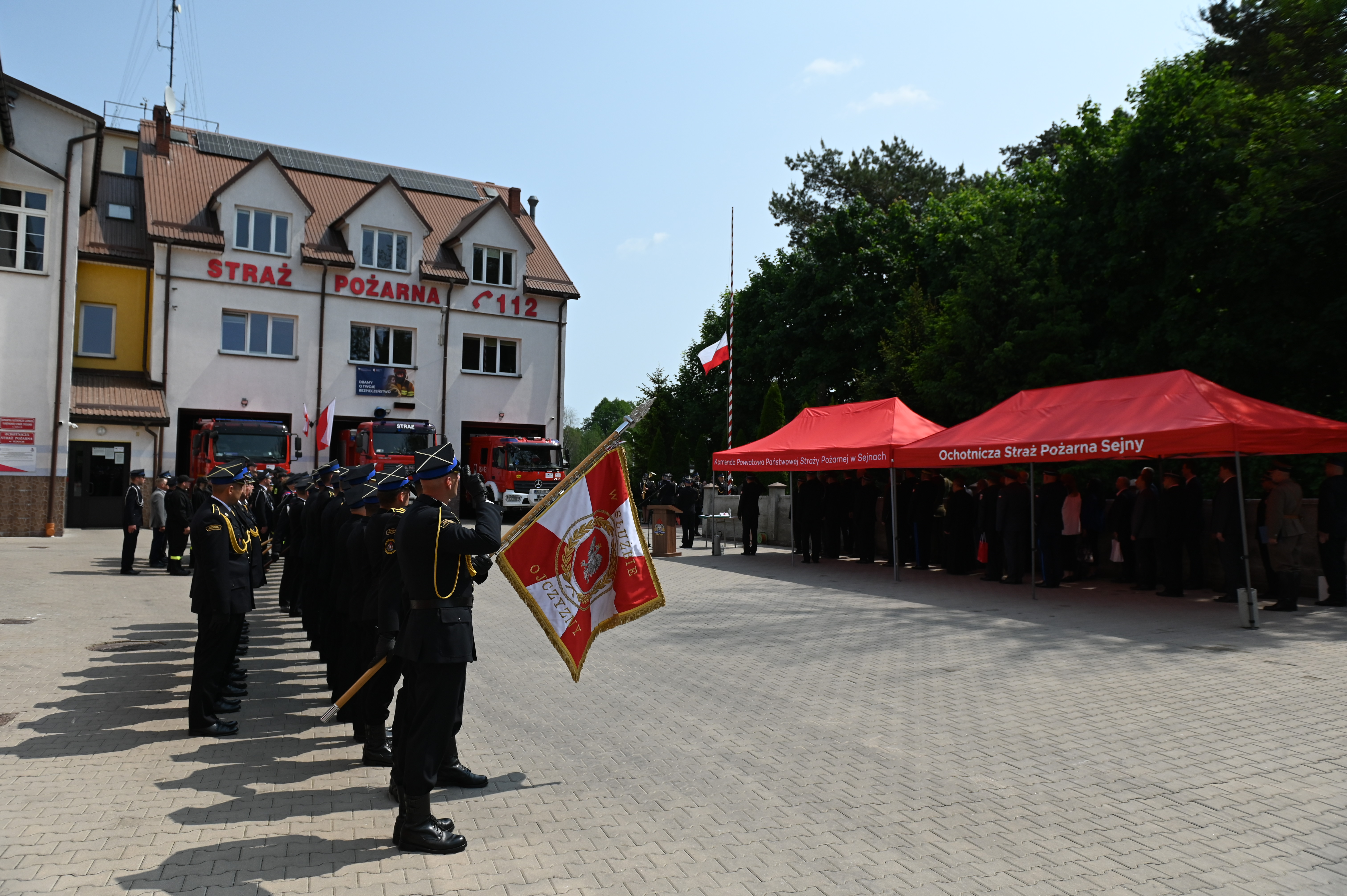 26 maja 2023 roku na placu przed Komendą Powiatową Państwowej Straży Pożarnej w Sejnach odbył się uroczysty apel z okazji powiatowych obchodów Dnia Strażaka.