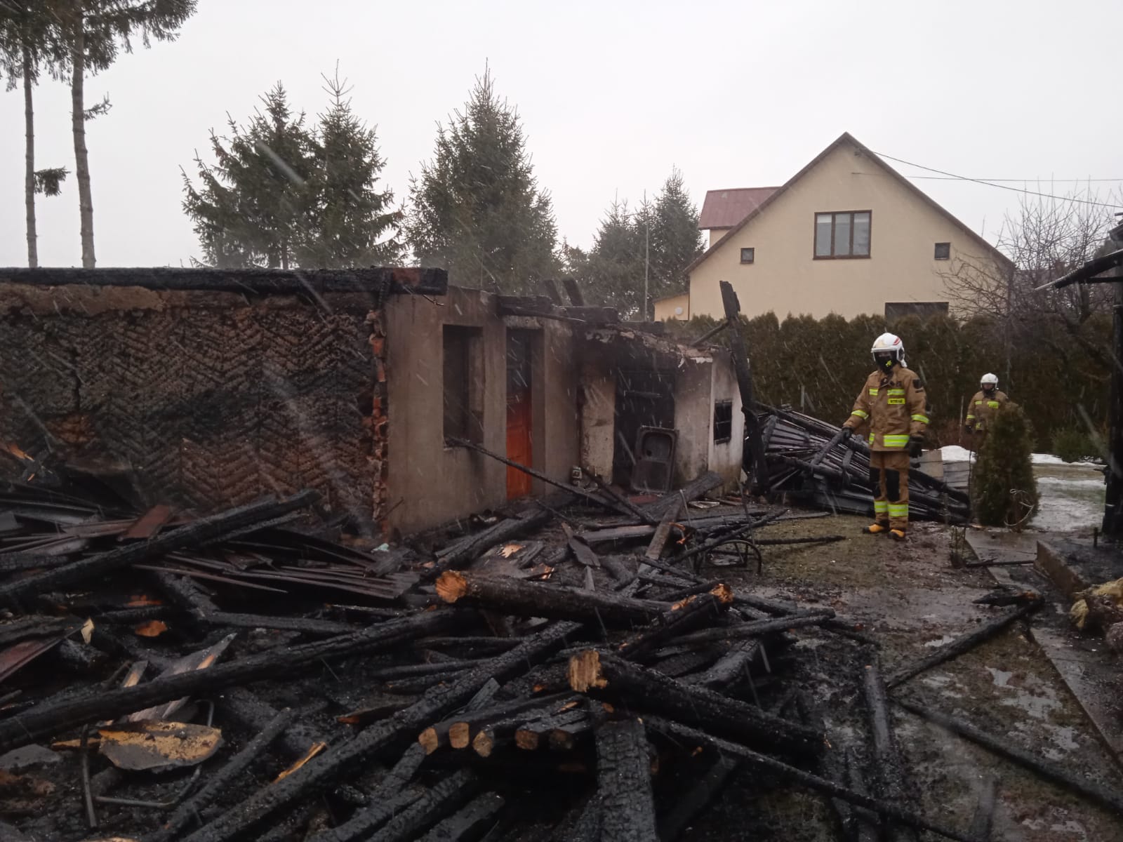 Na miejscu zdarzenia okazało się, że trwa rozwinięty pożar stodoły oraz przyległego budynku gospodarczego. Z powodu zagrożenia rozprzestrzenienia się pożaru na sąsiednie domy jednorodzinne w pierwszej kolejności skupiono się na obronie tych budynków. Po ugaszeniu pożaru przystąpiono do prac rozbiórkowych nadpalonych elementów konstrukcji budynku połączonych