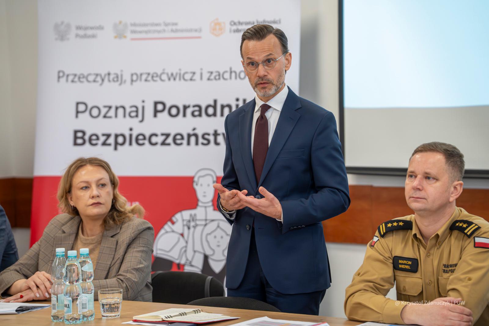 W trakcie swojego wystąpienia mówił o potrzebie wzmocnienia odporności społecznej wśród mieszkańców naszego regionu, skupiając się na kampaniach edukacyjno-informacyjnych realizowanych przez Państwową Straż Pożarną, a także na roli edukacji, nawiązując do Poradnika Bezpieczeństwa.