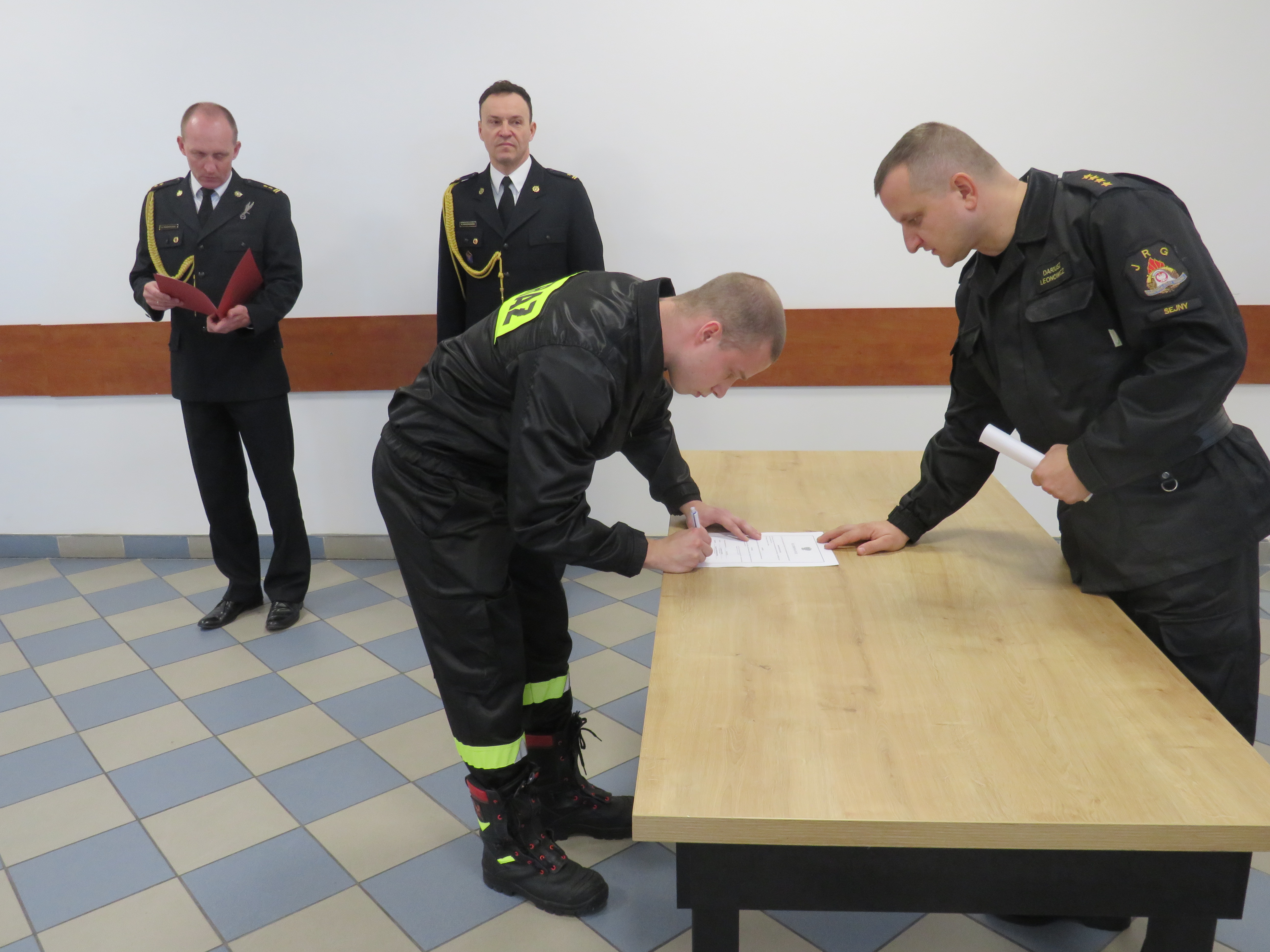 z okazji ślubowania nowo przyjętego strażaka do służby w PSP str Adriana Łejmela. Ślubowanie przyjął Komendant Powiatowy PSP w Sejnach bryg. mgr inż. Artur Przeborowski w obecności zmiany służbowej i funkcjonariuszy komendy. Nowo przyjętego funkcjonariusza czeka trzyletni okres służby przygotowawczej, po odbyciu której nastąpi mianowanie do służby stałej.