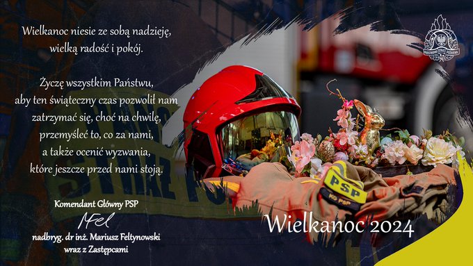 Życzenia Wielkanocne Komendanta Głównego Państwowe Straży Pożarnej 29.03.2024 Zdjęcia (1) Pokaż zdjęcie 1 z galerii.