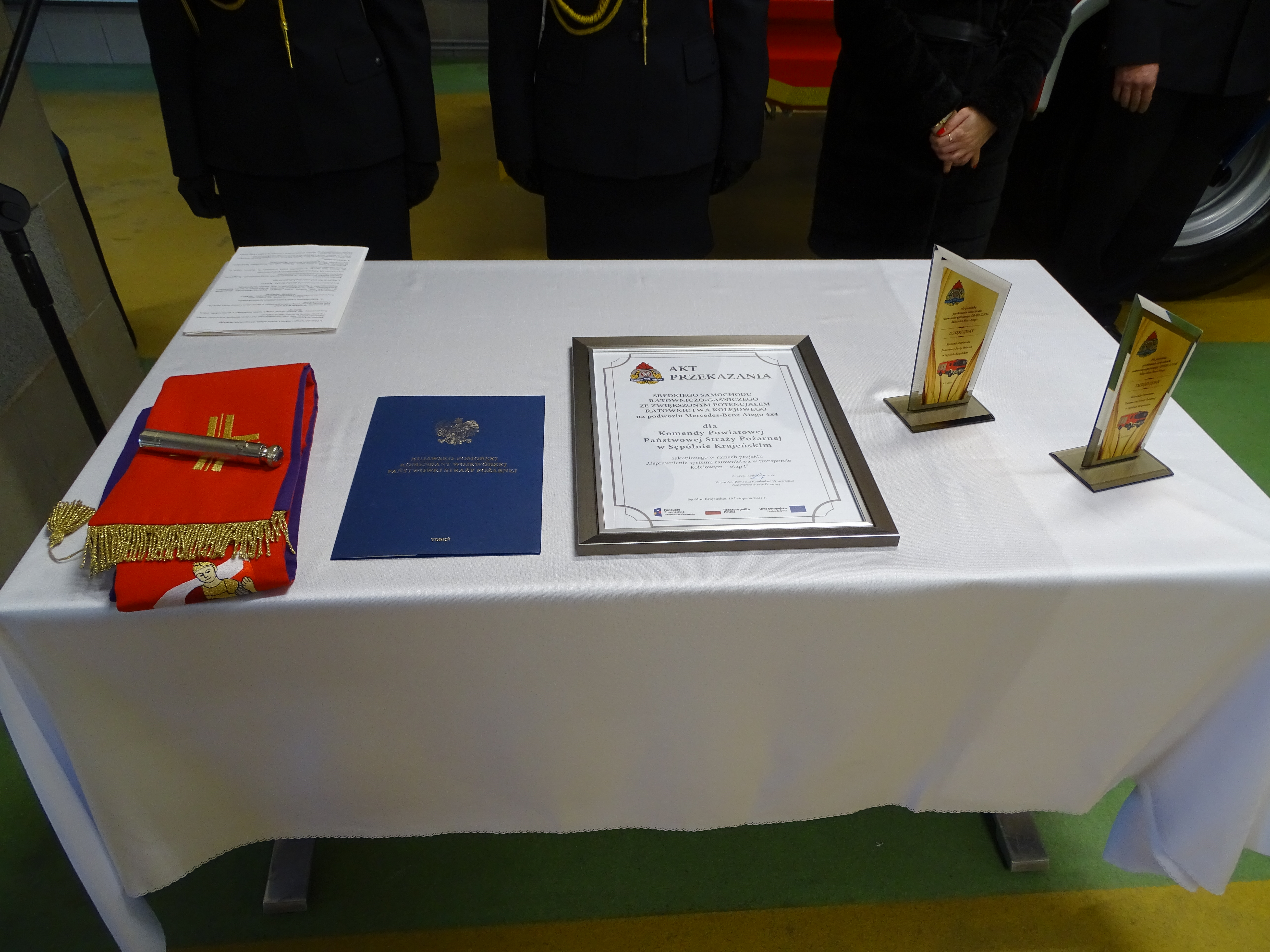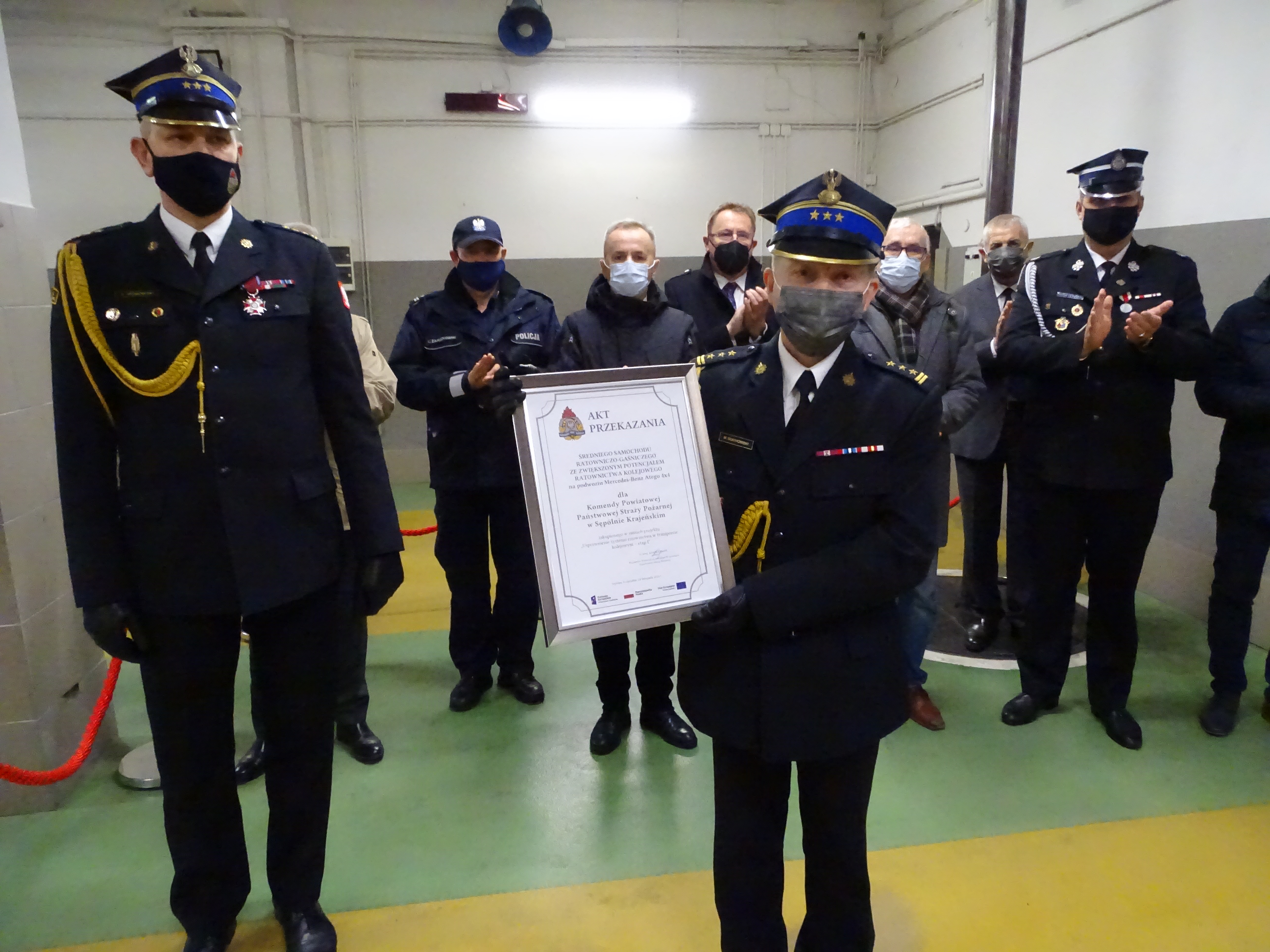 Kolejnym punktem uroczystości było przekazanie i poświęcenie pojazdu pożarniczego GBA 2,5/16, Mercedes Atego. Samochód został zakupiony w ramach projektu unijnego „Usprawnienie systemu ratownictwa w transporcie kolejowym – etap I”. Pojazd posiada zbiornik wody o pojemności 2500 litrów, zbiornik środka pianotwórczego, autopompę dwuzakresową A16/8-2,5/40, działko wodno-pianowe, linię szybkiego natarcia, instalację zraszaczową, maszt oświetleniowy. Ponadto pojazd wyposażony jest w nowoczesny sprzęt taki jak: aparaty powietrzne z sygnalizatorami bezruchu, motopompę pływająca, pompę zanurzeniową elektryczną, drabiny, sprzęt hydrauliczny i pneumatyczny, pilarkę łańcuchowa, piłę tarczową, wentylator oddymiający, sprzęt burzący, agregat prądotwórczy, dyski ostrzegawcze, kamerę termowizyjna, sprzęt pomiarowy.