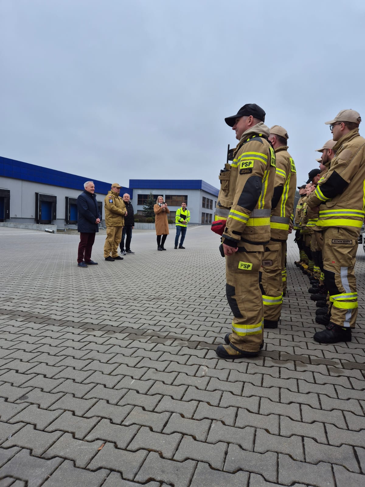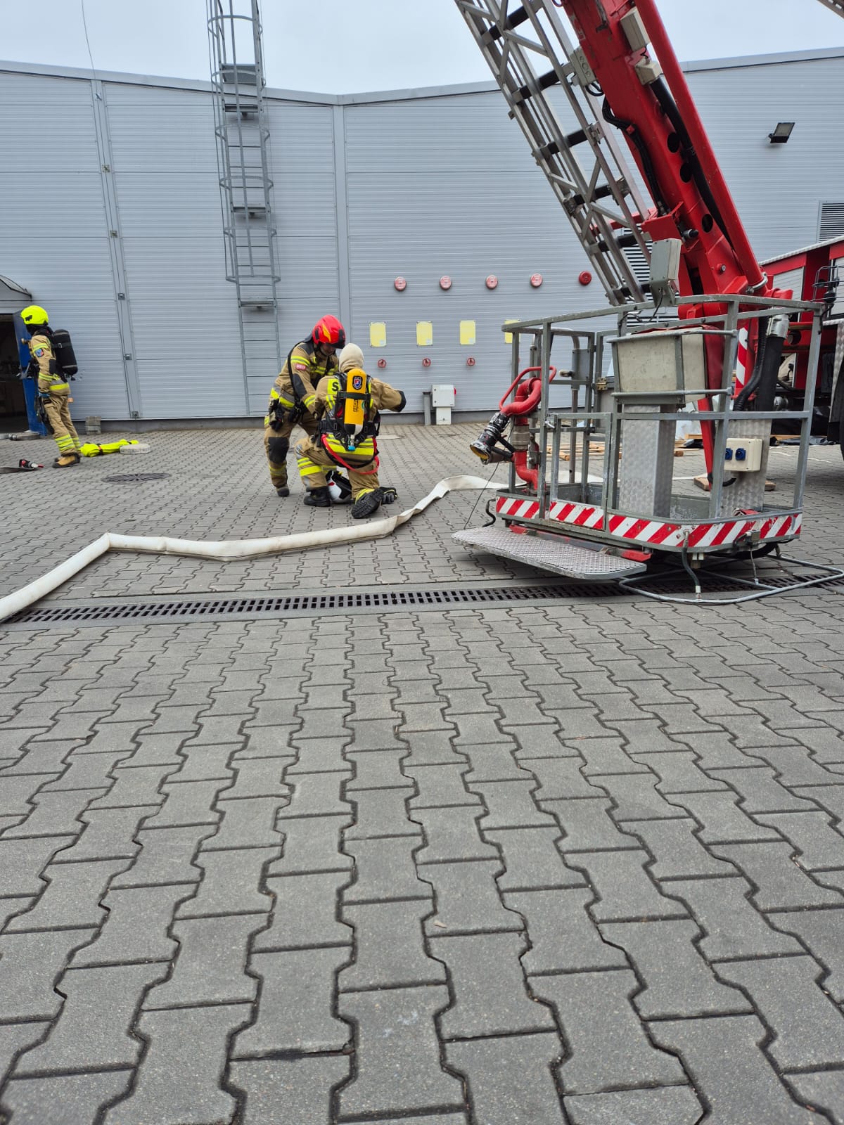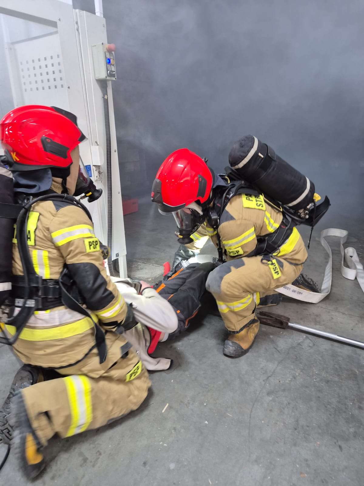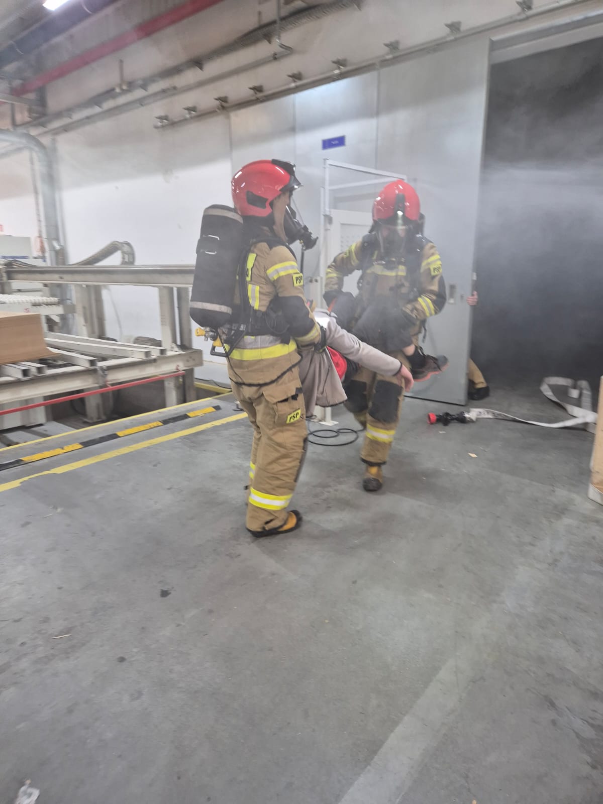Pożar powstał w jednym z pomieszczeń wewnątrz hali produkcyjno-magazynowej firmy "Gabi-Bis". Kierownik hali chcąc ugasić pożar za pomocą gaśnicy, wszedł do pomieszczenia. Prawdopodobnie poprzez przebywanie w silnie zadymionym pomieszczeniu bez sprzętu ochrony układu oddechowego, stracił przytomność i nie wyszedł z budynku. Pozostali pracownicy zostali ewakuowali przez personel zakładu. Osoba odpowiedzialna, za jej realizację informuje KDR, že wśród ewakuowanych brakuje jednego z pracowników. Zasilanie obiektu w energię elektryczną zostało odłączone przez dozorcę przed przyjazdem zastępów straży. Wewnątrz magazynu z klejem, w którym doszło do požaru panuje silne zadymienie. Pożar zaczyna rozprzestrzeniać się wewnątrz hali. Następuje silne nagrzanie się elementów stalowych, elementy nośne zaczynają się odkształcać co powoduje częściowe zawalenie się obiektu. Pożar wydostaje się na zewnątrz. Przybywające na miejsce siły i środki zostają wprowadzane do działań. Kierujący działaniami ratowniczymi wydaje decyzję o zbudowaniu linii zasilających wykorzystując zbiorniki p.poż znajdujące się na terenie zakładu.