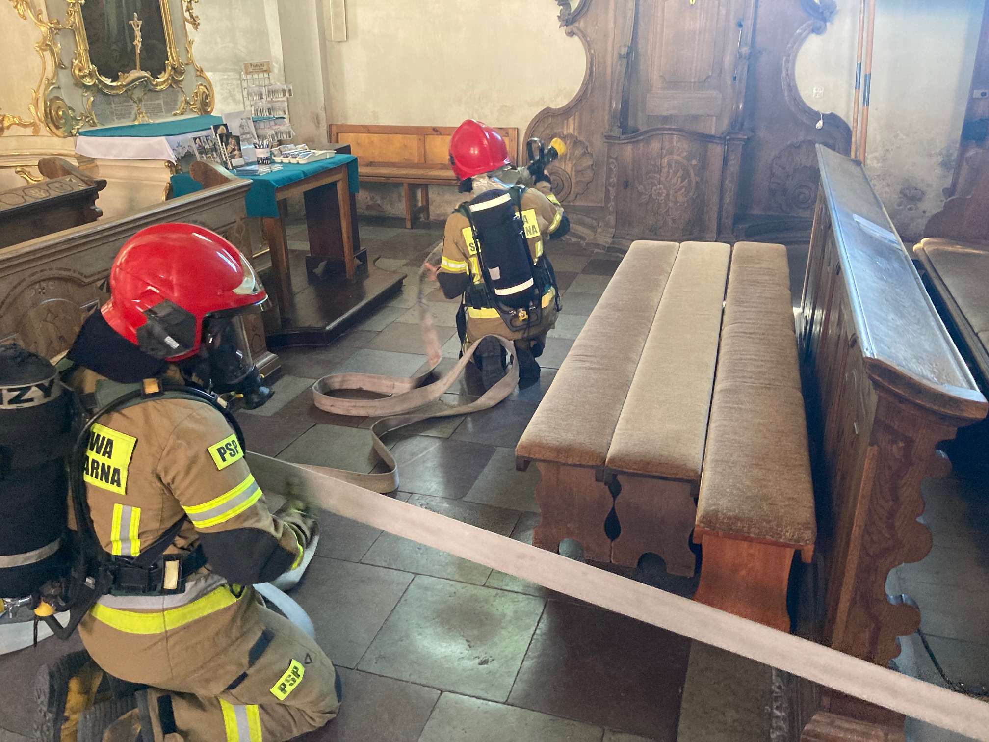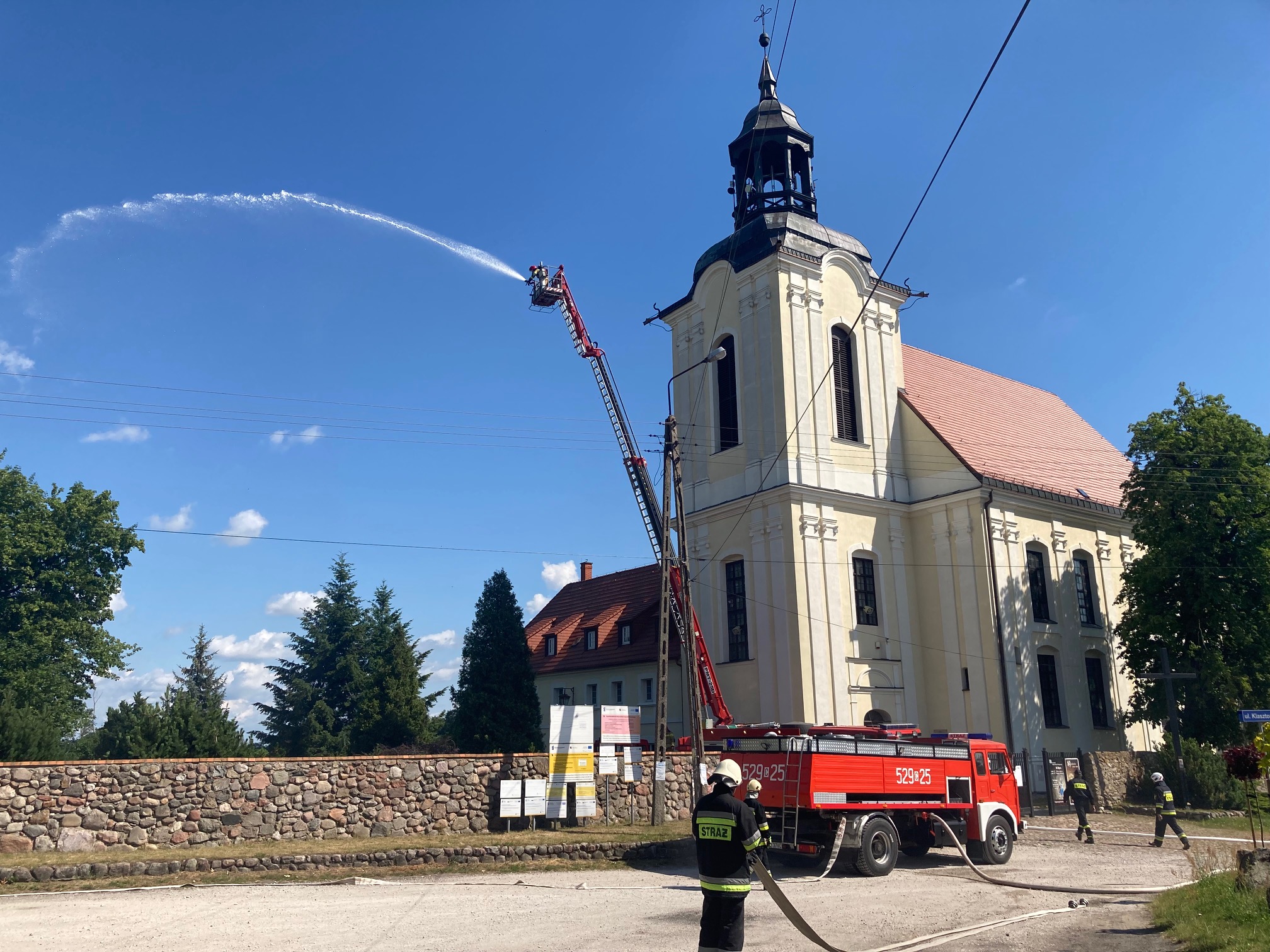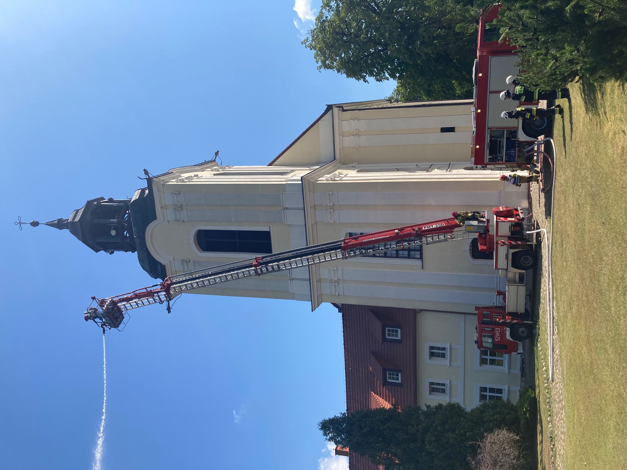 W dniu 05 lipca 2022 roku w obiekcie kościoła w Zamartem w ramach ćwiczeń obiektowych zostały przeprowadzone manewry dla części jednostek OSP z gminy Kamień Krajeńskie oraz dla jednostek z Komendy Powiatowej Państwowej Straży Pożarnej w Sępólnie Krajeńskim. Głównym celem ćwiczeń było zapewnienie ciągłości podawania wody przez prądownicę wodną umieszczoną w koszu podnośnika hydraulicznego oraz podanie dwóch prądów wody w natarciu na wieżę kościoła i do wewnątrz. Strażacy po zakończonych ćwiczeniach mieli możliwość zapoznania się ze specyfiką obiektu, rozkładem dróg dojazdowych oraz rozmieszczeniem pomieszczeń klasztoru i kościoła, a także zastosowanymi w obiekcie urządzeniami i instalacjami przeciwpożarowymi.