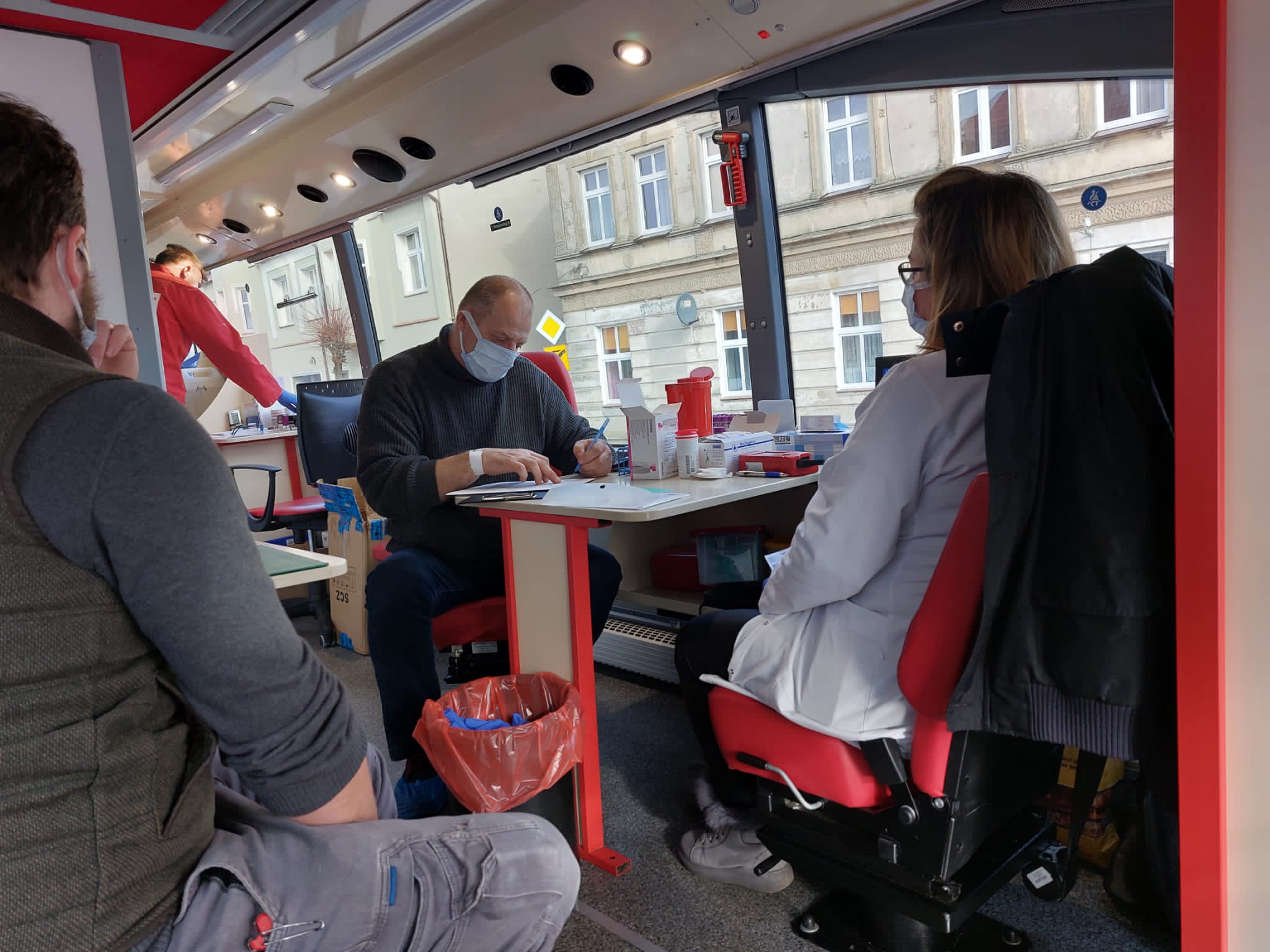 Pracownicy Regionalnego Centrum Krwiodawstwa i Krwiolecznictwa z Bydgoszczy przyjmowali krwiodawców oraz kandydatów na dawców szpiku kostnego. Zespół medyczny zajmował się rejestracją kandydatów oraz poborem próbek krwi do badań. Akcja spotkała się z dużym zainteresowaniem, bo łącznie 48 osób tego dnia odwiedziły nas, by oddać krew lub próbki krwi do badań na dawcę szpiku kostnego. Każda osoba, która oddała krew otrzymała paczkę ze słodyczami oraz czerwone parasolki. Na chętnych czekały też przygotowane przez strażaków ciepłe napoje oraz coś słodkiego.
