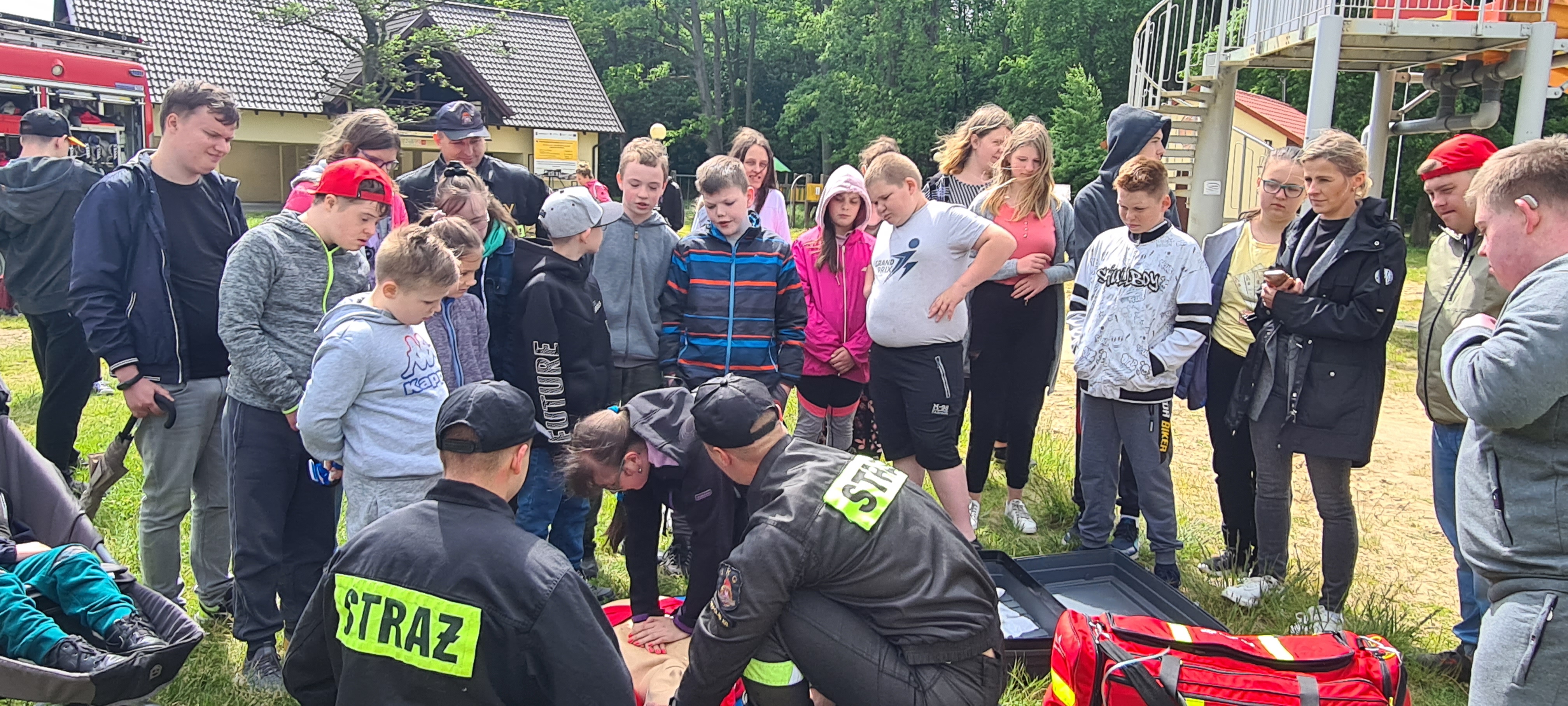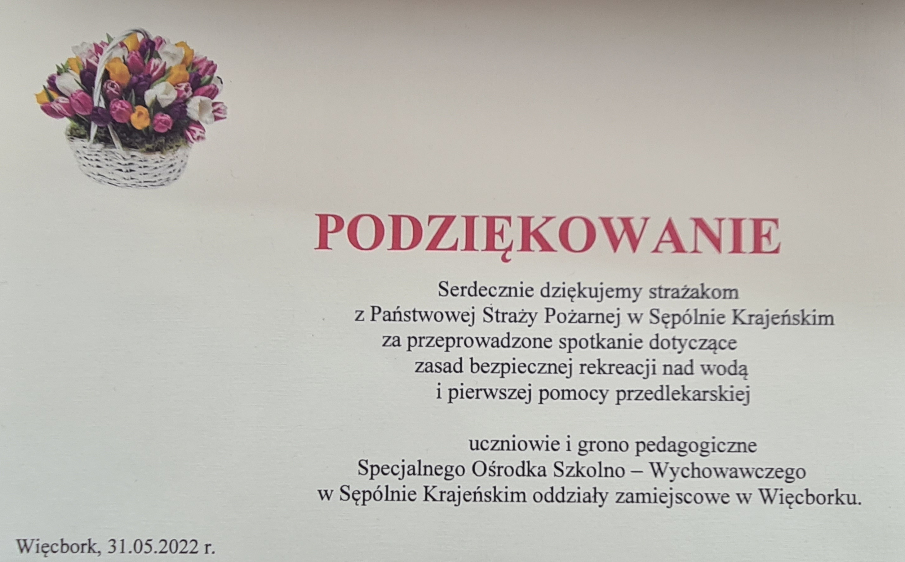 W dniu 31 maja 2022 roku funkcjonariusze z Komendy Powiatowej PSP w Sępólnie Krajeńskim wraz z ratownikami OSP Więcbork przeprowadzili pokazy ratownictwa wodnego dla dzieci ze Specjalnego Ośrodka Szkolno-Wychowawczego w Więcborku w ramach programu Szkoła Przyjazna Wodzie "Aktywni Błękitni". Idea akcji związana jest podniesieniem świadomości dzieci i młodzieży podczas zdarzeń na akwenach wodnych. Podczas spotkania omówione zostały tematy bezpiecznego wypoczynku nad wodą zarówno w lecie jak i w okresie zimowym. Dzieci w sposób praktyczny mogły zapoznać się z zasadami udzielania pierwszej pomocy osobom podtopionym. W pokazach udział wzięło 43 wychowanków oraz 8 wychowawców.
