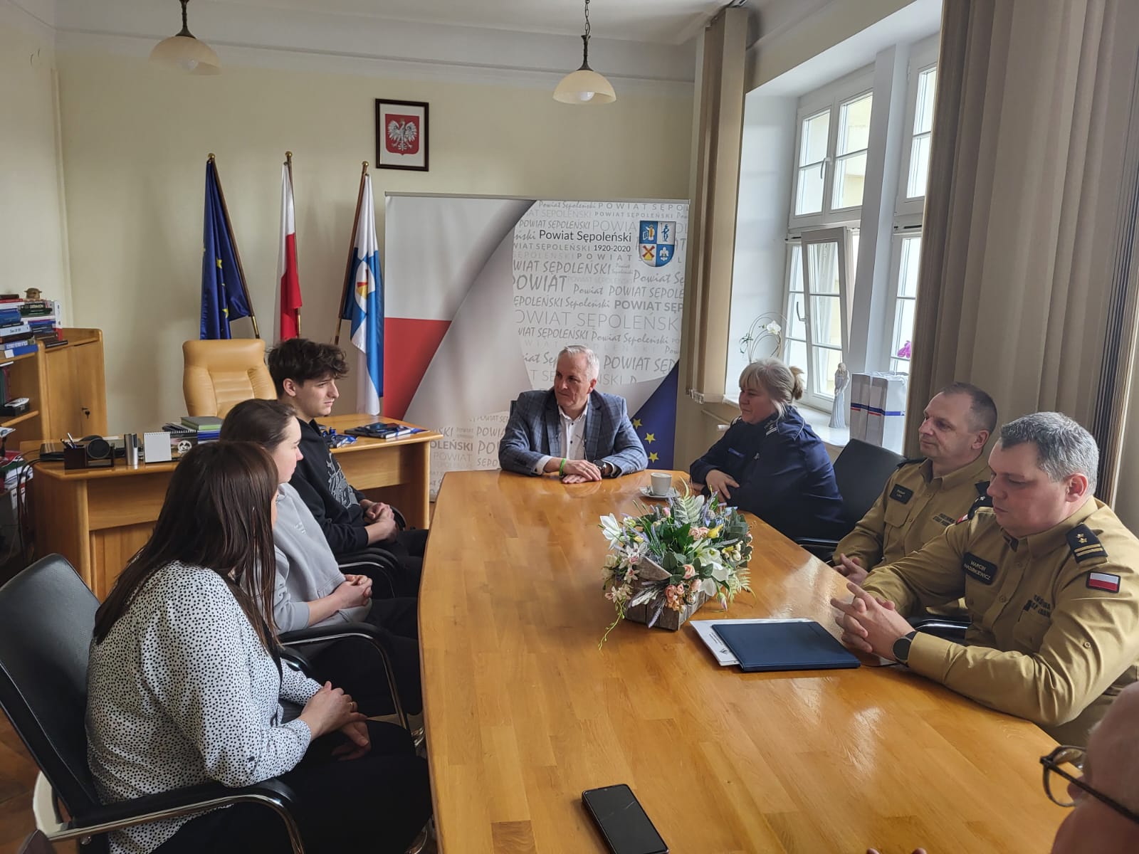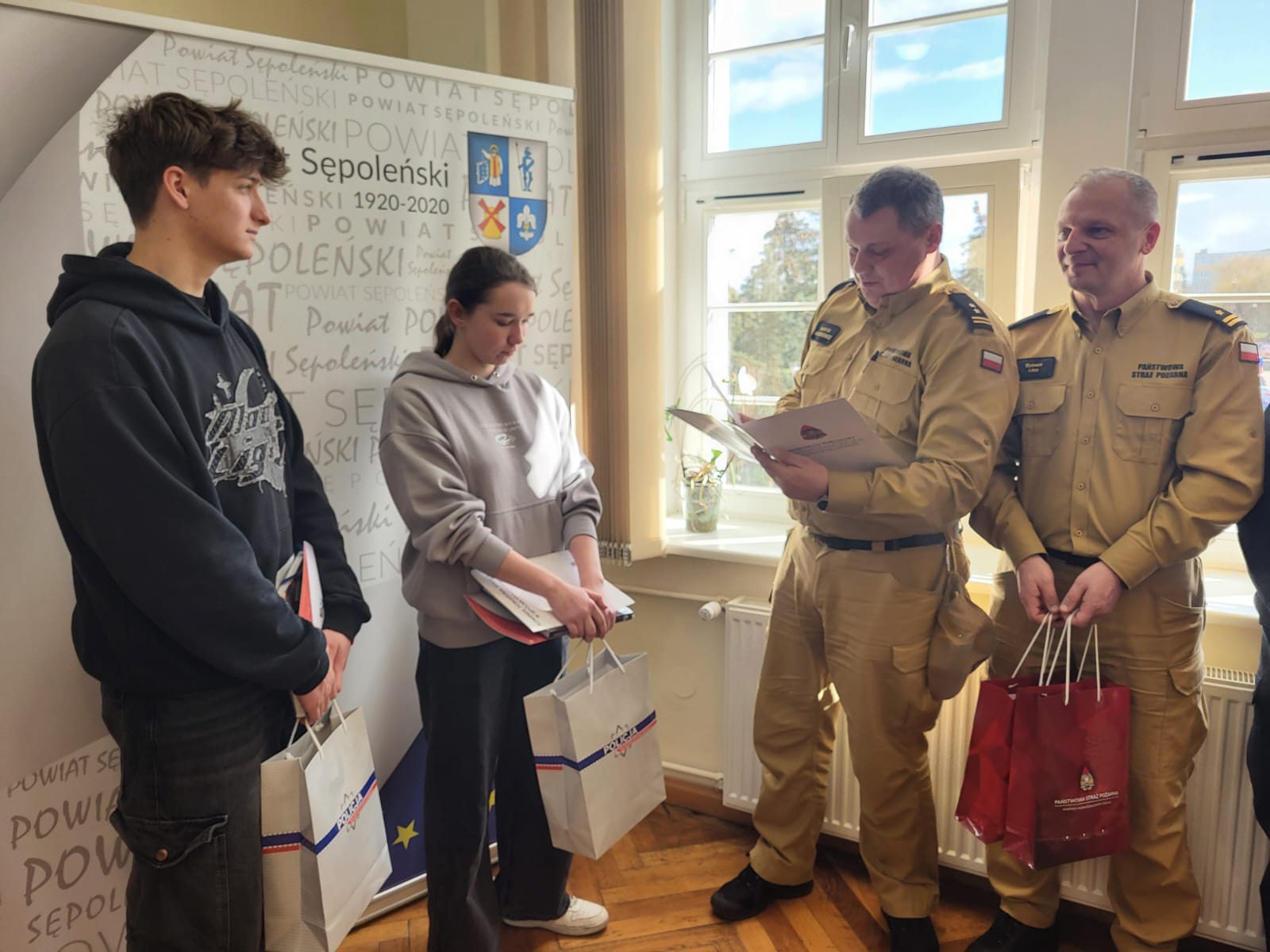 W dniu 17 marca 2025 roku w gabinecie Starosty sępoleńskiego Pana Jarosława Tadycha odbyła się uroczystość wręczenia dyplomów uznania i upominków dla dwójki młodych bohaterów: Martyny Stępień i Jakuba Wardyna, którzy w dniu 3 marca wracając z treningu MLKS Krajna w Sępólnie Kraj., uratowali życie mężczyzny, który wpadł do wody. Za godną podziwu postawę, empatię i gotowość do udzielenia pomocy innym w sytuacjach kryzysowych podziękowania dla młodych bohaterów i ich rodziców złożyli: