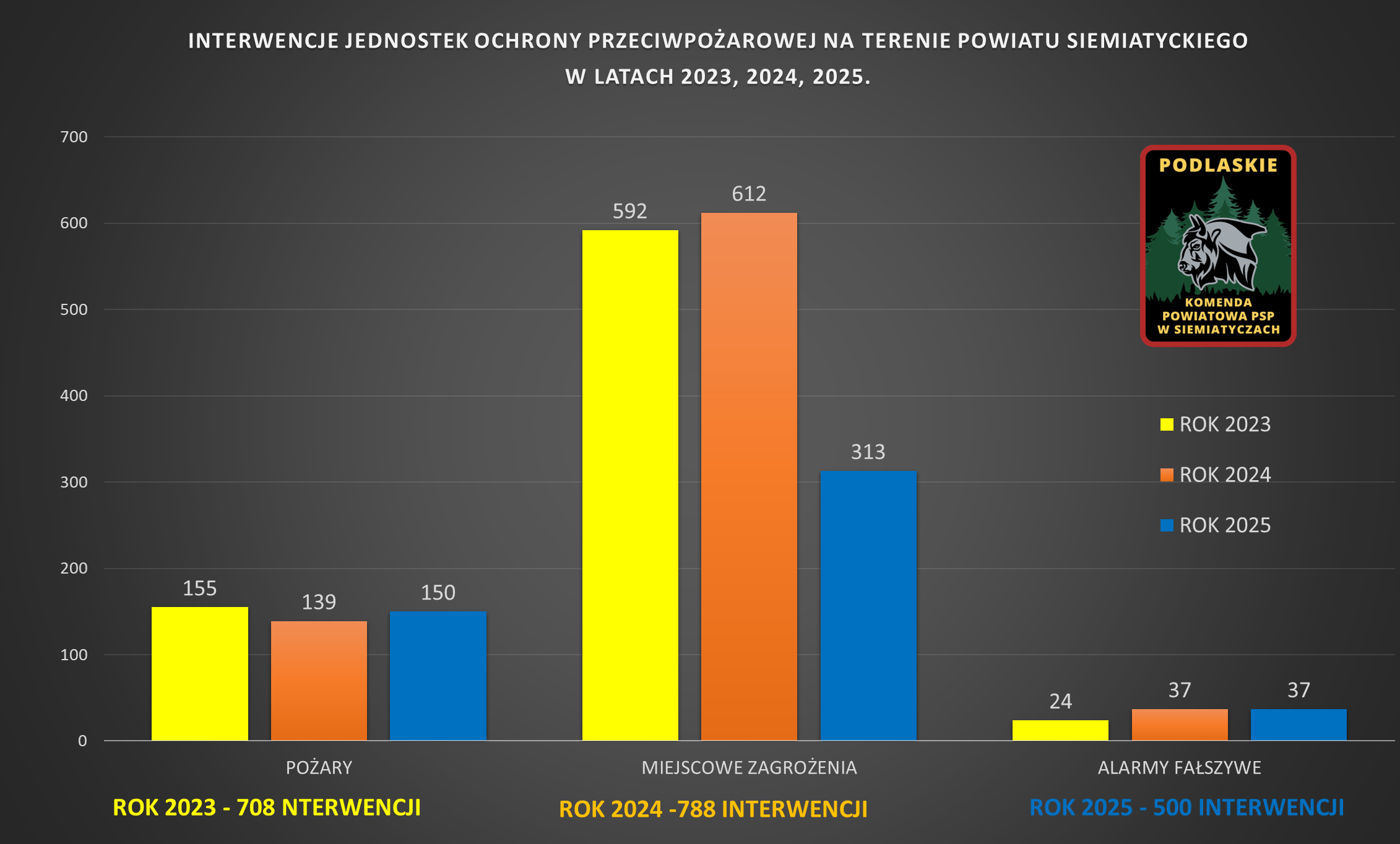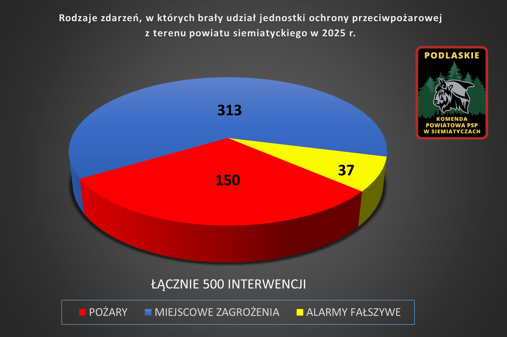 W 2025 roku na terenie powiatu siemiatyckiego odnotowano łącznie 500 zdarzeń, co oznacza spadek liczby interwencji o 36,5% w stosunku do roku 2024.