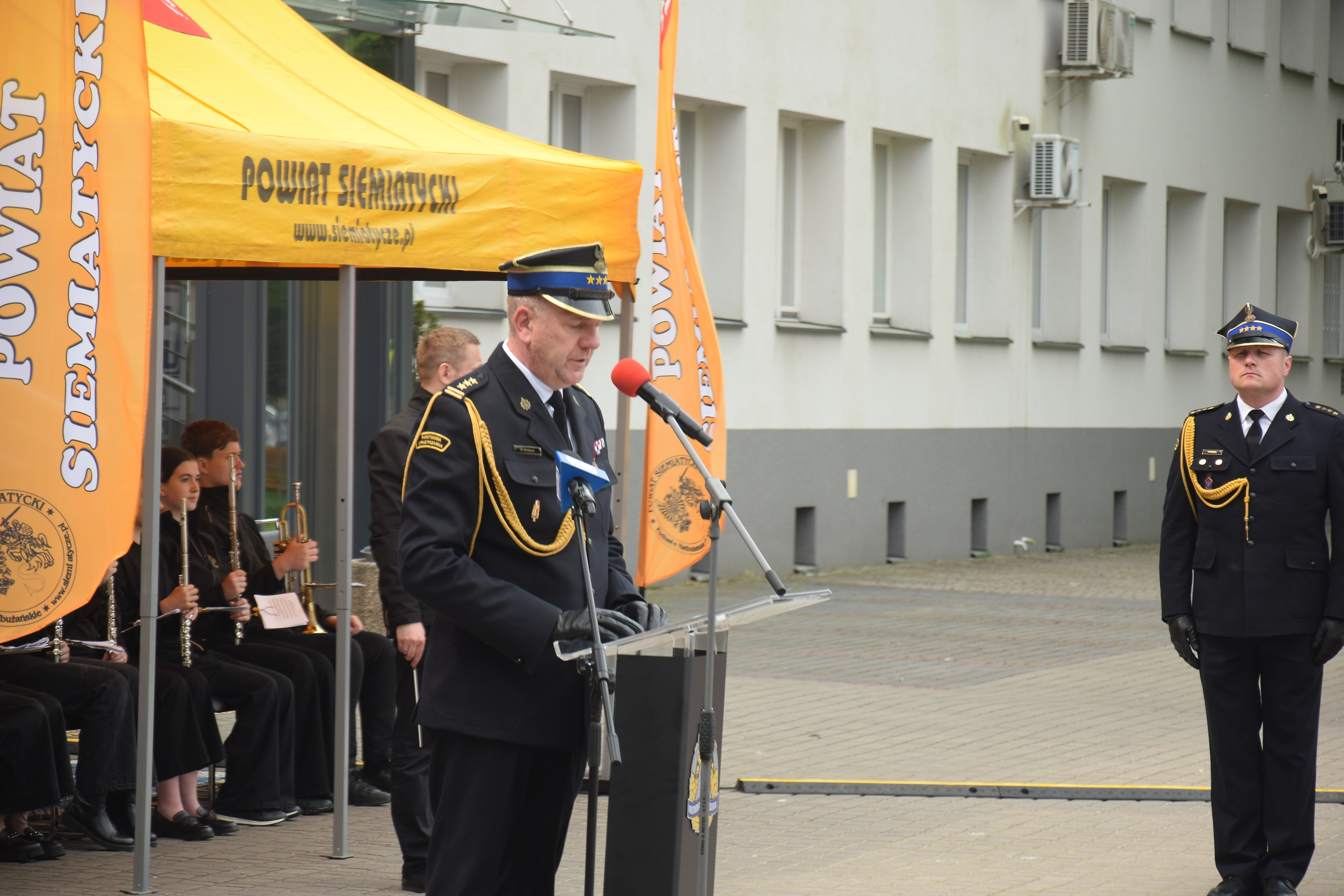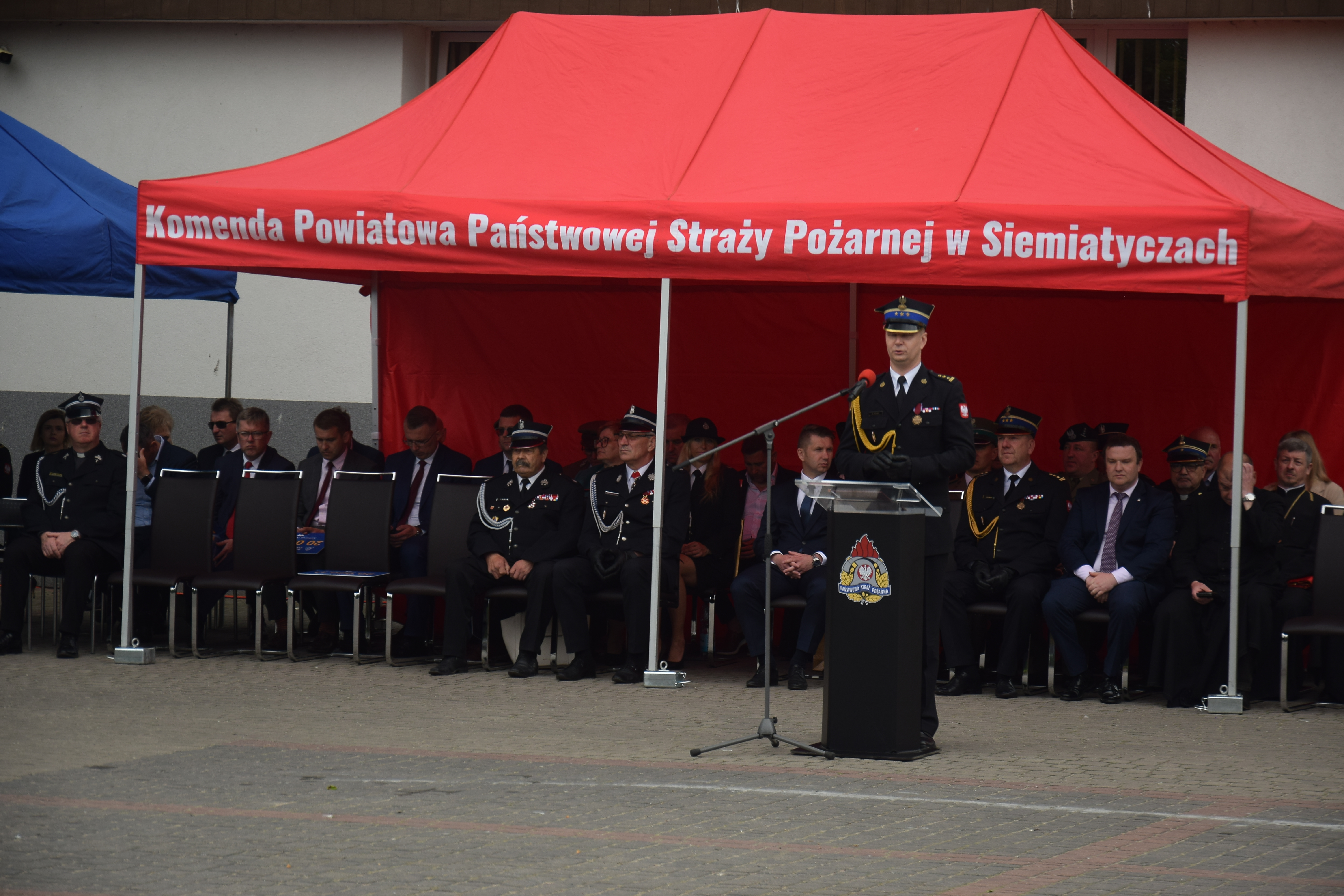 Gospodarz wydarzenia, st. bryg. Piotr Rybak - Komendant Powiatowy PSP w Siemiatyczach, przywitał przybyłych gości i wygłosił okolicznościowe przemówienie, podczas którego podziękował funkcjonariuszom i druhom za dobrą współpracę i codzienne poświęcenie.