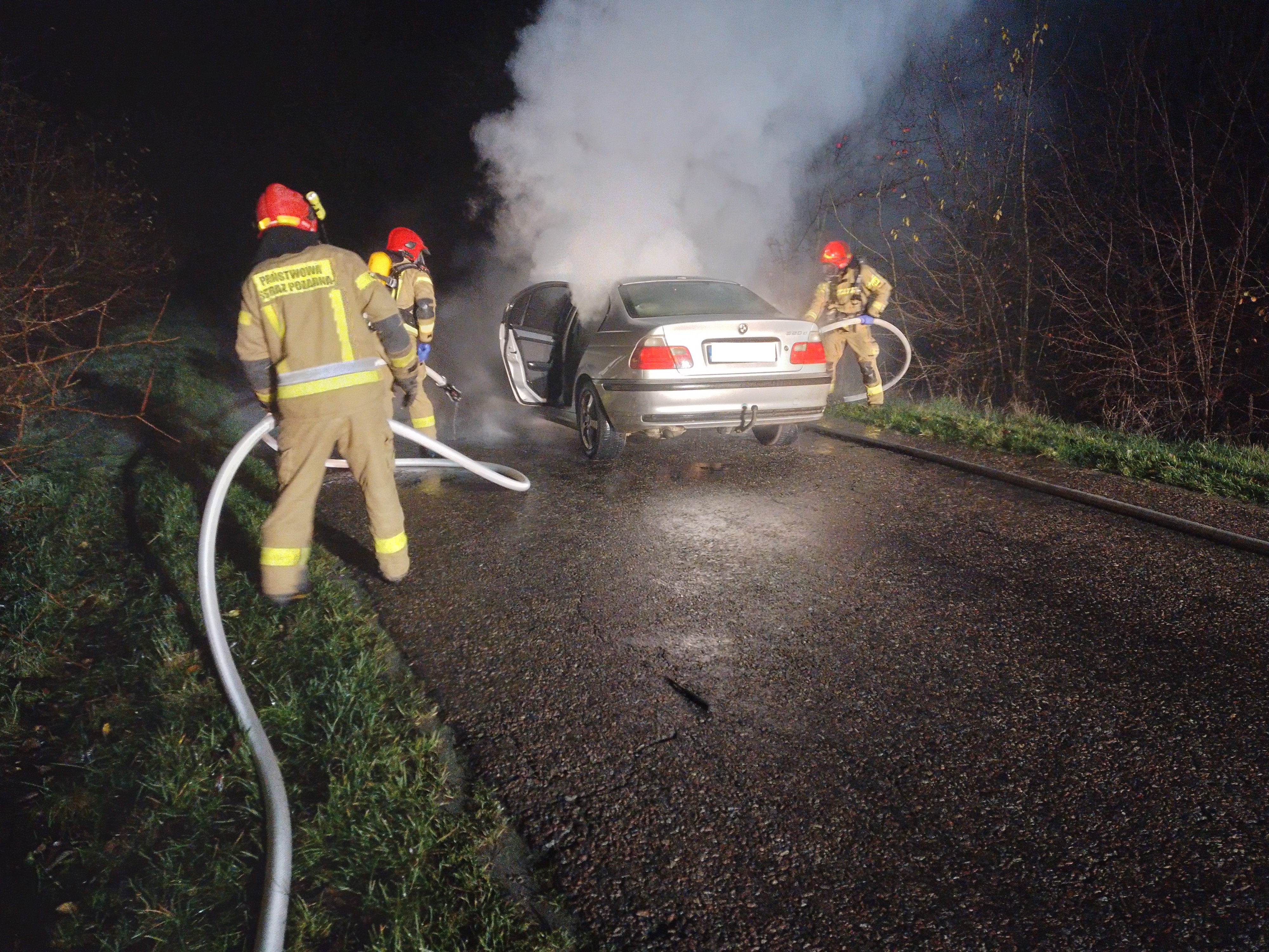 11 listopada około godziny 200 do Stanowiska Kierowania Komendanta Powiatowego PSP w Siemiatyczach wpłynęła informacja o pożarze samochodu osobowego na trasie Miłkowice Maćki- Ostrożany. Do zdarzenia została zadysponowana JRG Siemiatycze oraz jednostka OSP Lisowo. Na miejscu strażacy zastali rozwinięty pożar samochodu osobowego marki BMW. Obecny na miejscu zdarzenia kierowca pojazdu nie odniósł żadnych obrażeń.