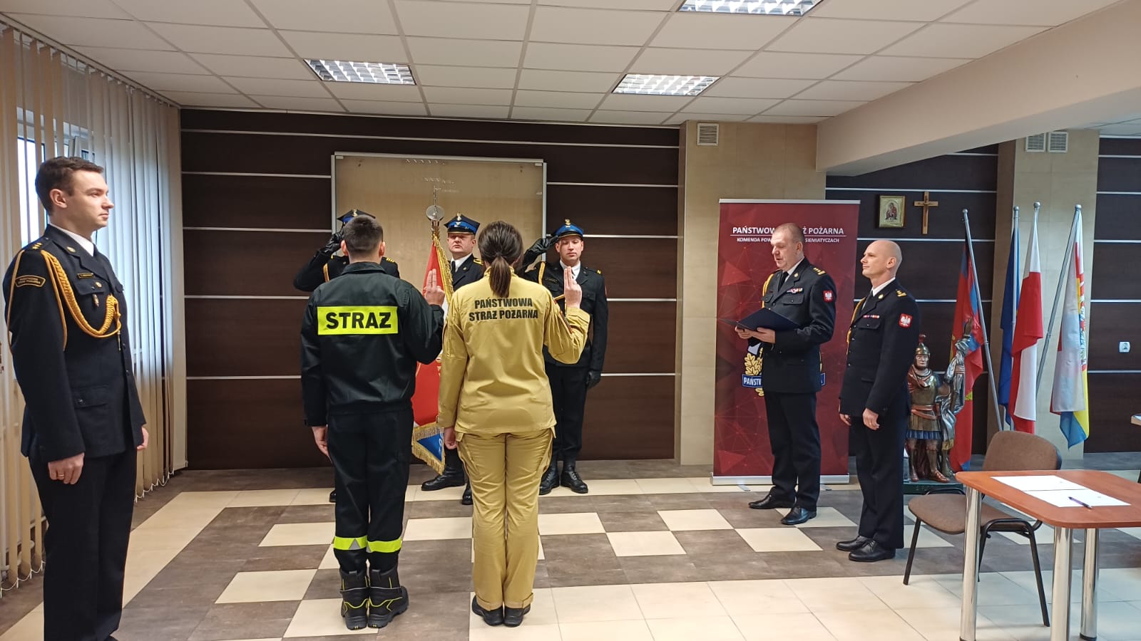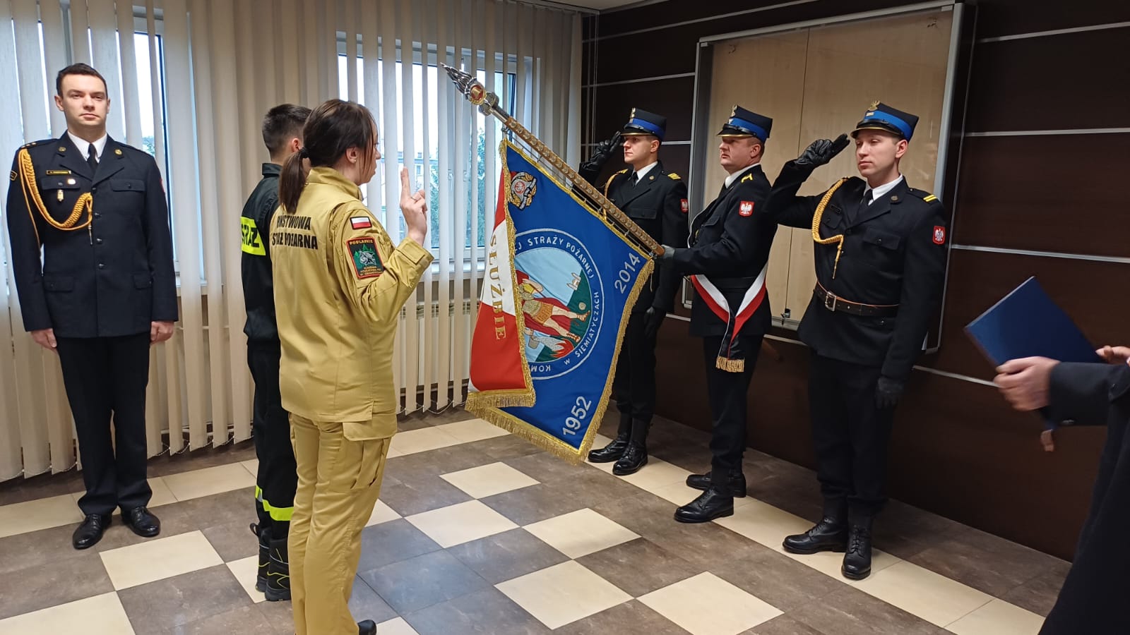 Podczas uroczystej zbiórki ślubowanie na sztandar Państwowej Straży Pożarnej złożyli dwaj nowo przyjęci funkcjonariusze: str. Sylwia Jachimczuk oraz str. Daniel Strus.
