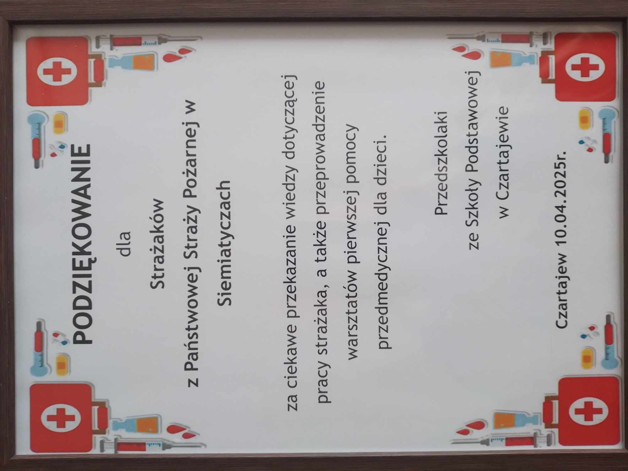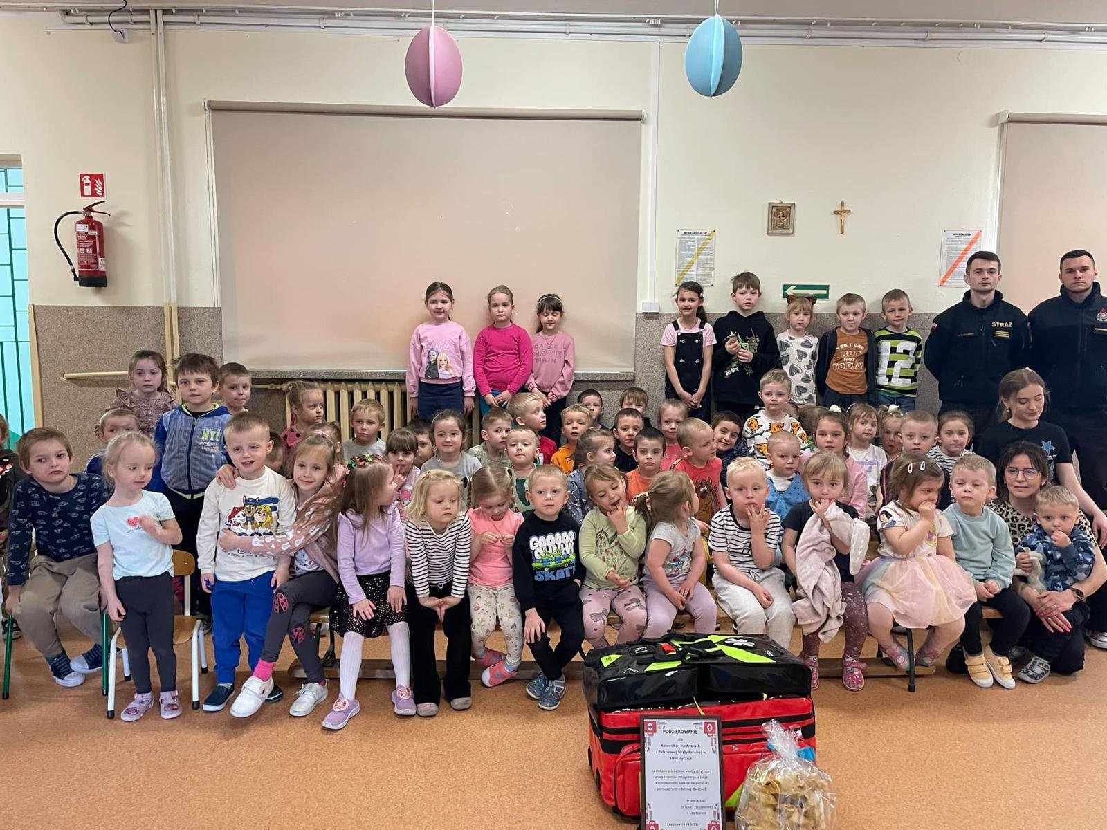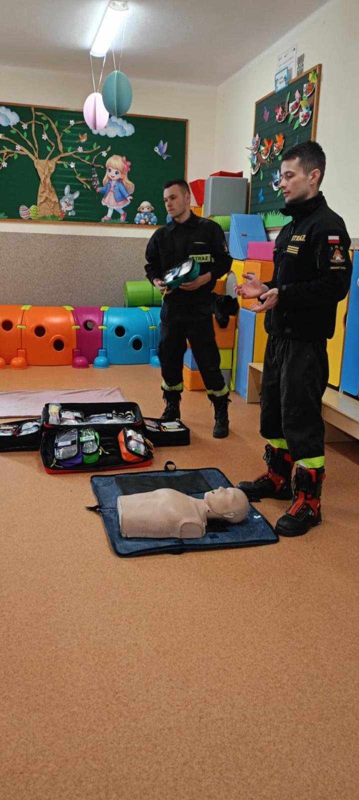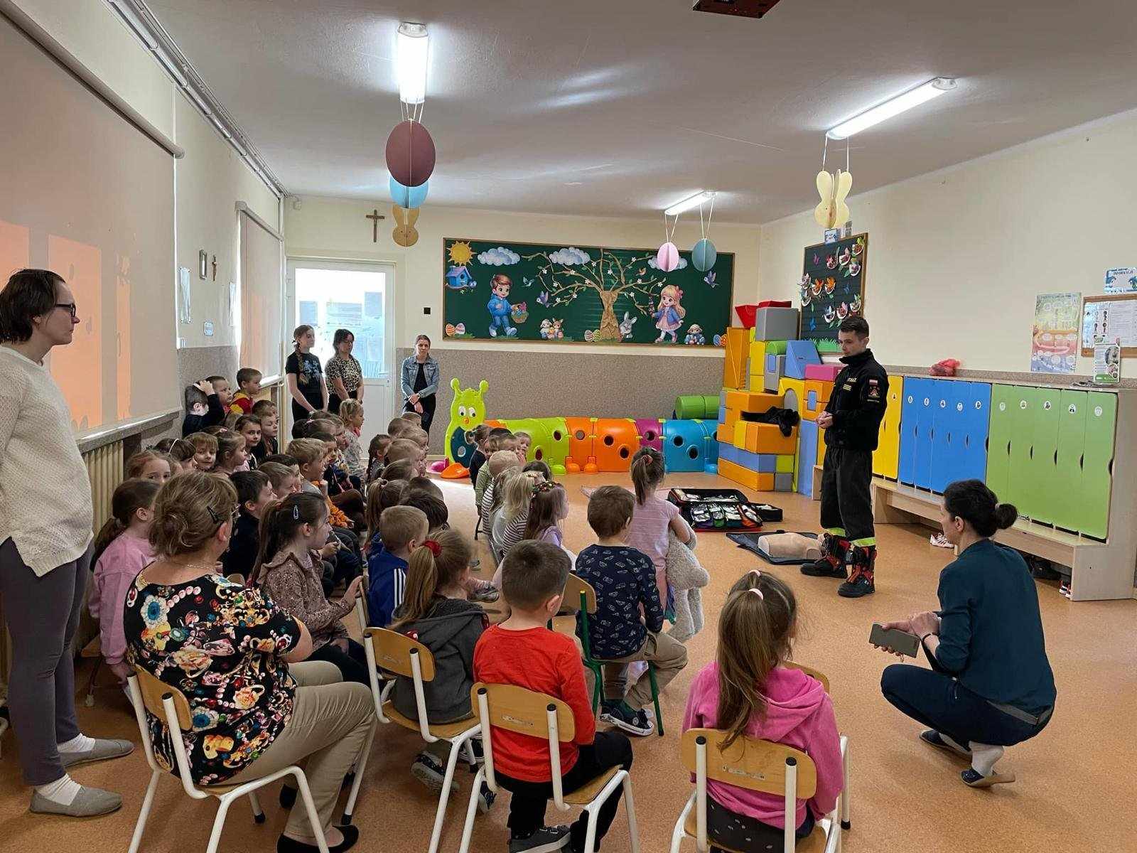 Strażacy z naszej jednostki bardzo chętnie dzielą się posiadaną wiedzą, szczególnie tą, która może komuś uratować życie. Takie spotkanie, w czasie którego funkcjonariusze Komendy Powiatowej PSP w Siemiatyczach przeprowadzili instruktaż z zakresu udzielania pierwszej pomocy, miało miejsce 10 kwietnia br. w oddziale przedszkolnym przy Szkole Podstawowej w Czartajewie. Przedszkolaki zostały poinstruowane w jaki sposób mogą powiadomić służby ratownicze, jak sprawdzić czynności życiowe oraz jak przeprowadzić resuscytację krążeniowo-oddechową.