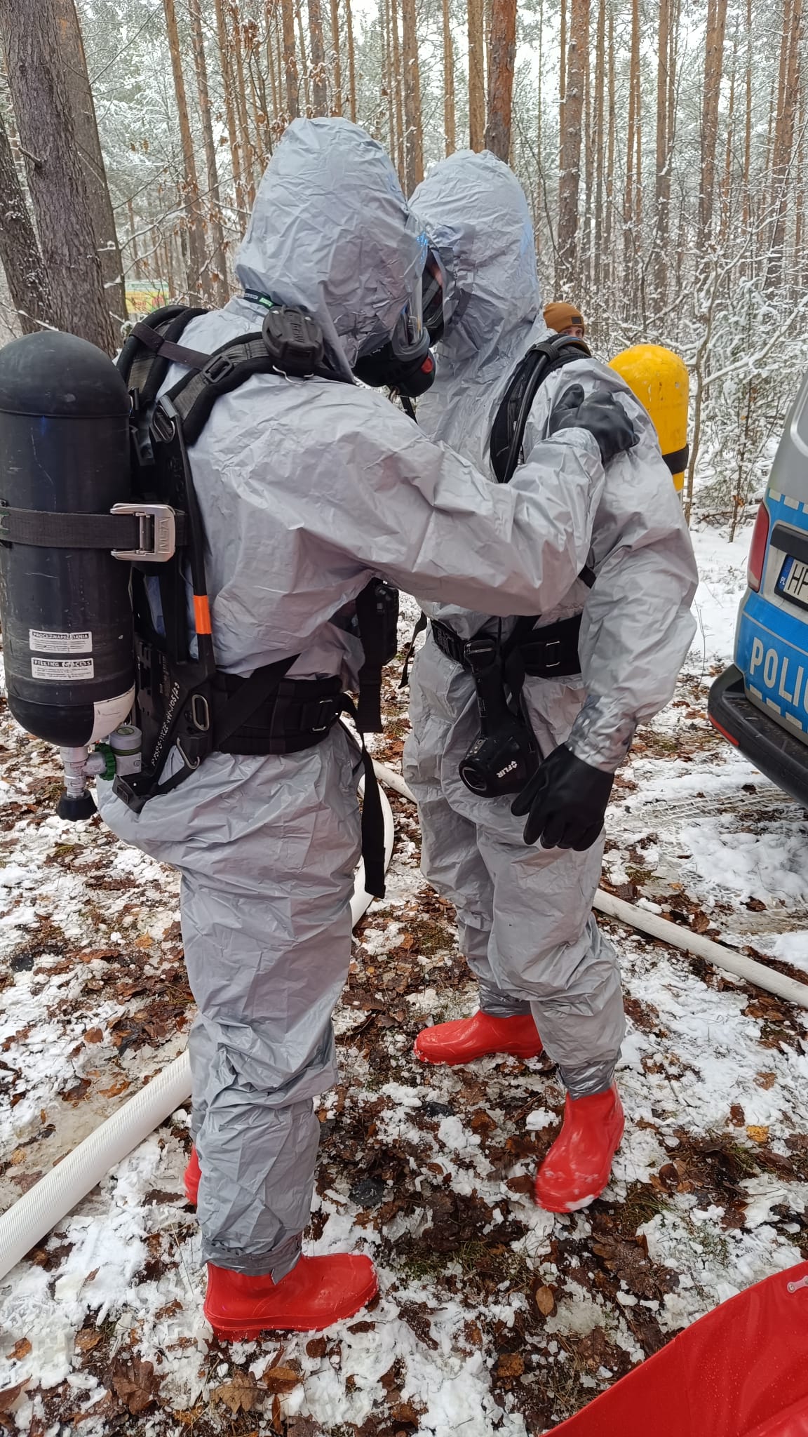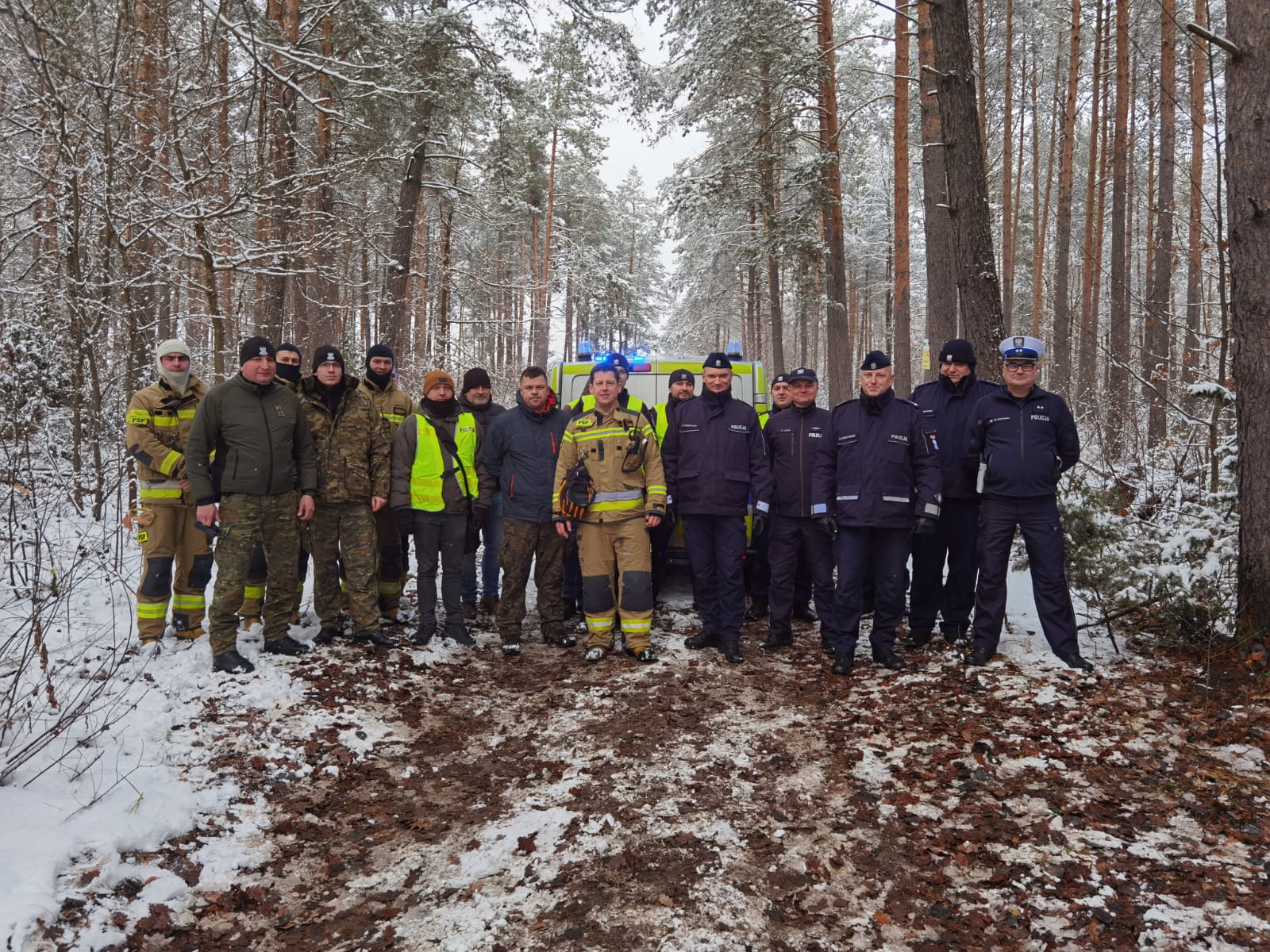 Podczas gdy Policja prowadziła poszukiwania podejrzanego mężczyzny, strażacy wykonali wstępną ocenę zagrożenia chemicznego, zabezpieczając teren oraz analizując pozostawiony pojemnik. Straż Graniczna wykorzystała drona do obserwacji terenu i wsparcia działań poszukiwawczych. Po blisko godzinie intensywnych działań w zaroślach odnaleziono poszukiwanego mężczyznę, przy którym ujawniono m.in. mapy lokalnej infrastruktury, co dodatkowo podniosło rangę zagrożenia w symulowanym zdarzeniu.