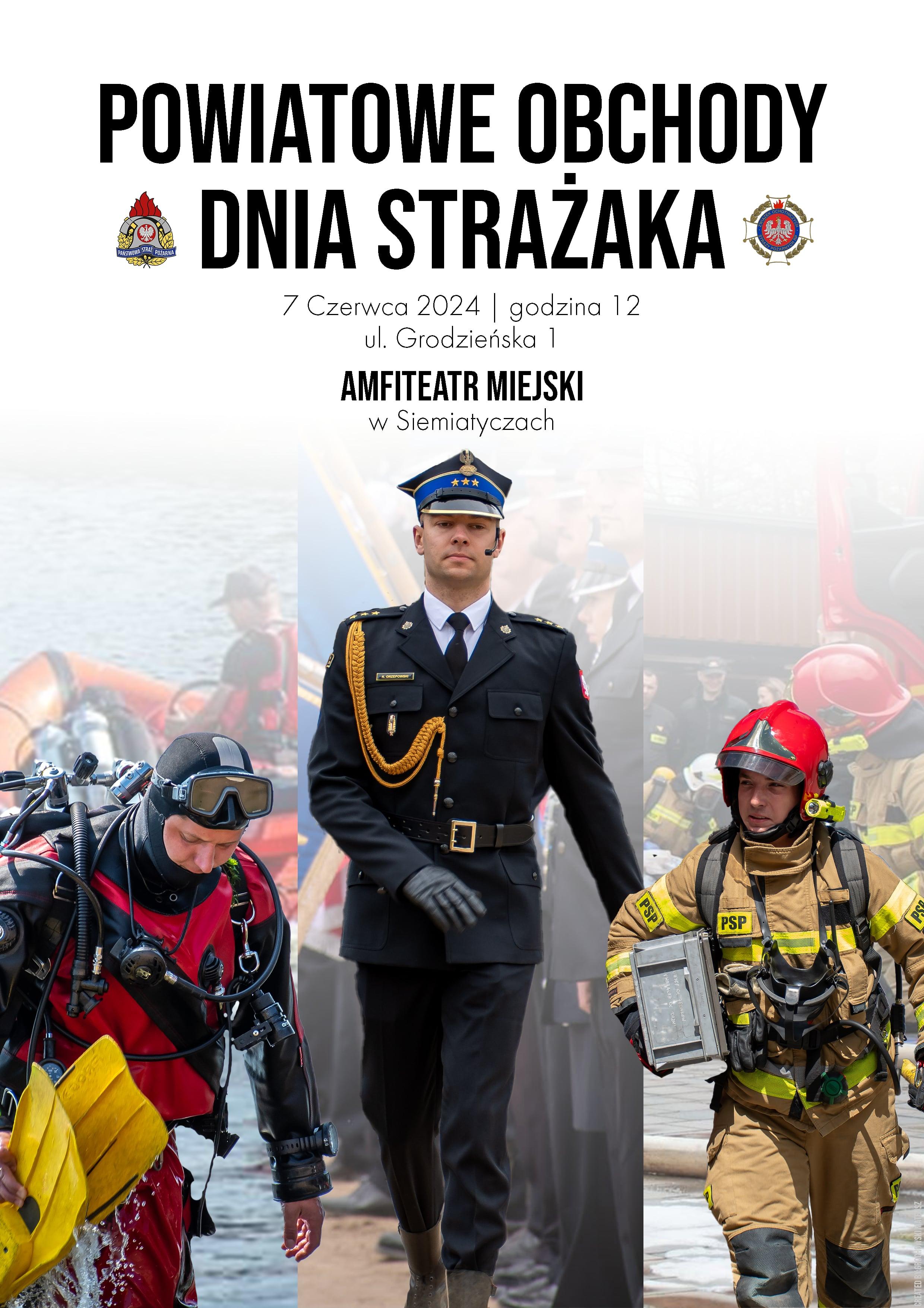 Komendant Powiatowy PSP w Siemiatyczach oraz Prezes Zarządu Oddziału Powiatowego OSP RP w Siemiatyczach serdecznie zapraszają na Powiatowe Obchody Dnia Strażaka, które odbędą się 07 czerwca 2024 roku o godzinie 12:00 przy ul. Grodzieńskiej 1 w Siemiatyczach (plac przy amfiteatrze miejskim).